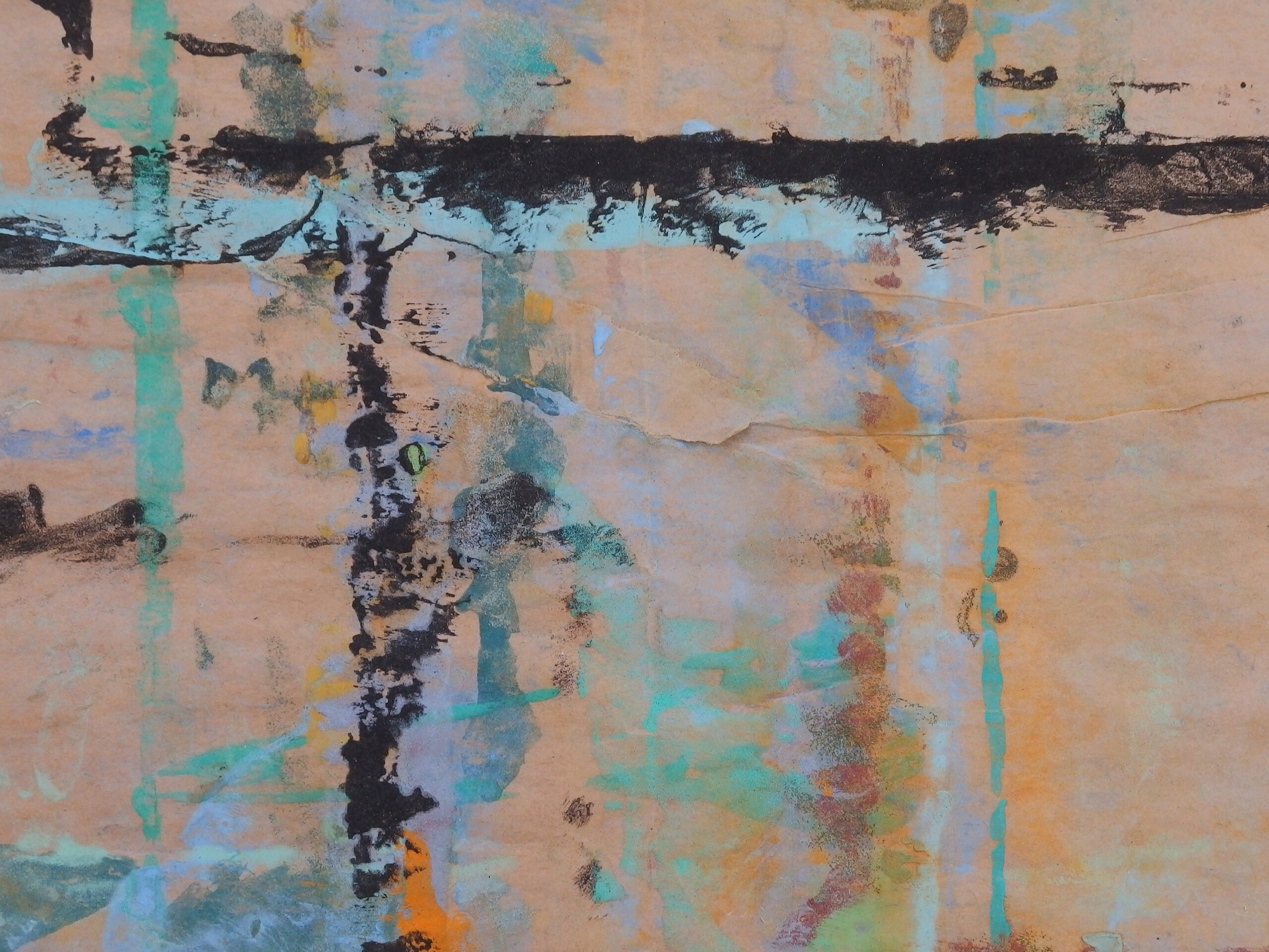 天然素材の和紙に膠を使うのが「日本画」の常識ですが、あえて人工素材を使っています。