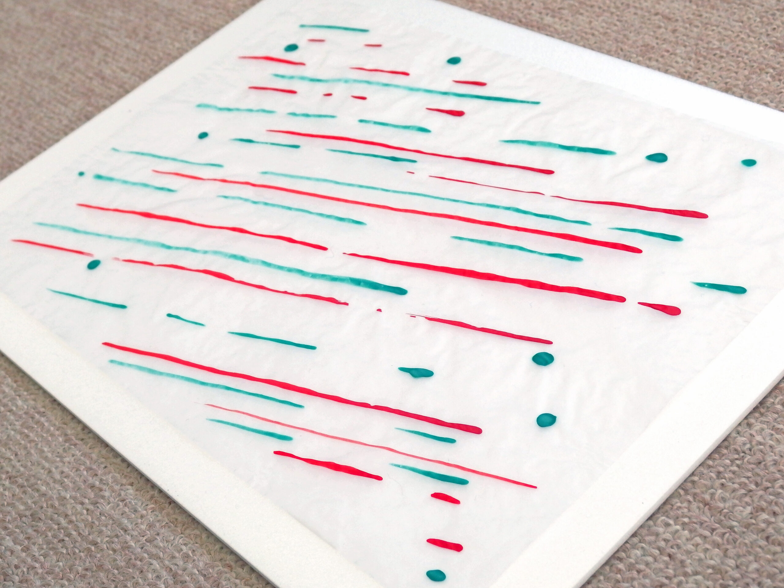 天然素材の和紙に膠を使うのが「日本画」の常識ですが、あえて人工素材を使っています。
