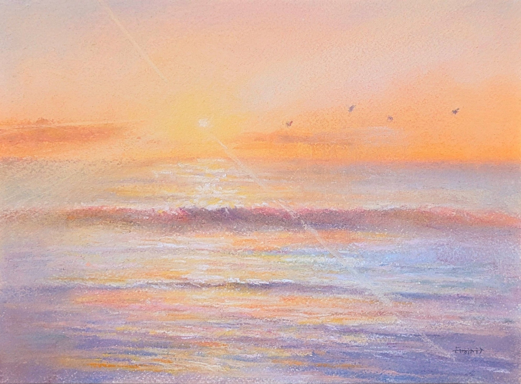 朝の光を描くのは本当に楽しいです。光と言ってもただの黄色や白色ではなく、ピンクや赤など様々な色が見えます。パステルの特徴を活かして、色彩豊かで落ち着いた柔らかい雰囲気の作品にできました。