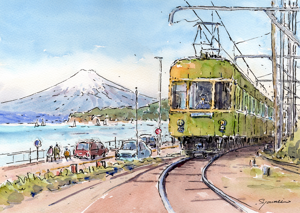 水彩画原画 江ノ電・七里ヶ浜からの富士 #706