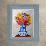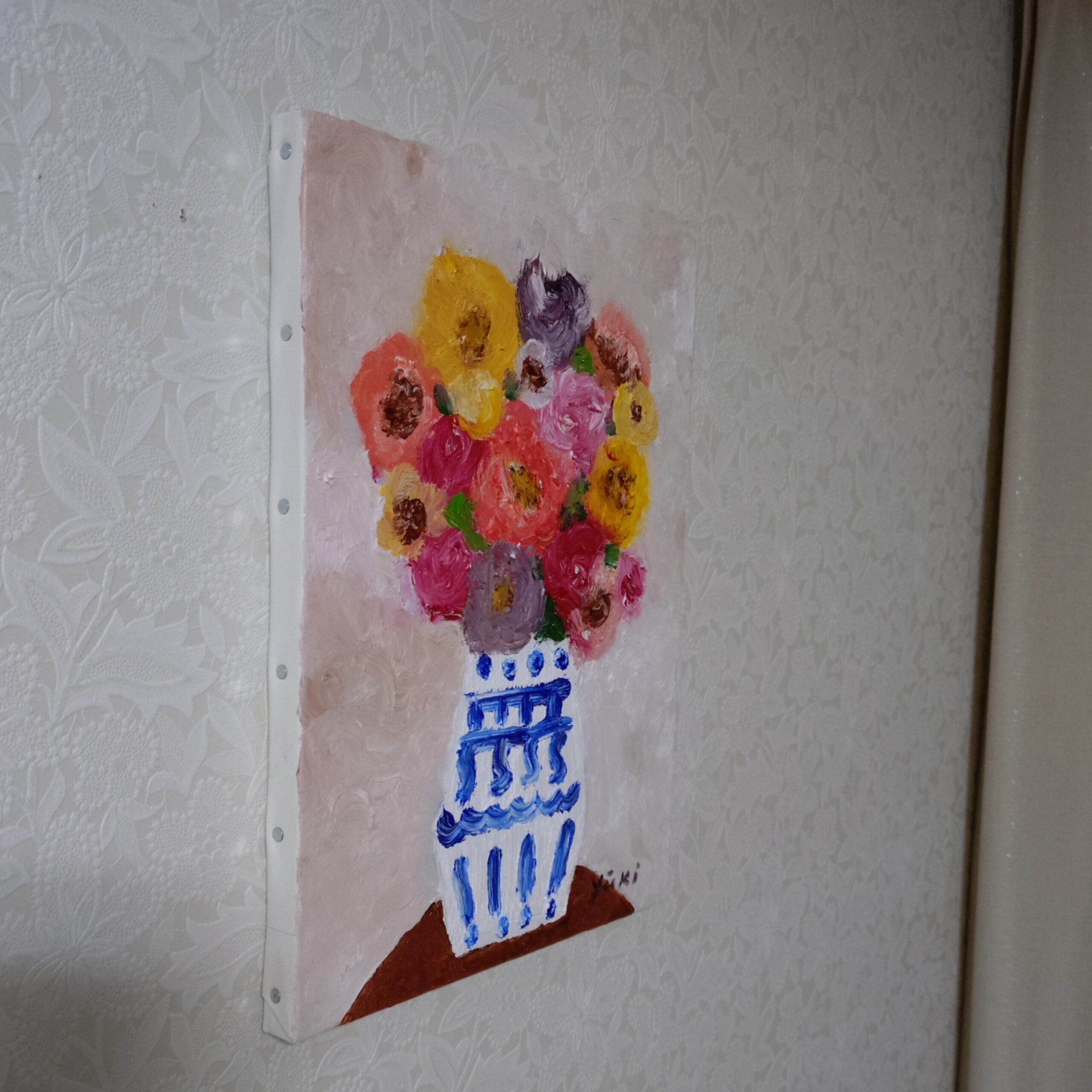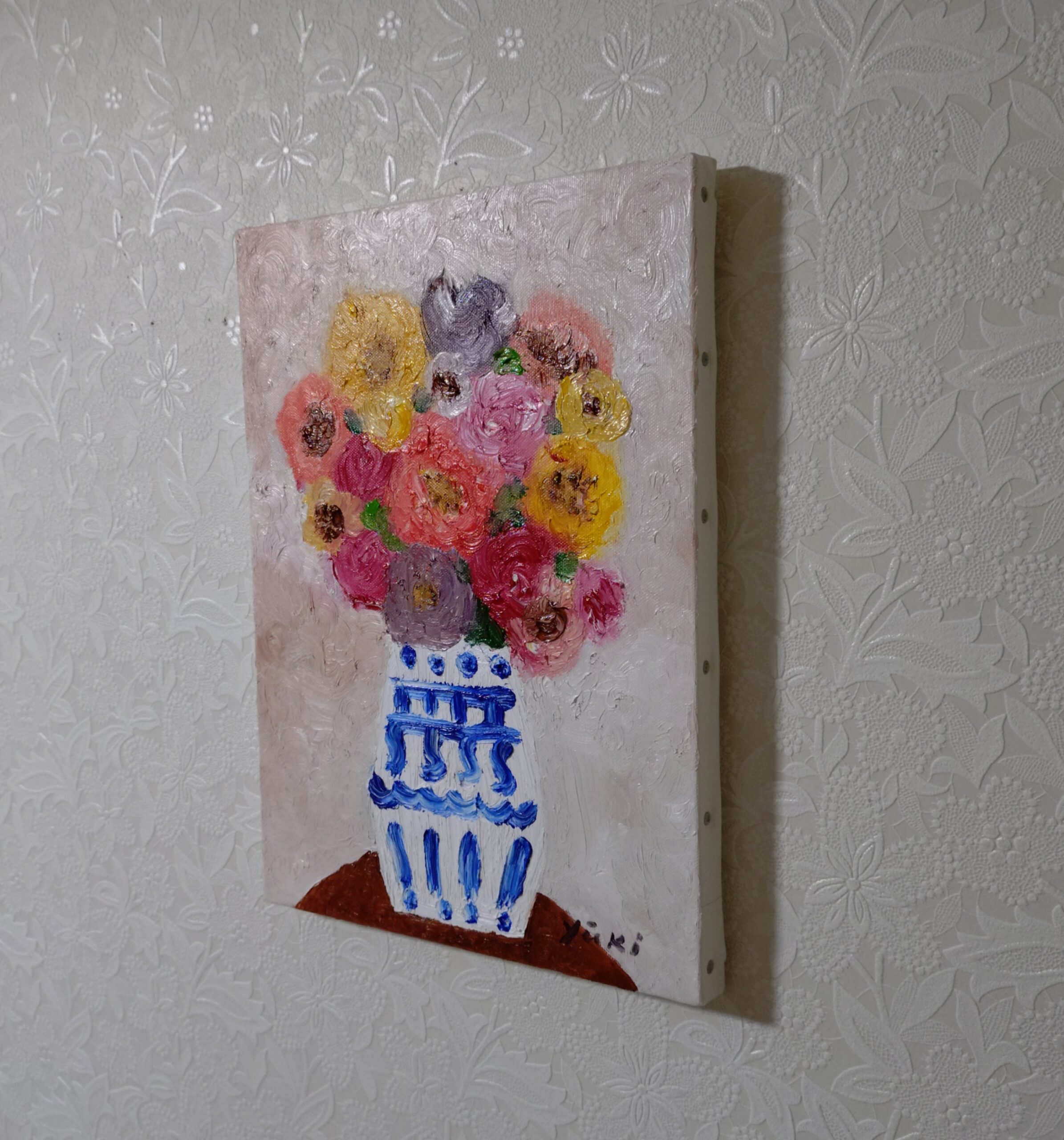油彩にて花瓶の花を描きました。こちらの時々描く静かな午後という作品は落ち着いた雰囲気の作品です。