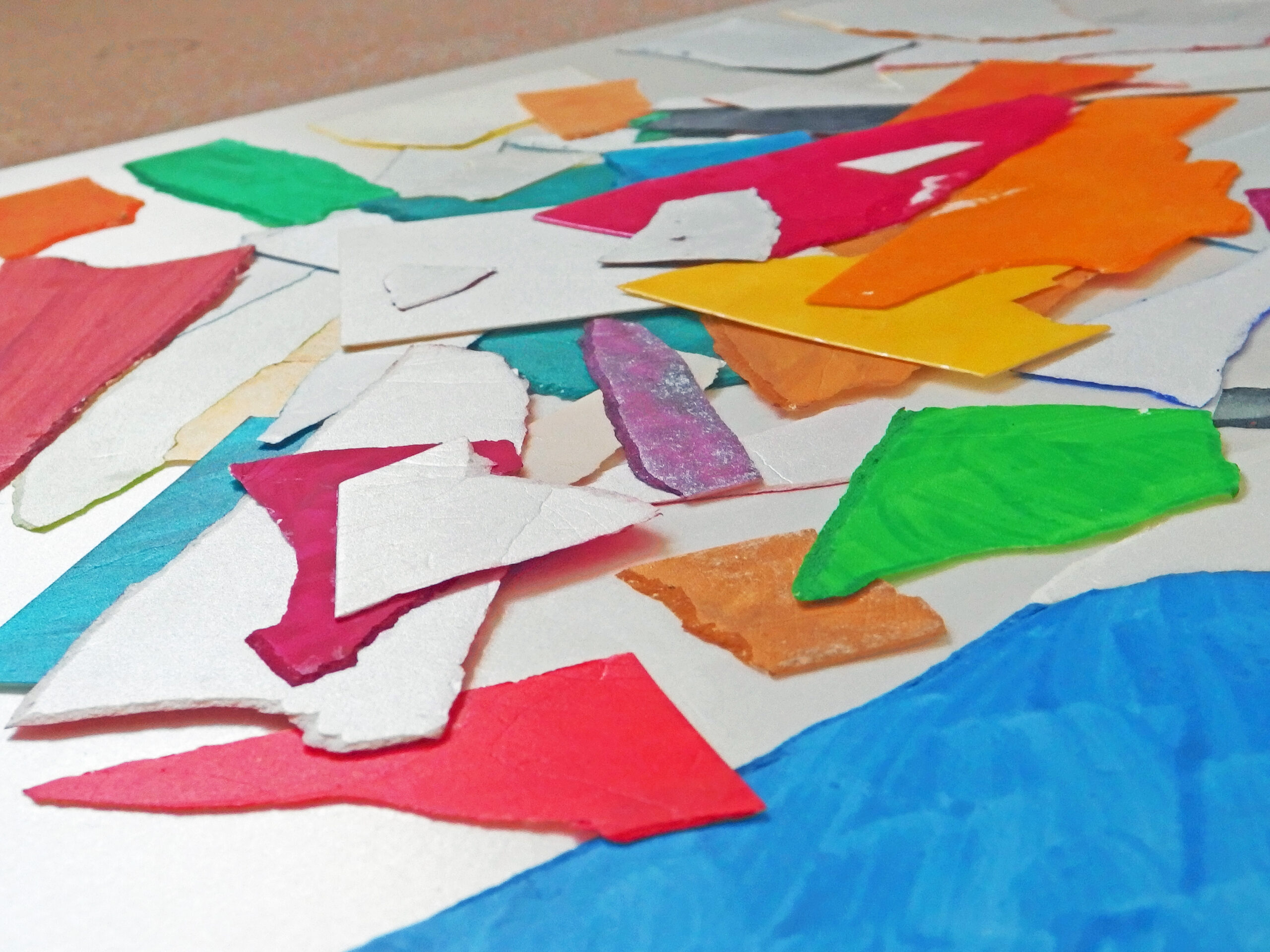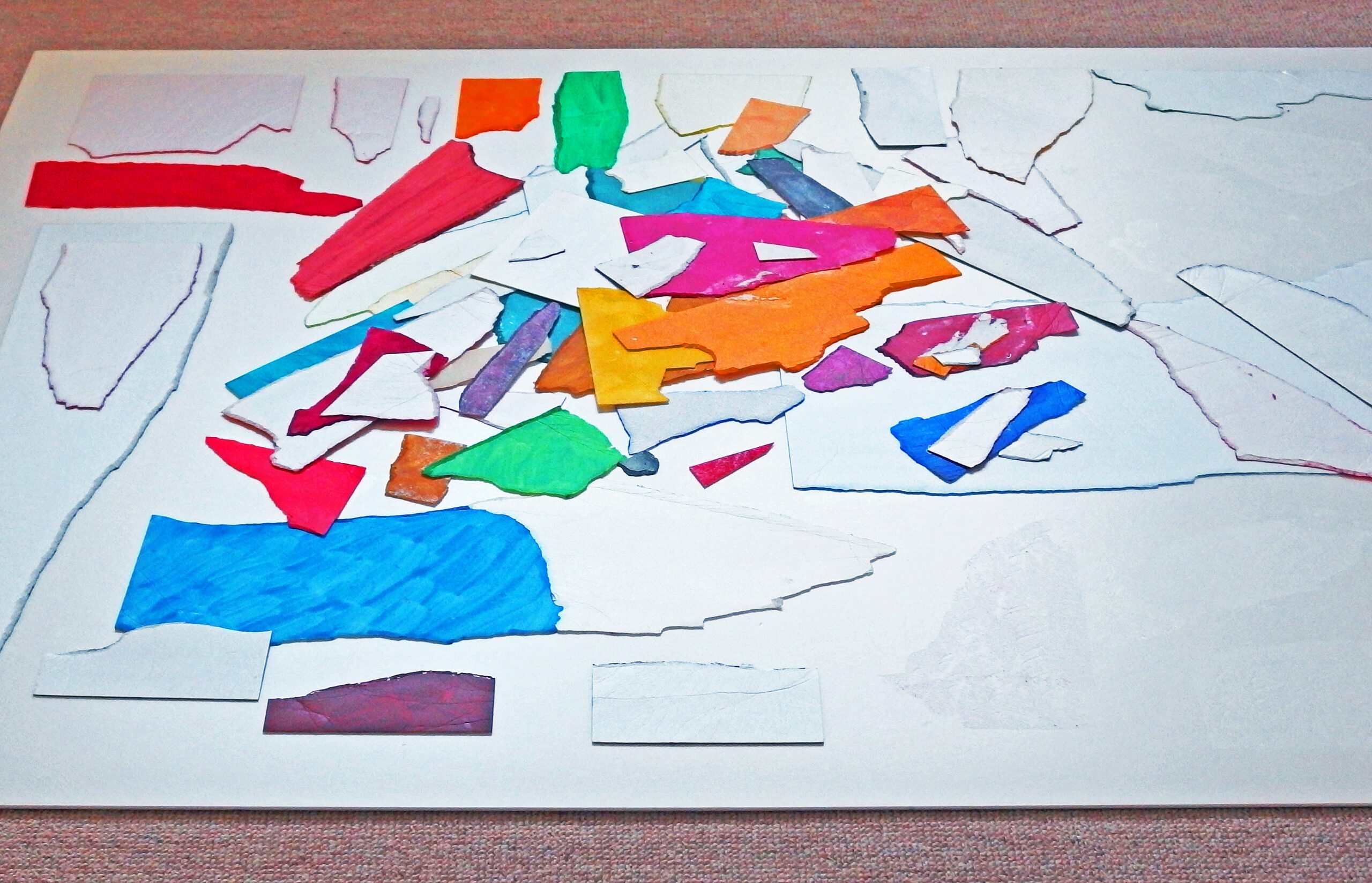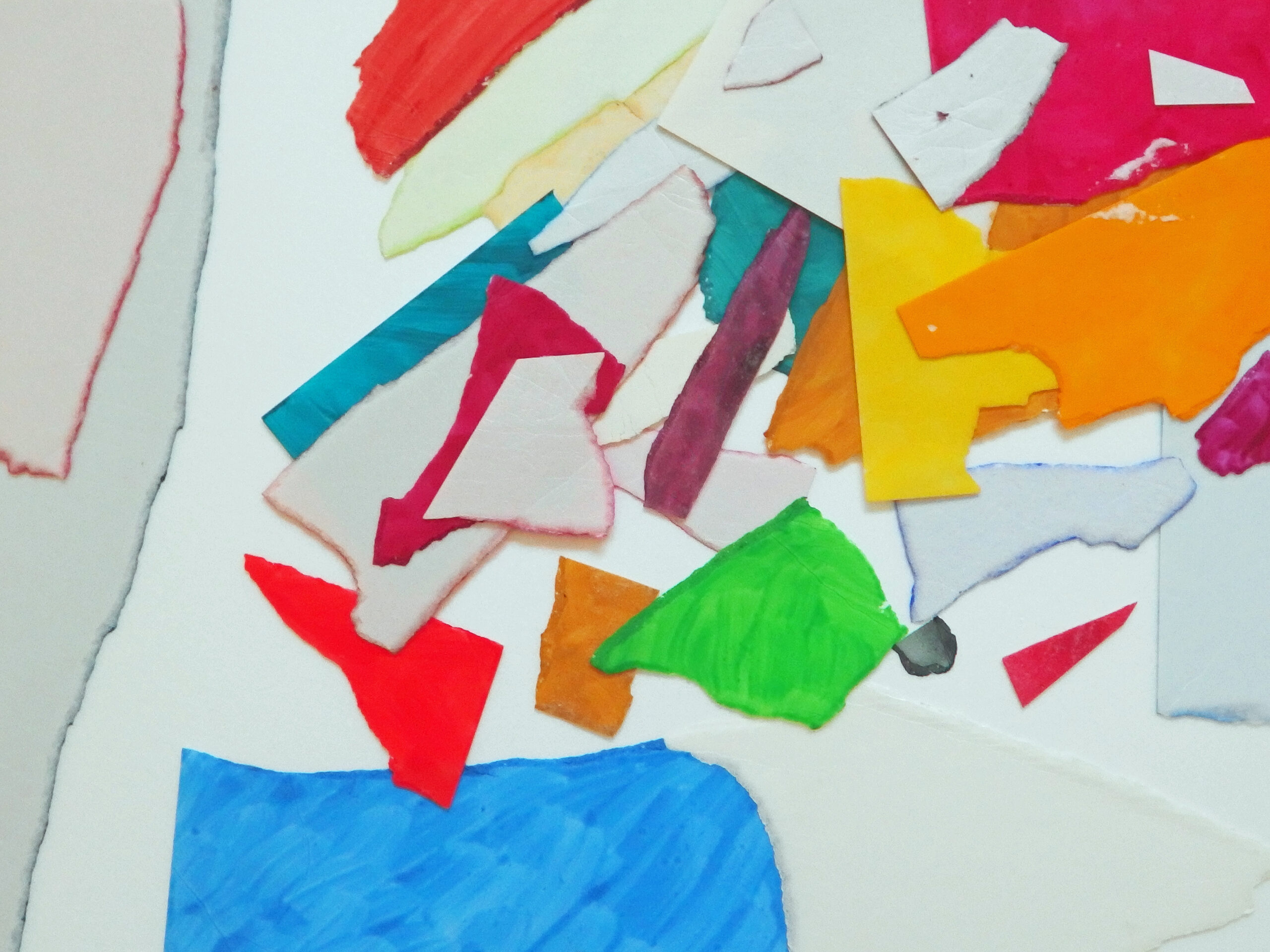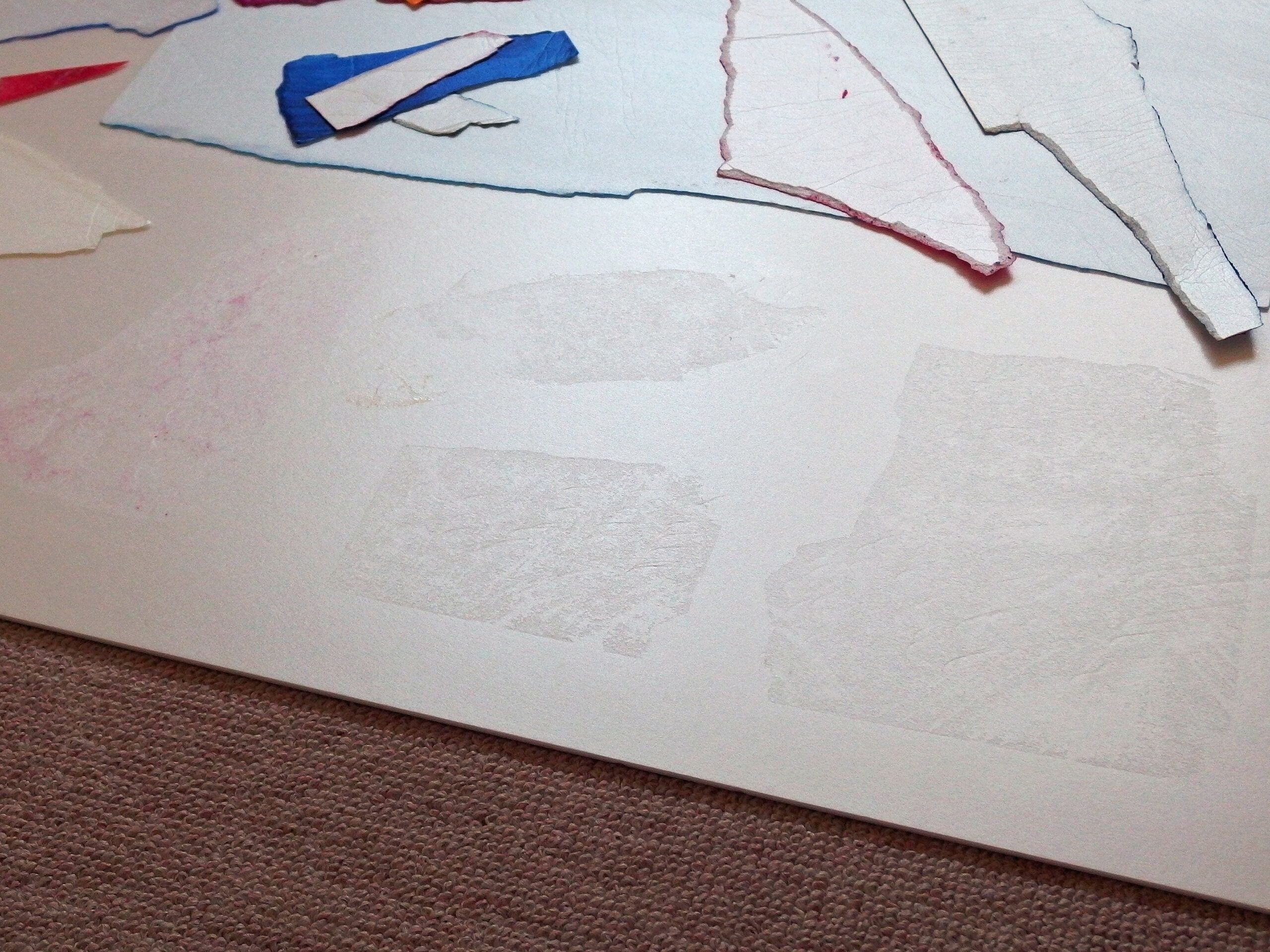 天然素材の和紙に膠を使うのが「日本画」の常識ですが、あえて人工素材を使っています。