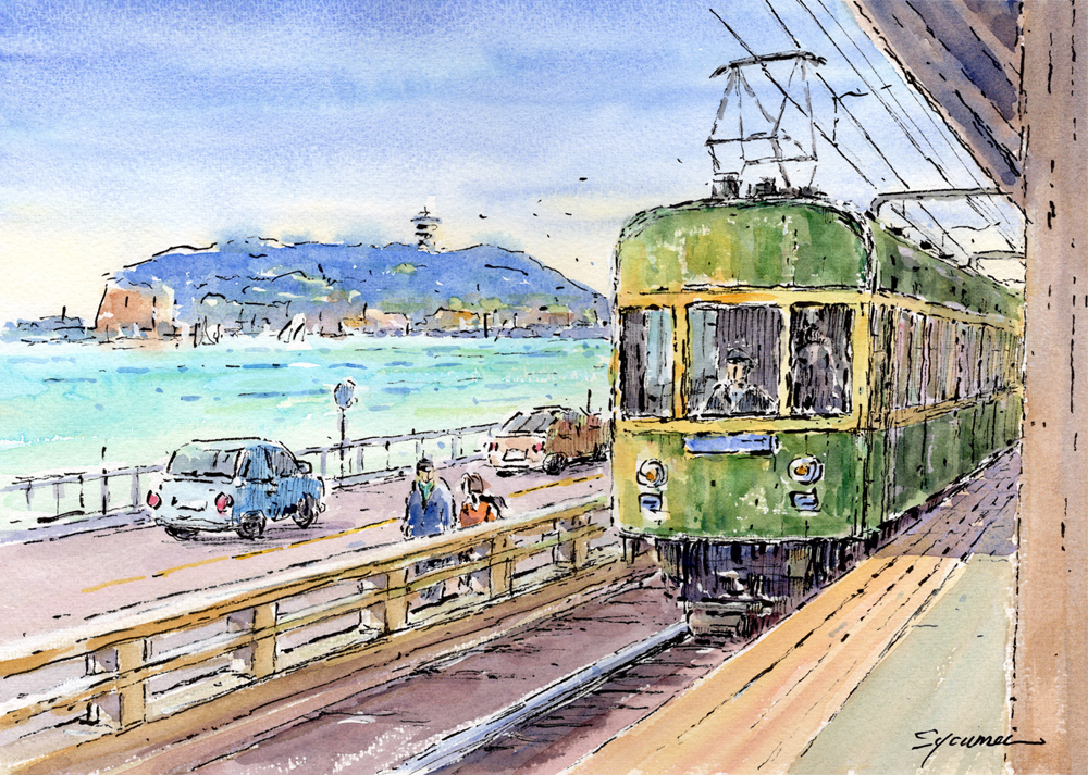 水彩画原画 鎌倉高校前駅ホームからの江の島 #705