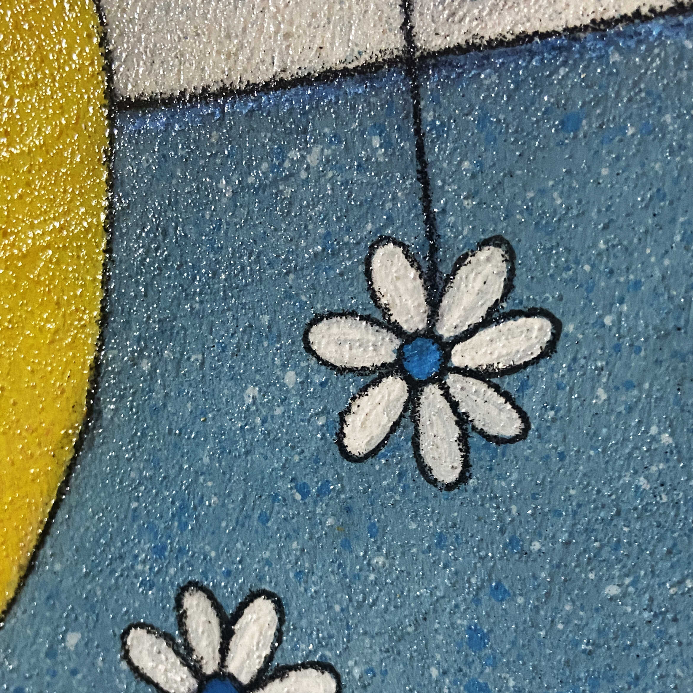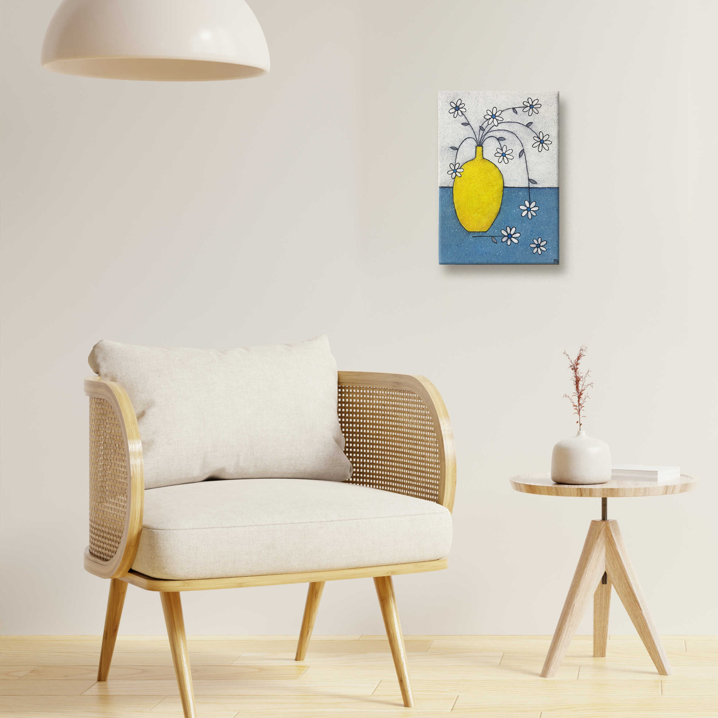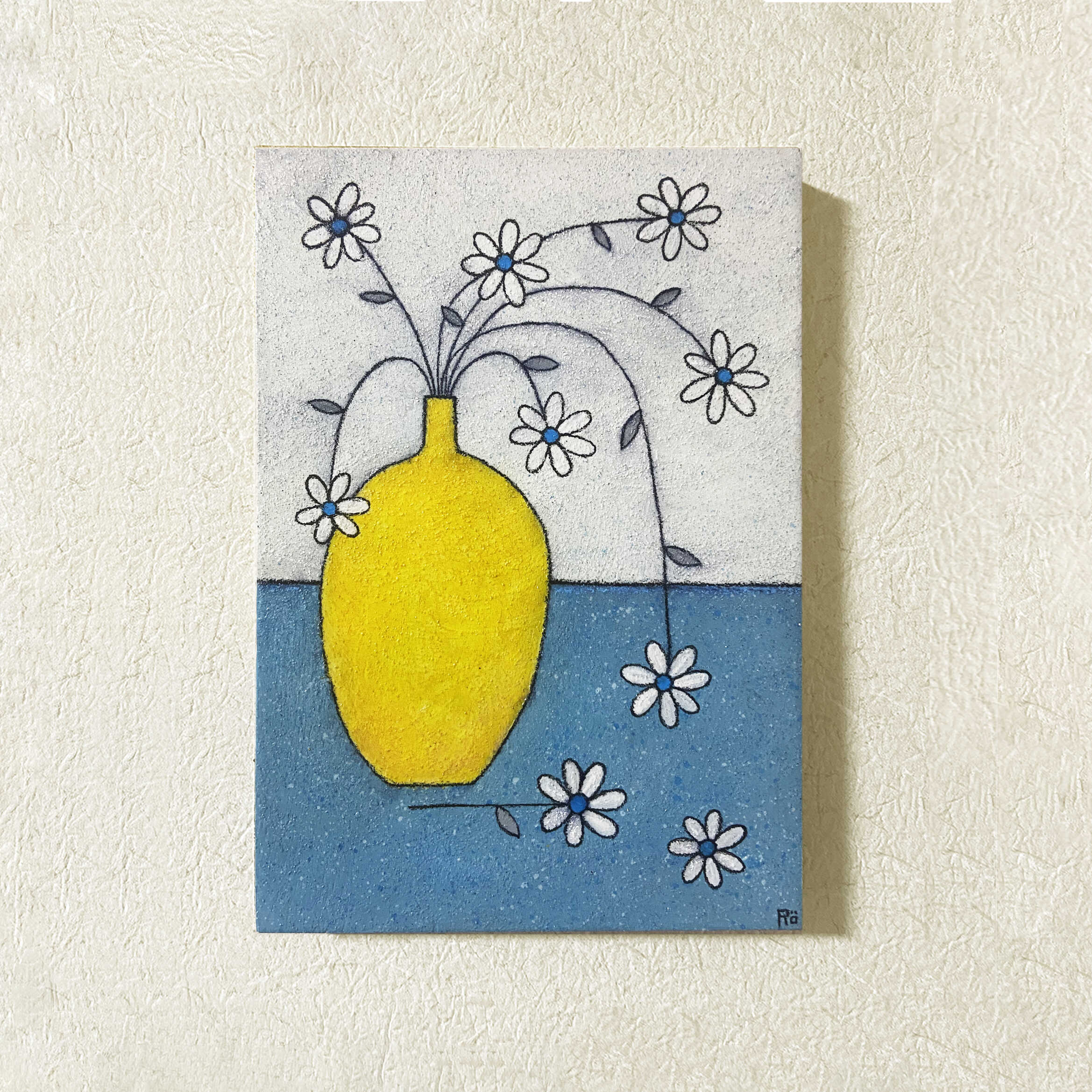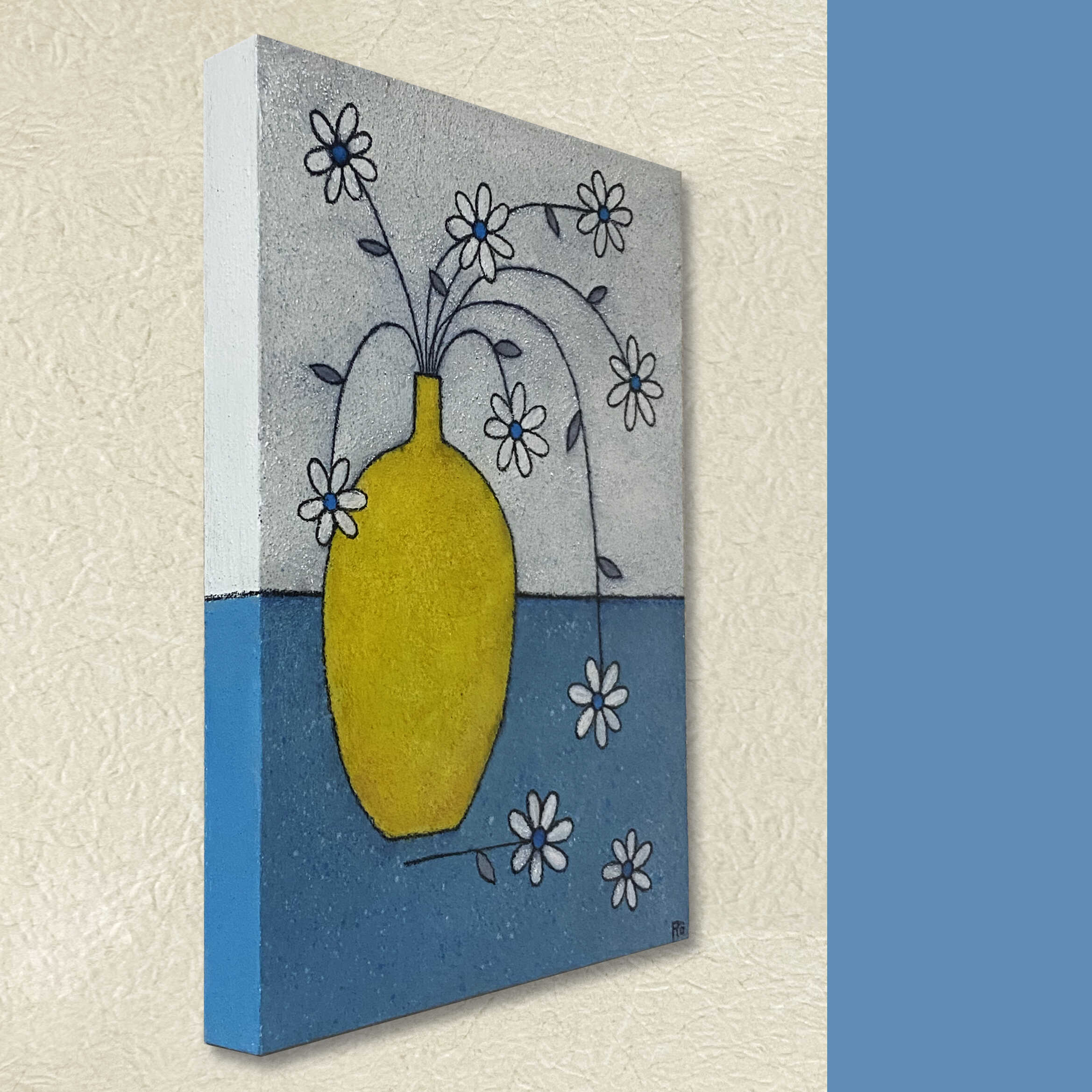 STORY:ブルーグレーの背景に黄色の花瓶を主体に空間いっぱいに描いた大胆な構成でモダンな印象を演出いたしました。