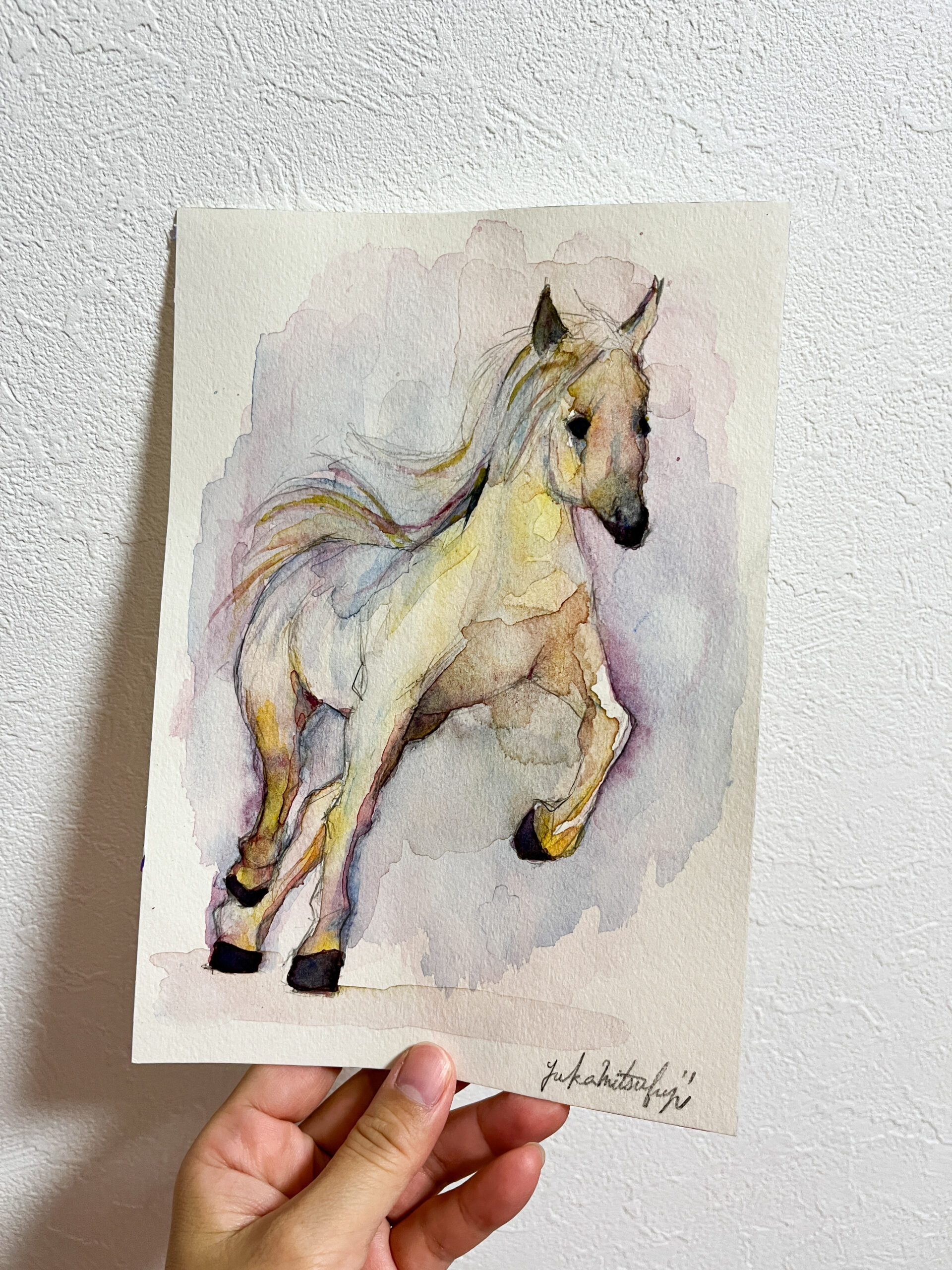 赤、青、黄色の3色だけで表現した馬の水彩画です。
