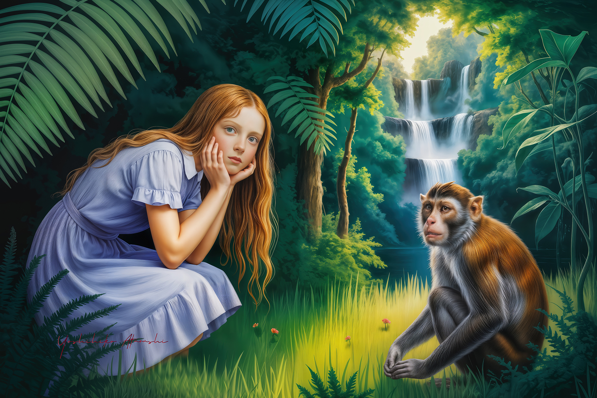 深いジャングルに佇む少女と動物たちを描いた作品群は、静謐でありながら生命の息吹を感じさせます。瑞々しい緑と透明感ある光の表現は、 観る者を幻想的な世界へ誘います。無垢な少女の姿は自然との共生を象徴し、心に安らぎをもたらす逸品です。