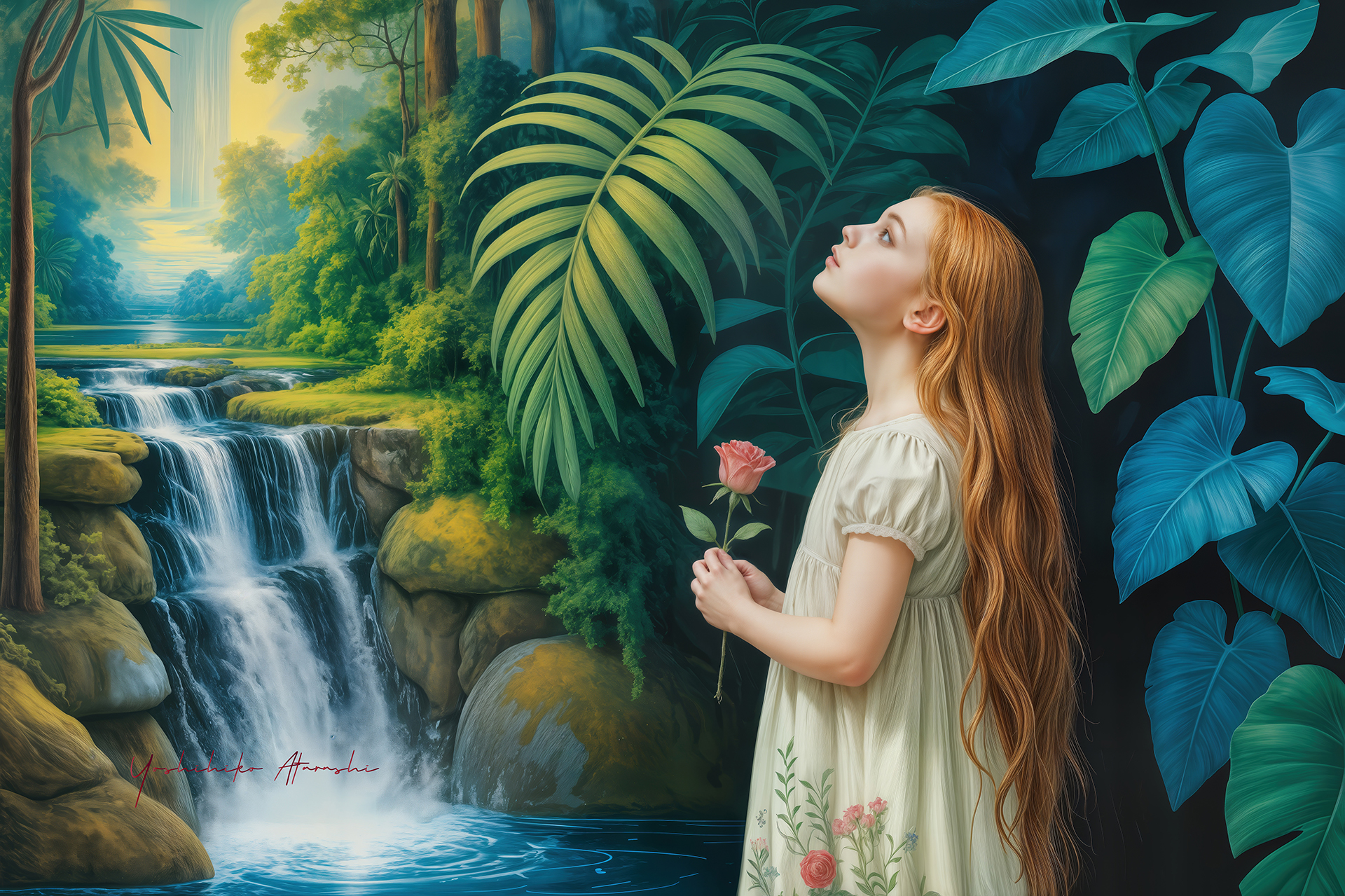 密林に迷い込んだ少女の姿を通じ、人間と自然、文明と野生との境界を描きました。構図は水や樹木の流れを軸に少女を配置し、柔らかな筆致 で生命の調和を表現。青と緑を基調に光を差し込み、静謐と神秘の両面を込めています。少女の無垢な眼差しは自然と対話し、心の原点を問い かけます。