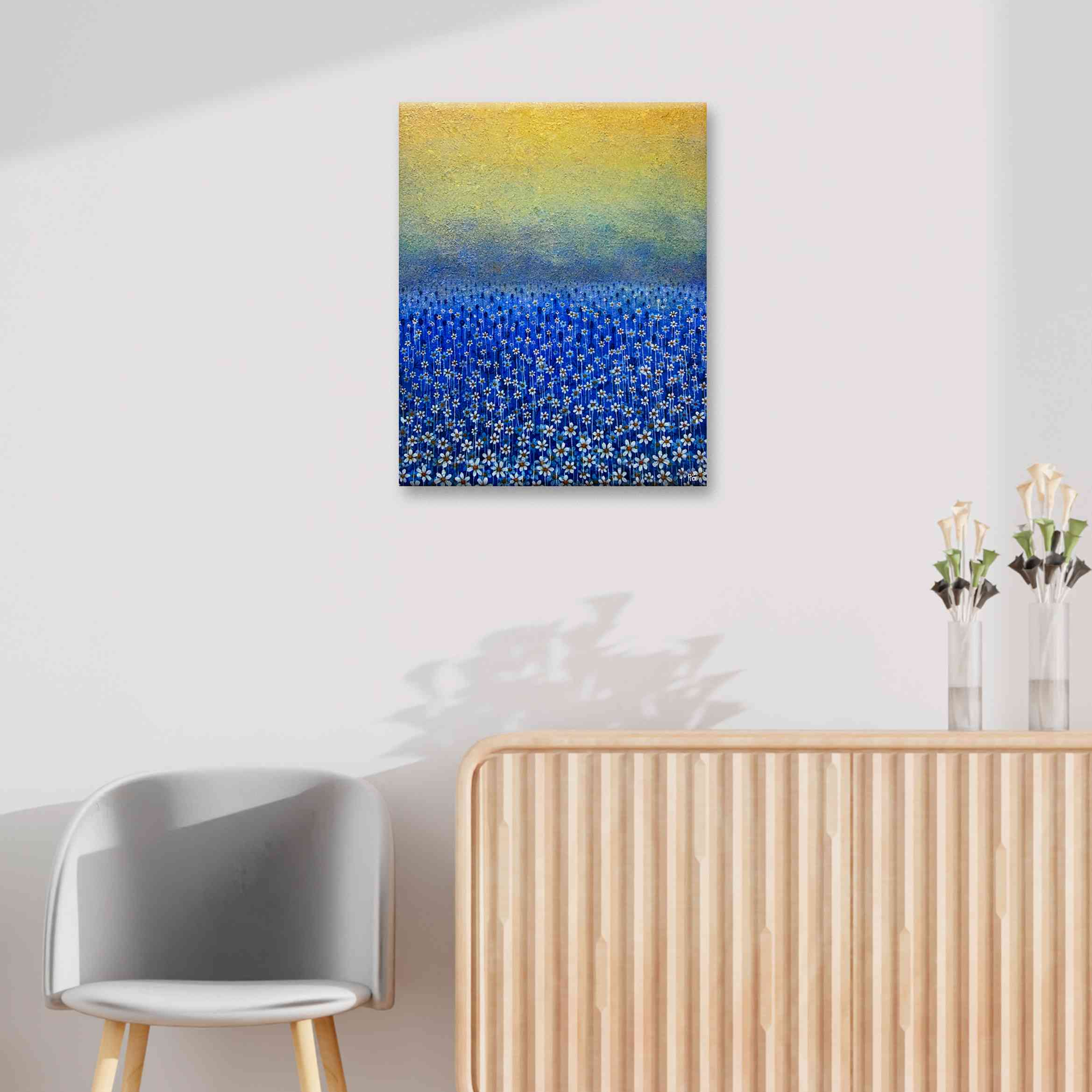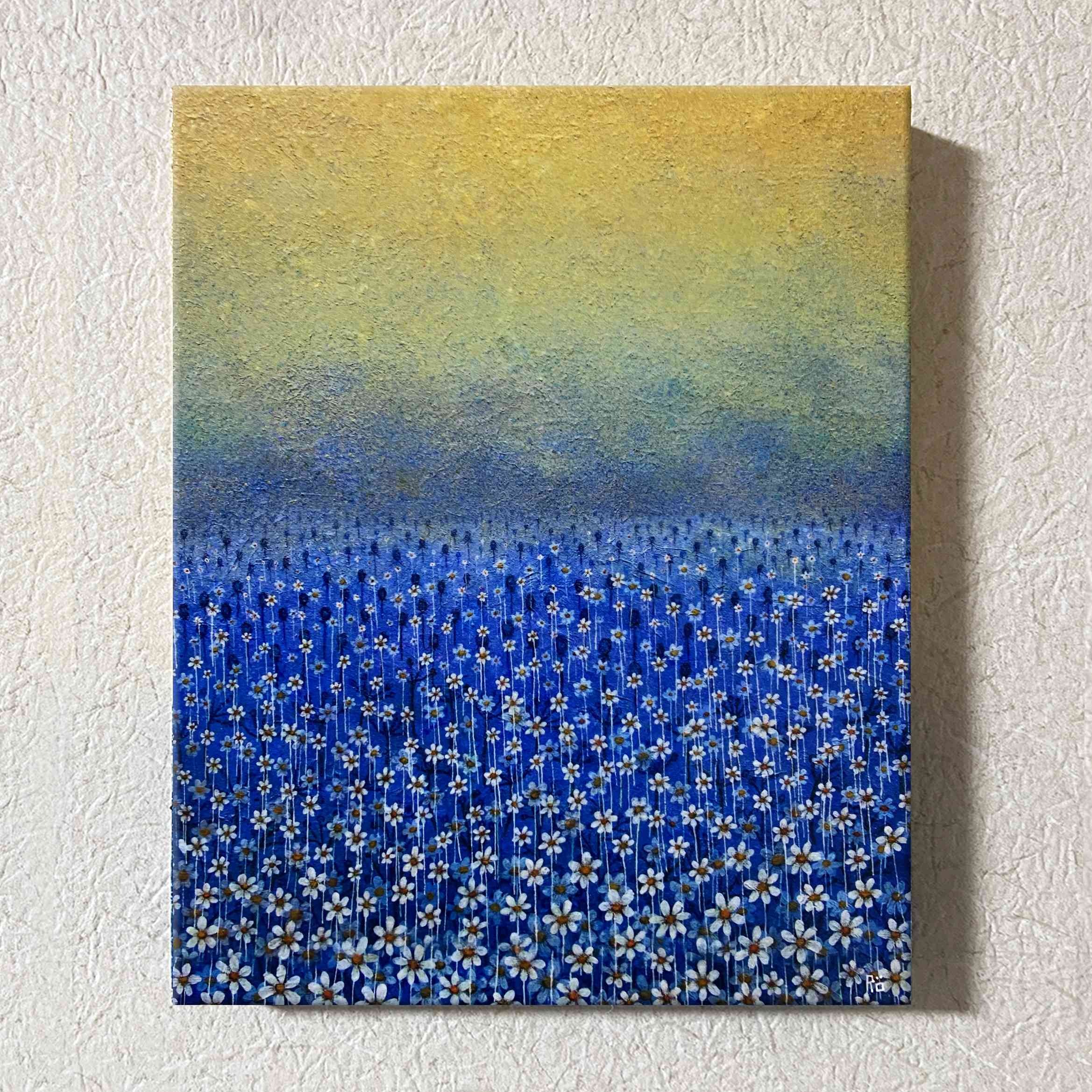 優しく淡い青の野原に白い花々が空に届くかのように遠く遠く彼方まで