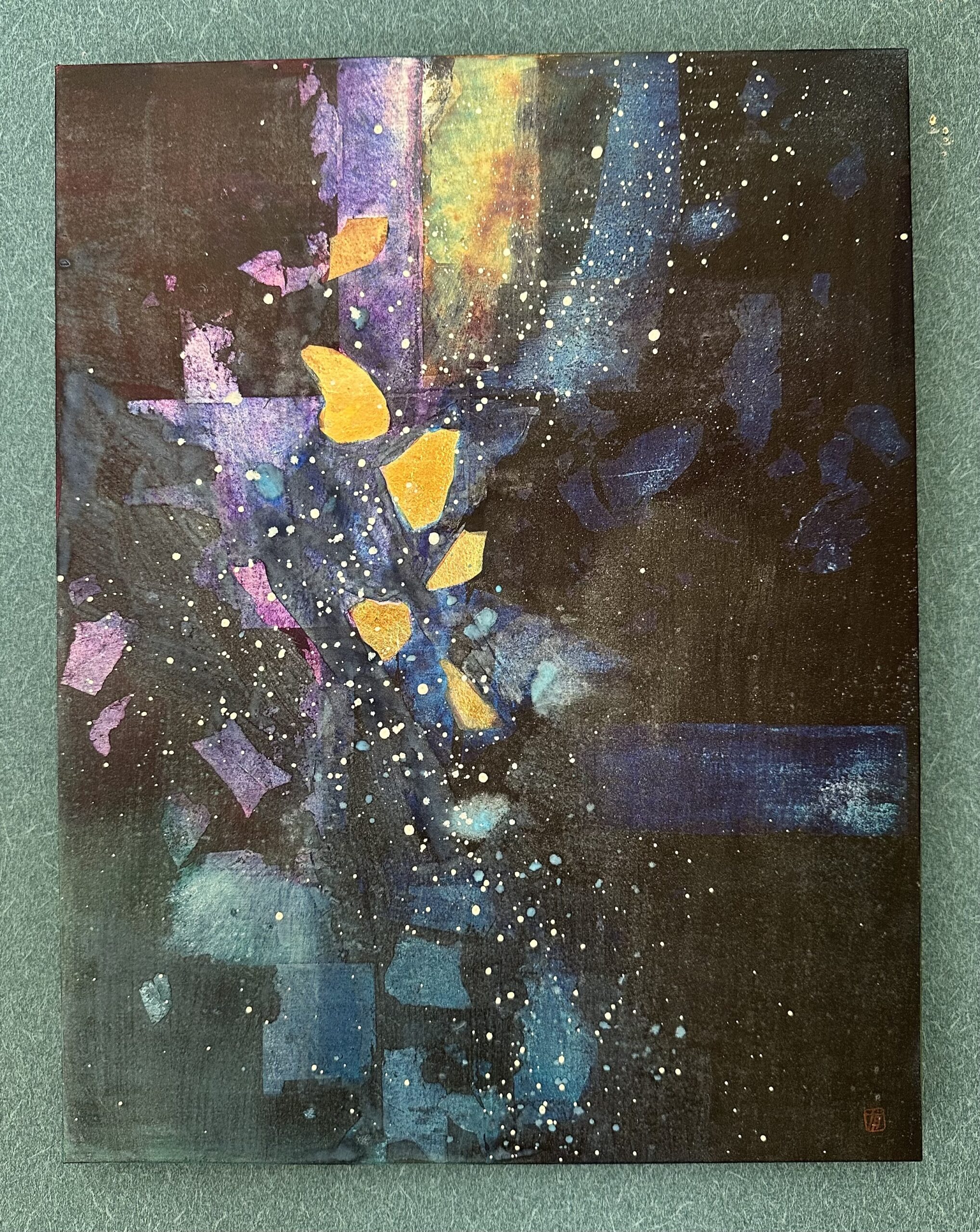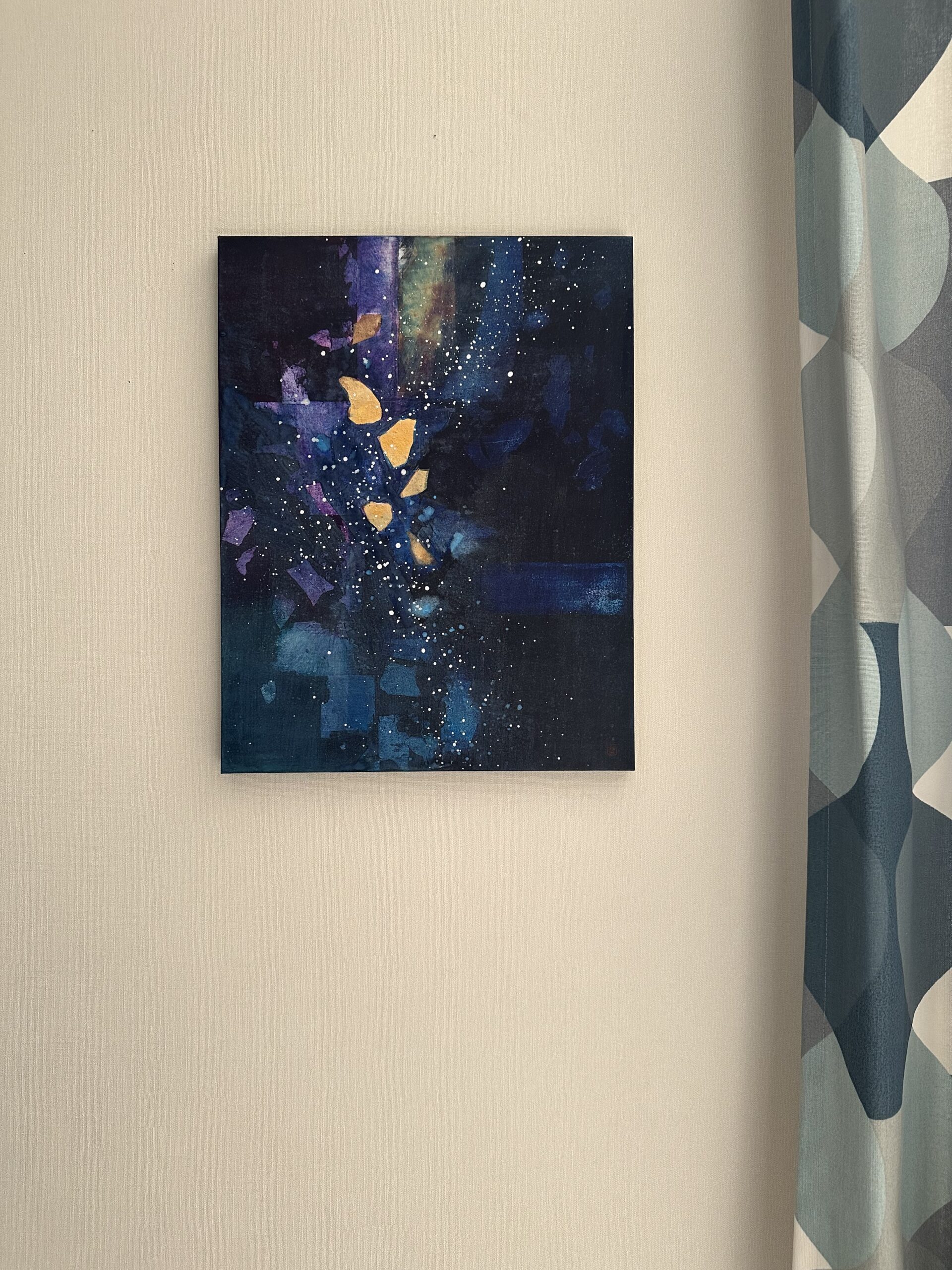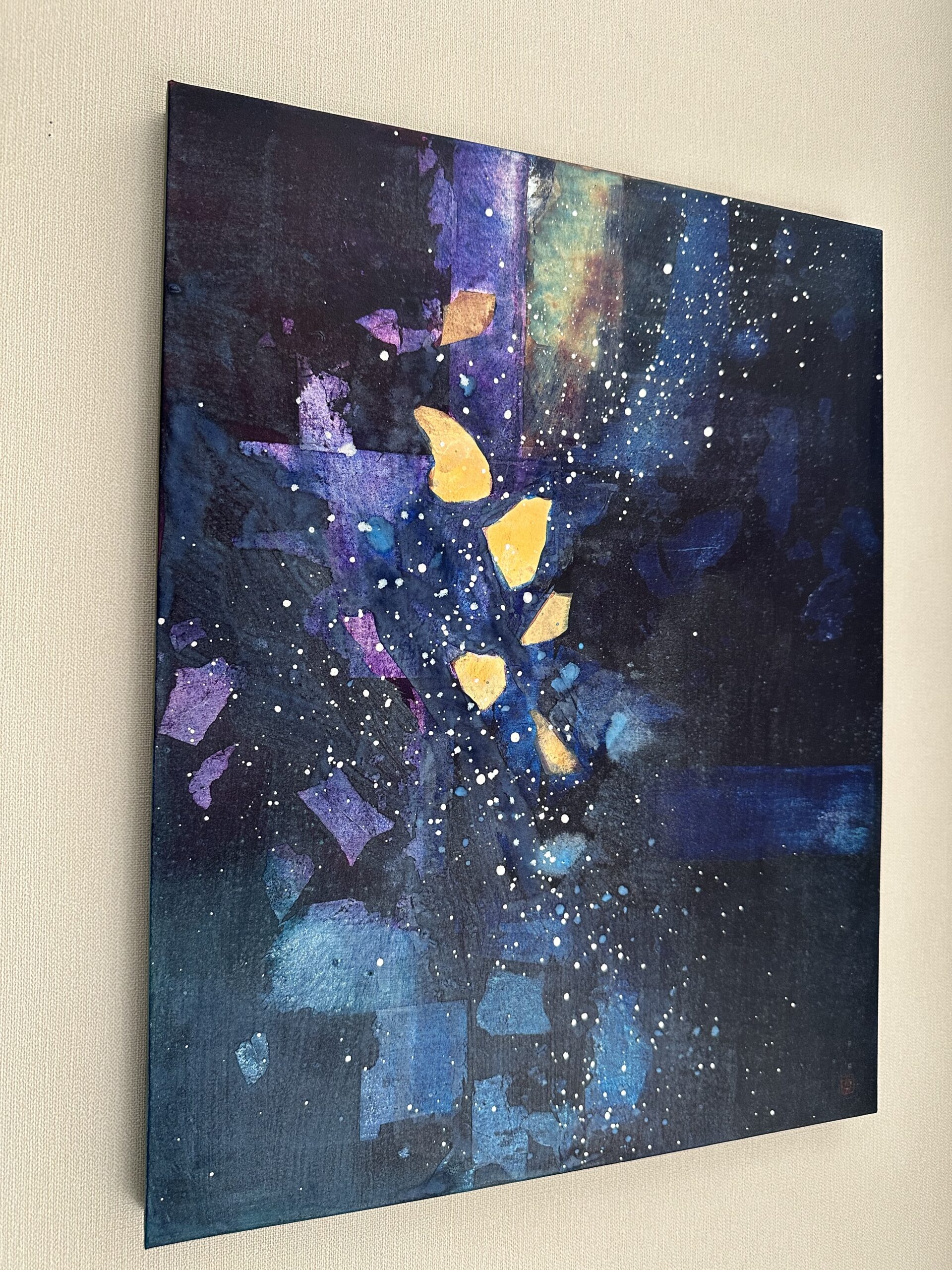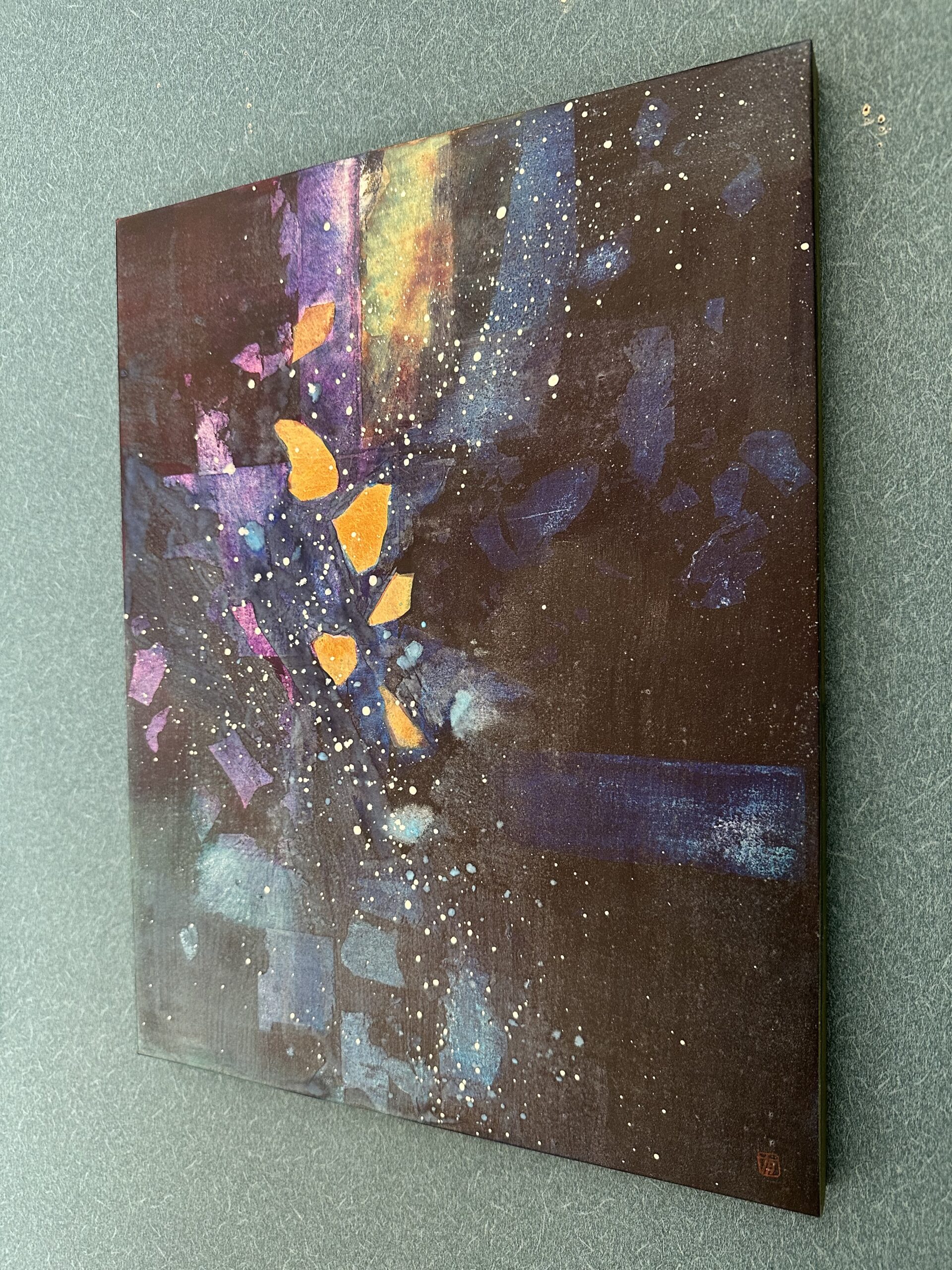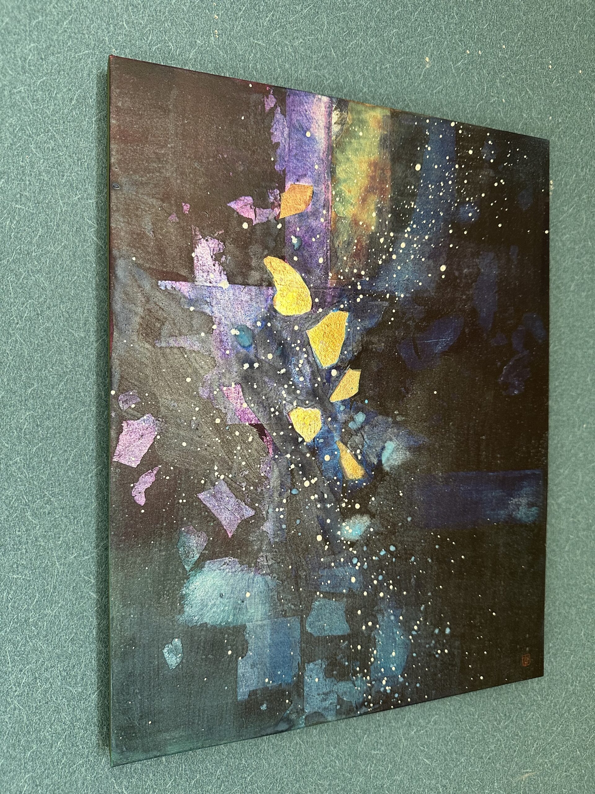 箔を使用した作品は、光のあたり方によって輝き方が変わります。日中の窓から入る自然光、夜の照明の光など、光の違いにより表情がかなり変わります。また、箔の変色を抑えるためのコーティングをしておりますが、時間経過とともに少しずつ色味が変化します。その変化もお楽しみいただけますと幸いです。