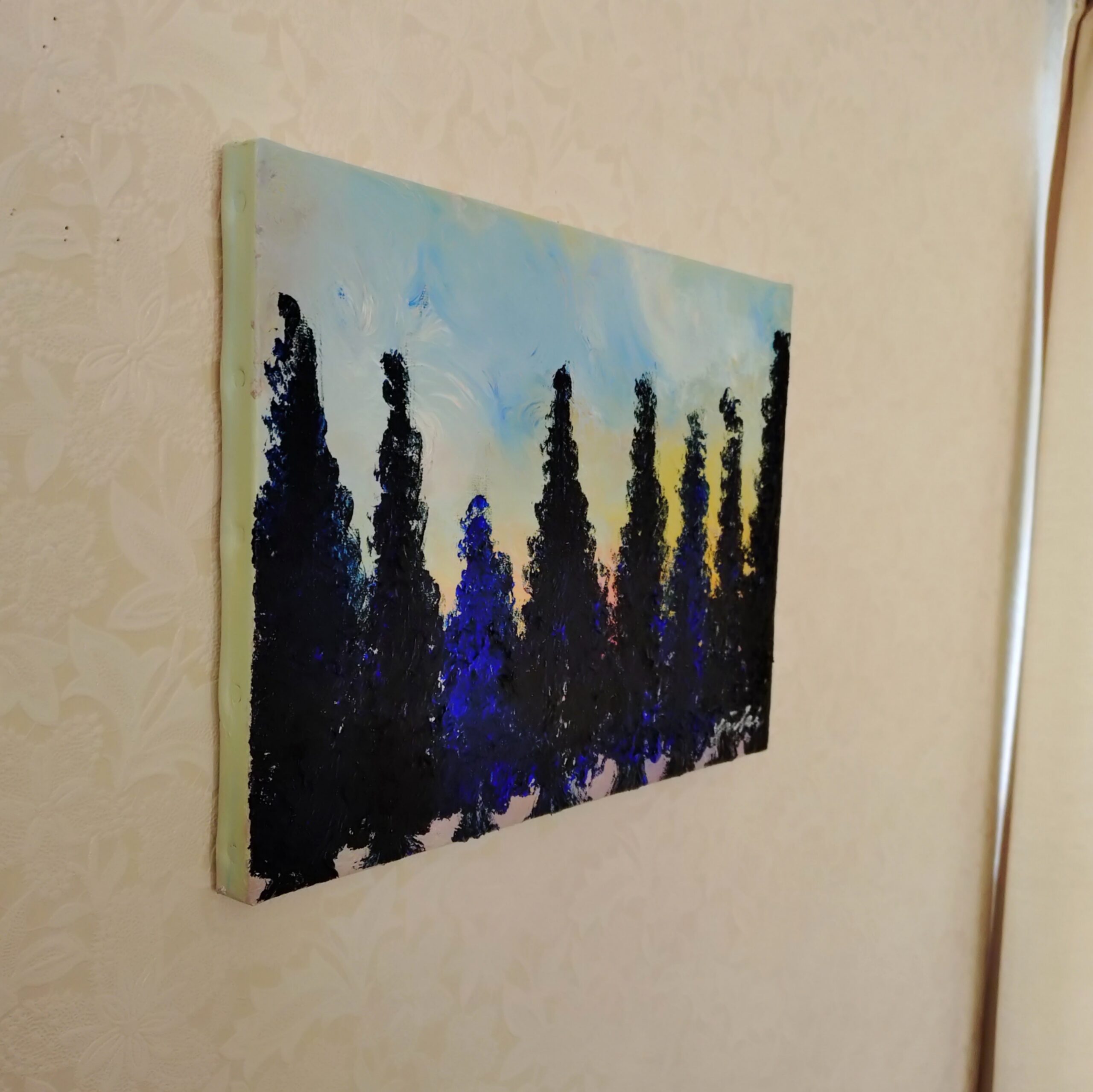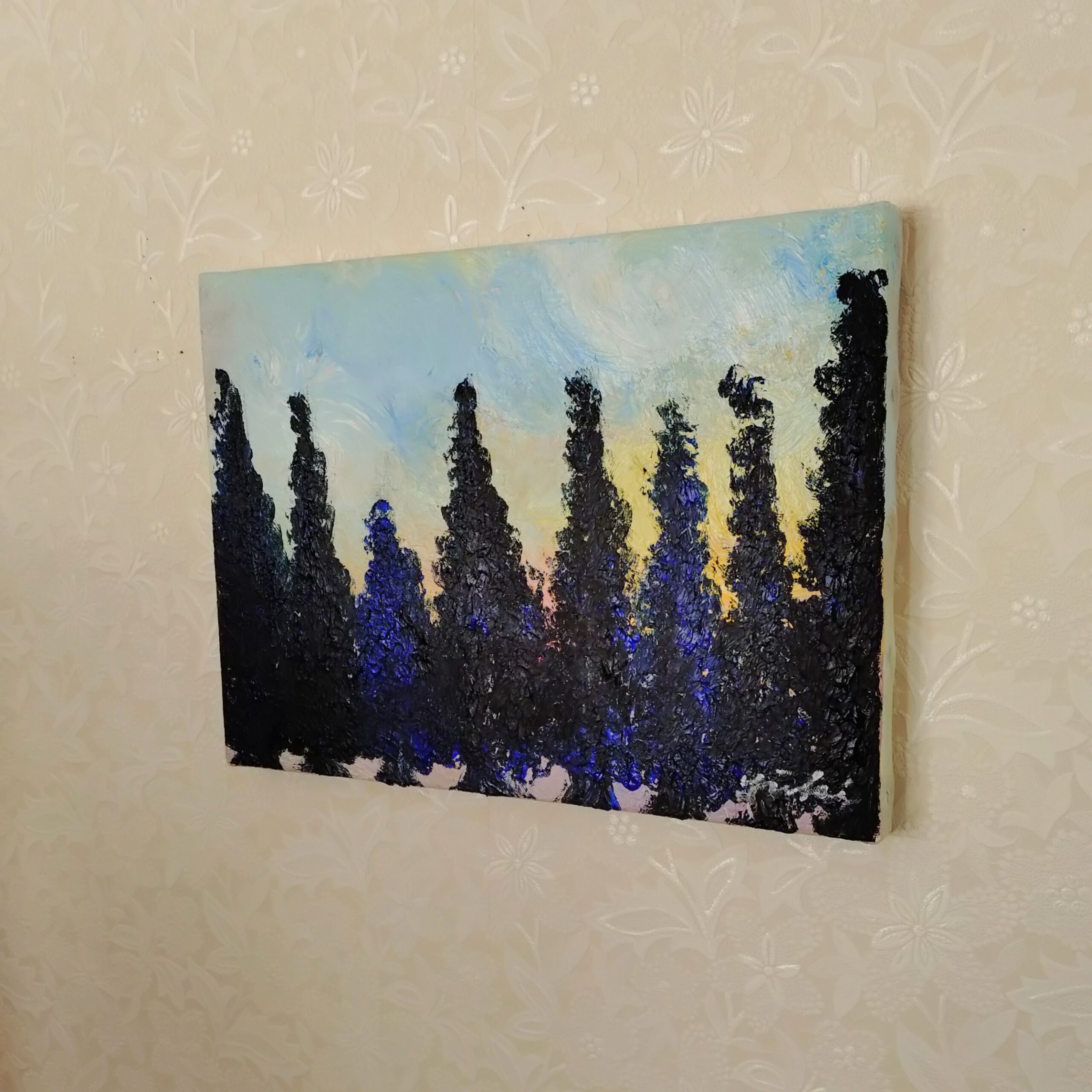 30代、療養生活を送っていた時期がありました。少し外に出られるようになった頃自然の中で過ごす時間がありました。その場所は静かな森のような所で、時間によって様々な色合いを見せる景色を私は時々訪れてはしばらく眺めていることがありました。静寂の中で大きな存在に護られているような、それでいて私自身がその場所や自然と一体となっている感覚は今でも忘れられません。その時はこの経験がその後の自分にどう作用するのかなど考えることはありませんでしたが今、この静寂の森の作品を描いているとその時の経験が今の私につながり私の中に大切なものとして生きていることを作品を描く度に感じられ今も私を癒してくれていることに気付かされます。