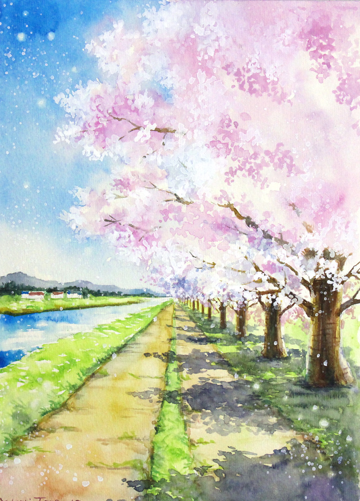 青空の下、水辺に咲く桜の並木道を水彩で表現しました。s