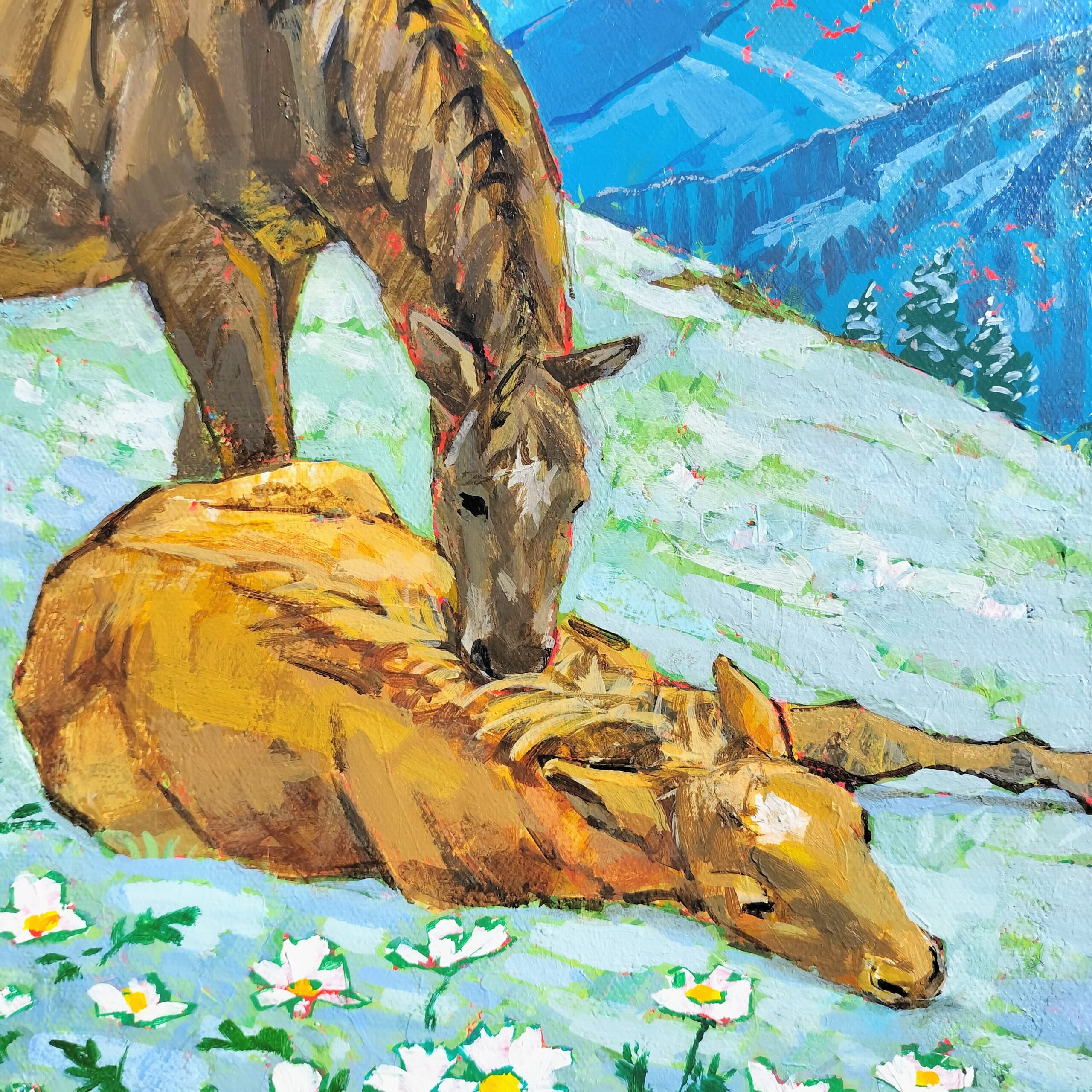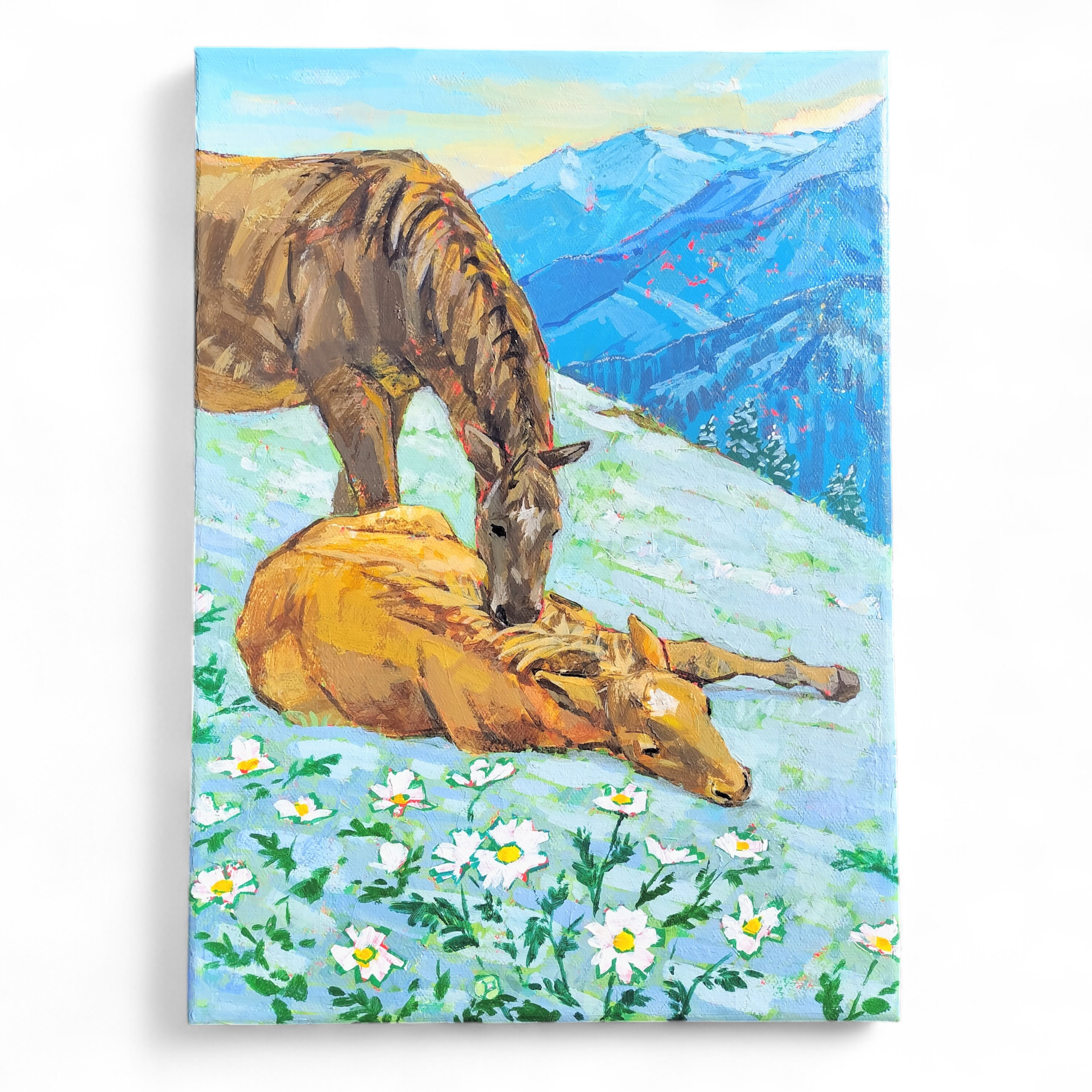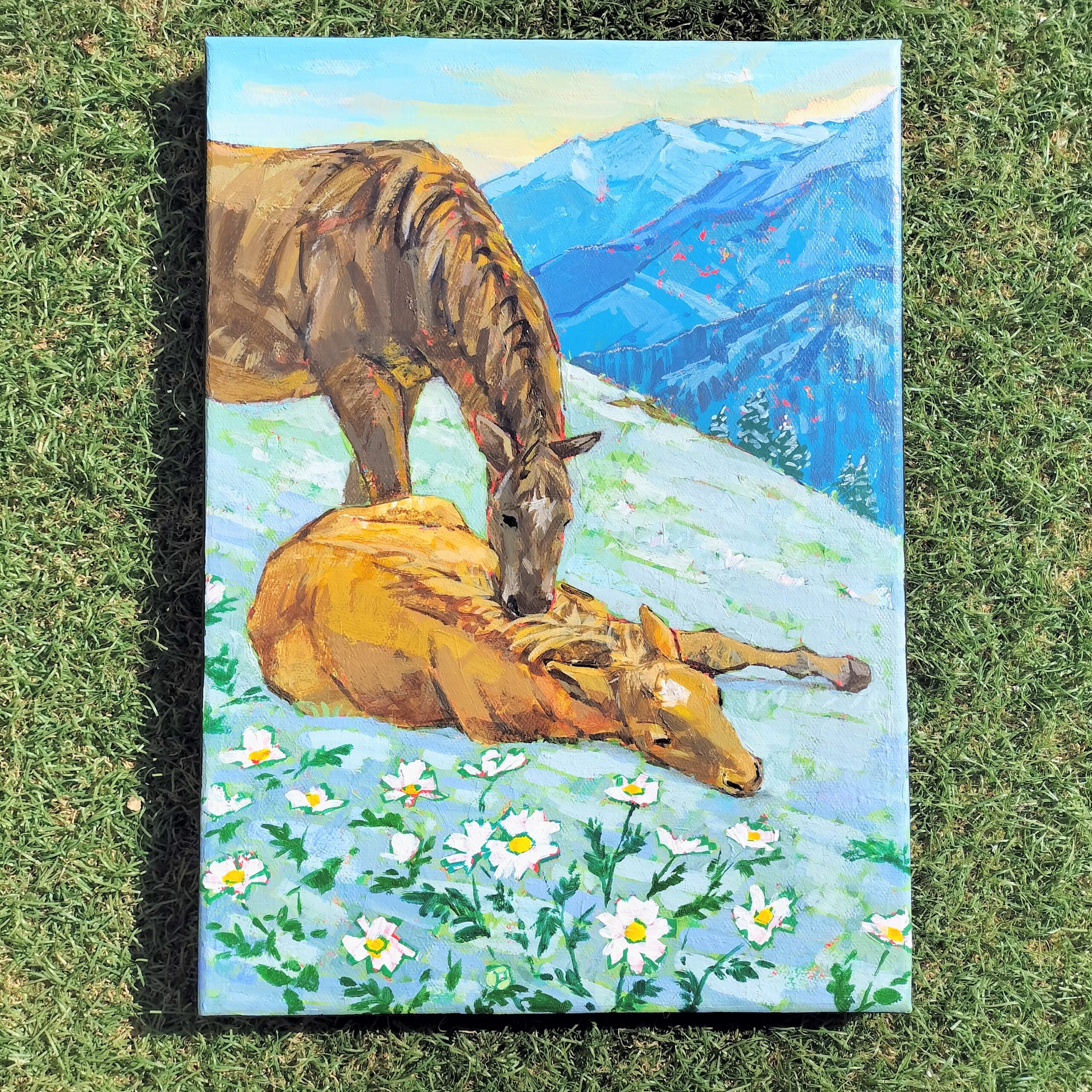雪解けを待つ花々の中で、互いの体温を感じながら静かに過ごす馬たちの姿を描きました。