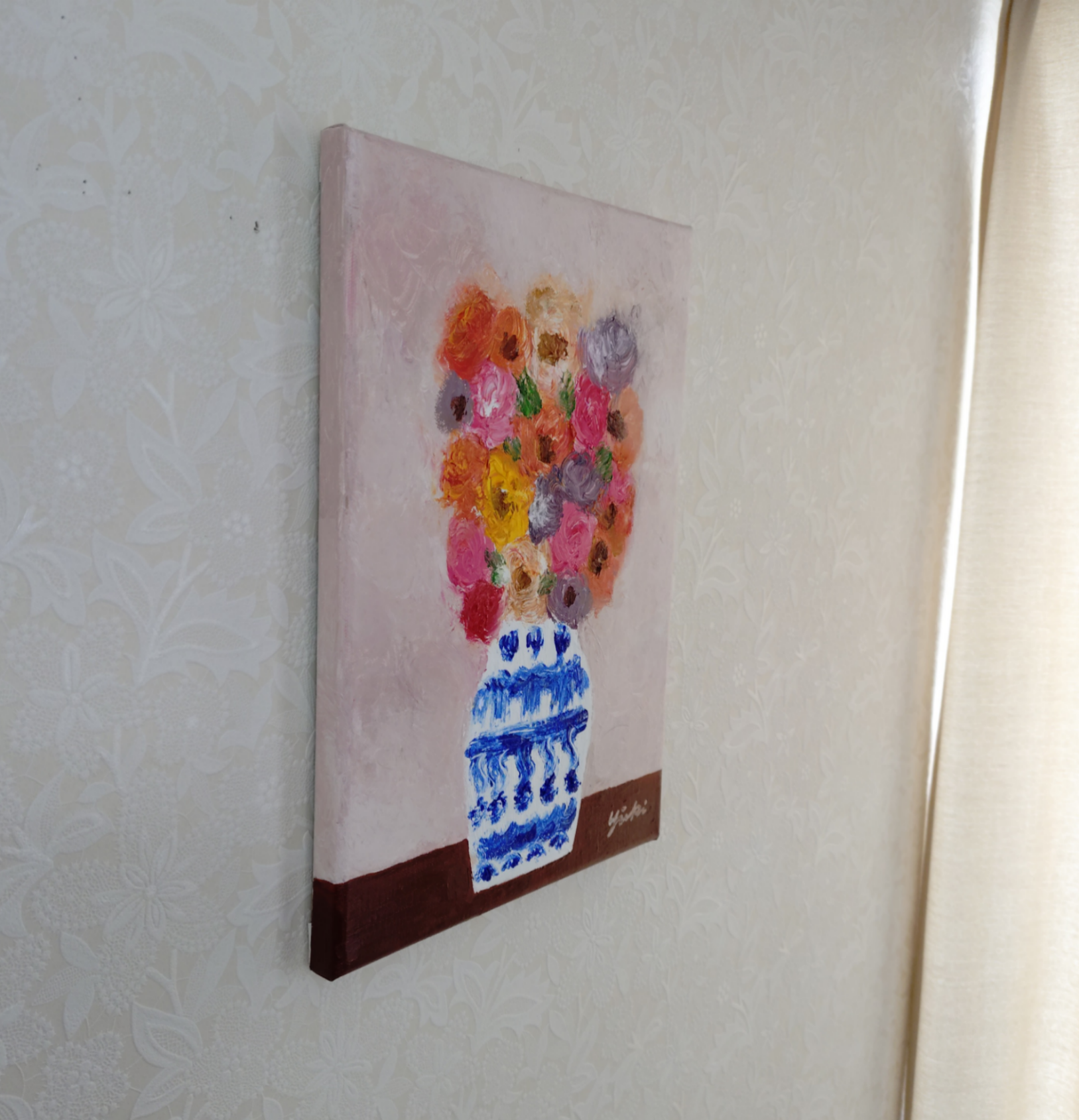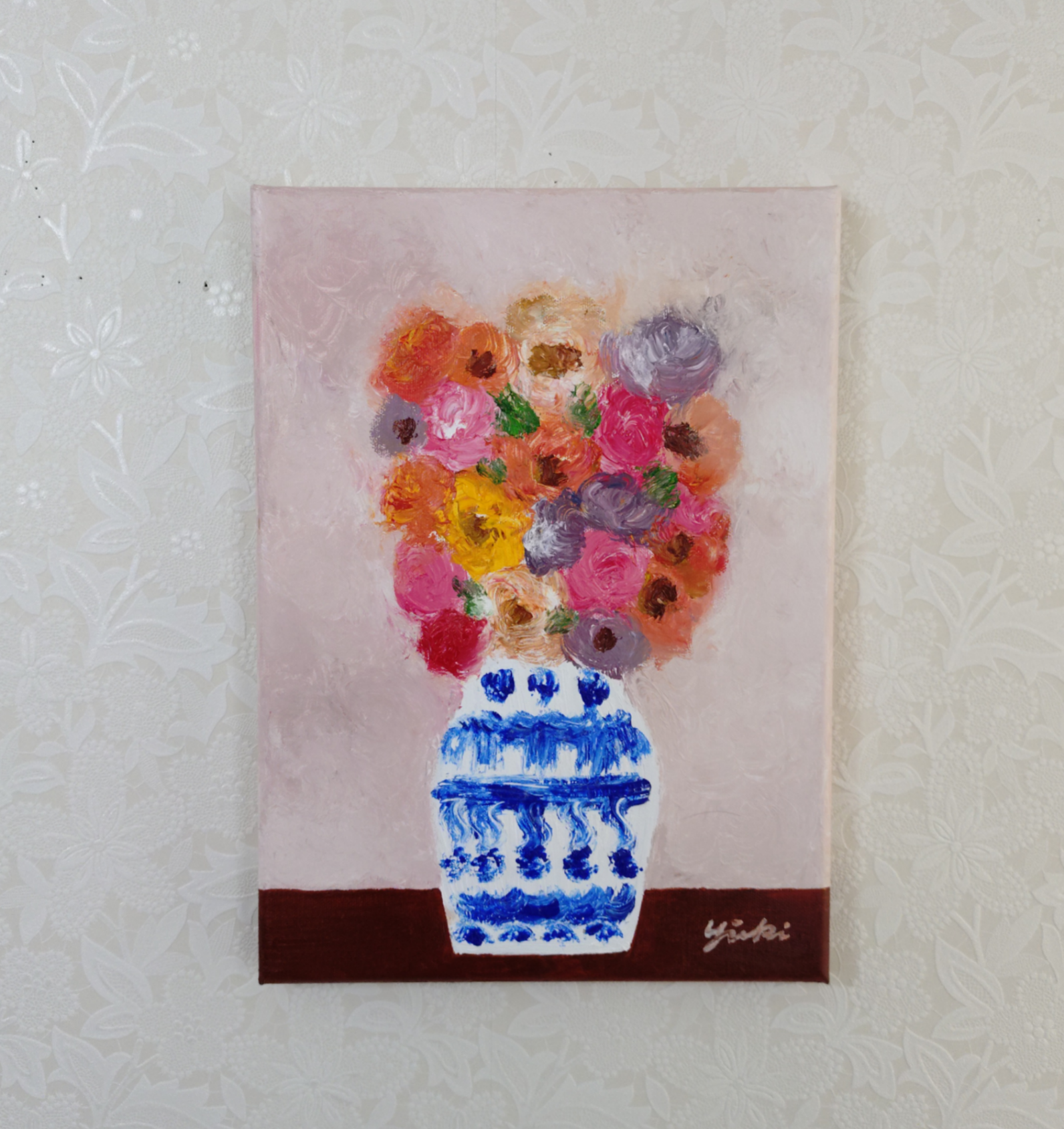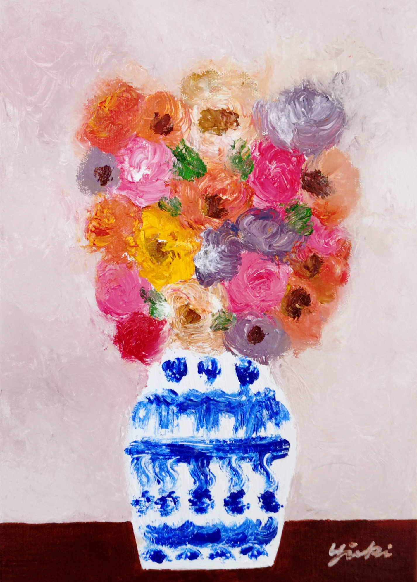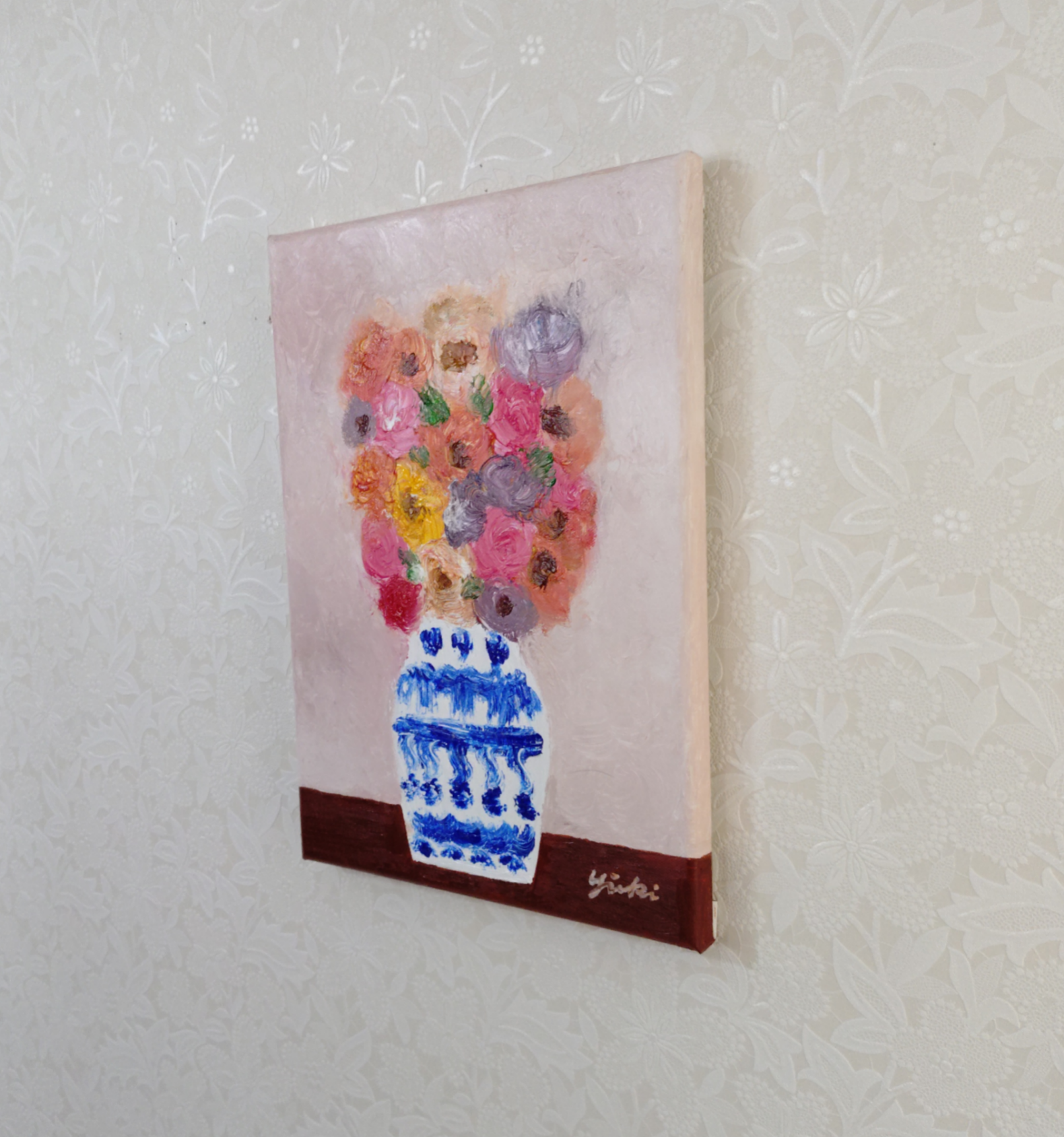 花瓶の花 静かな午後という作品は私がお仕事の合間に描く作品です。静かな午後、心静かに油彩と向き合い静かな時間を過ごすことが最近の私の主なルーティンとなっています。お花を飾ってその時その時違う表情を見せてくれる愛らしい花たちを眺めながら一作品一作品描いています。