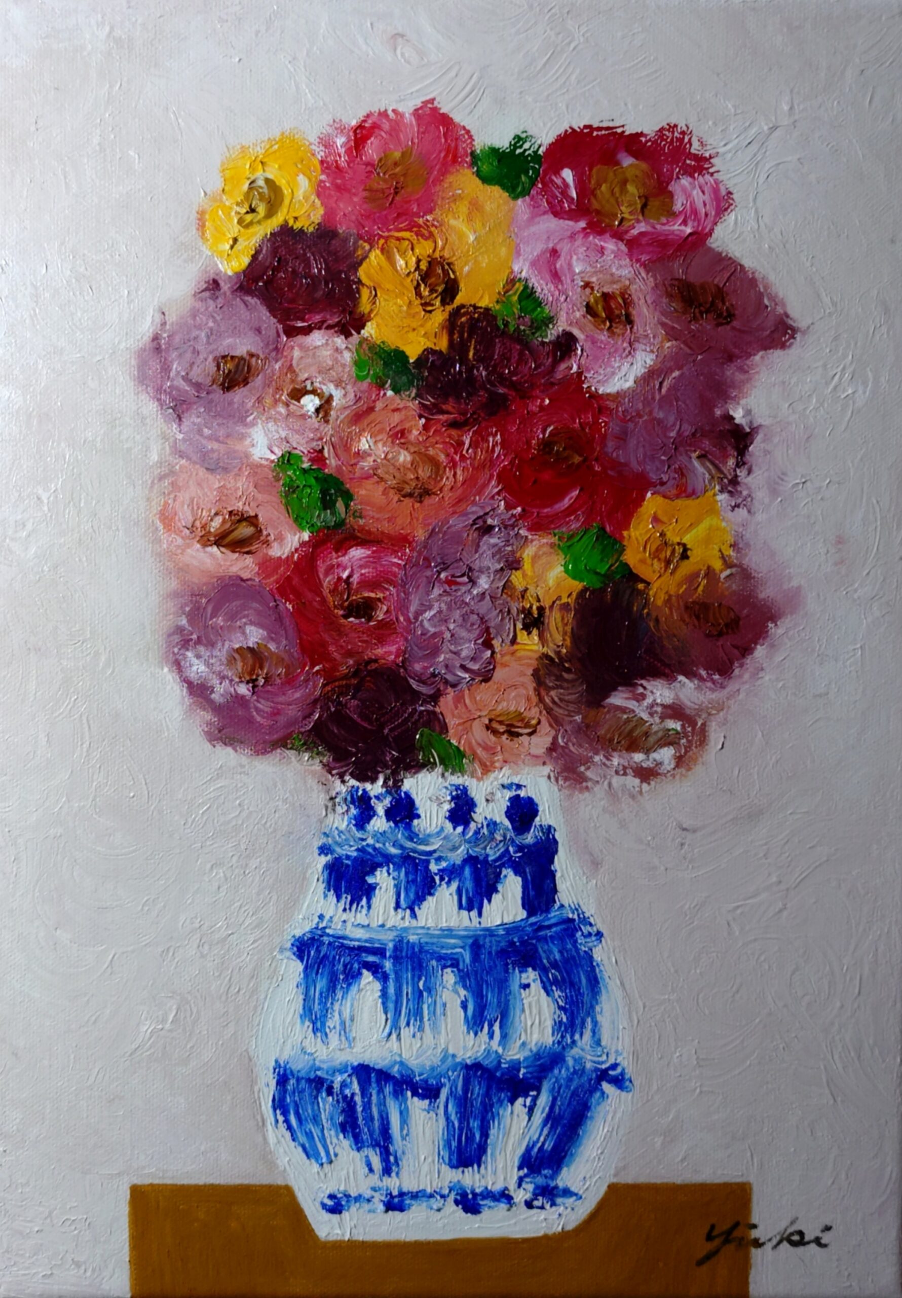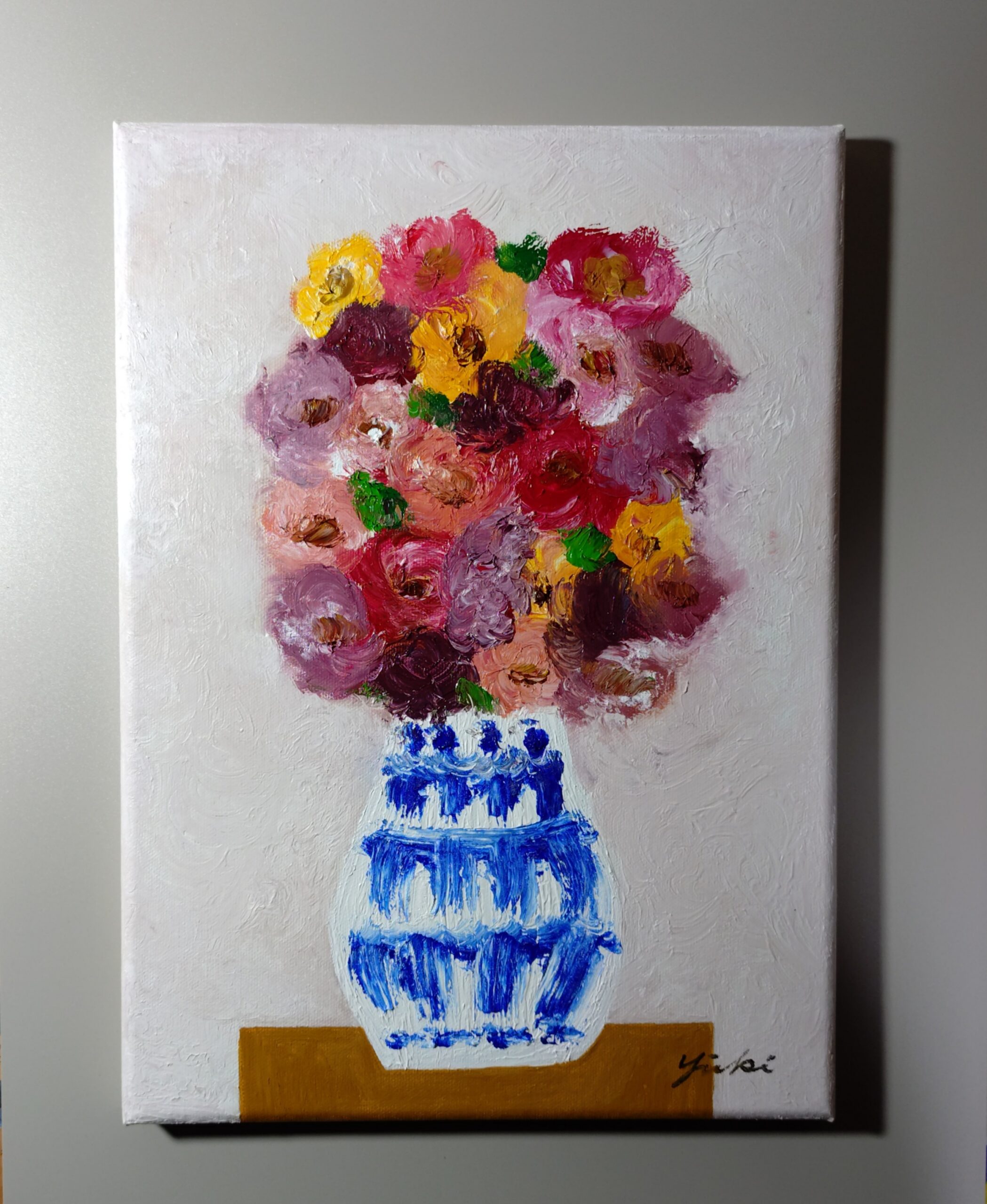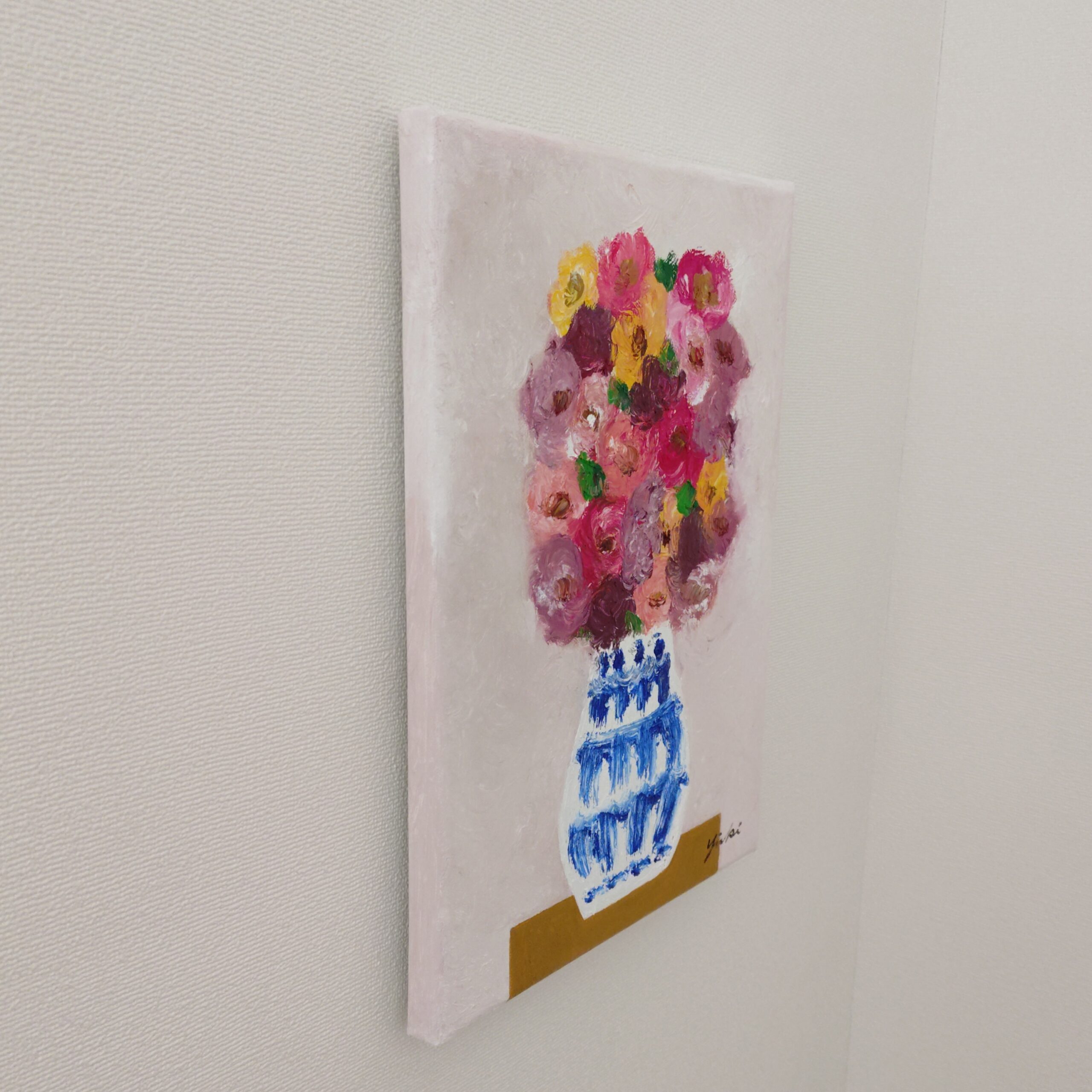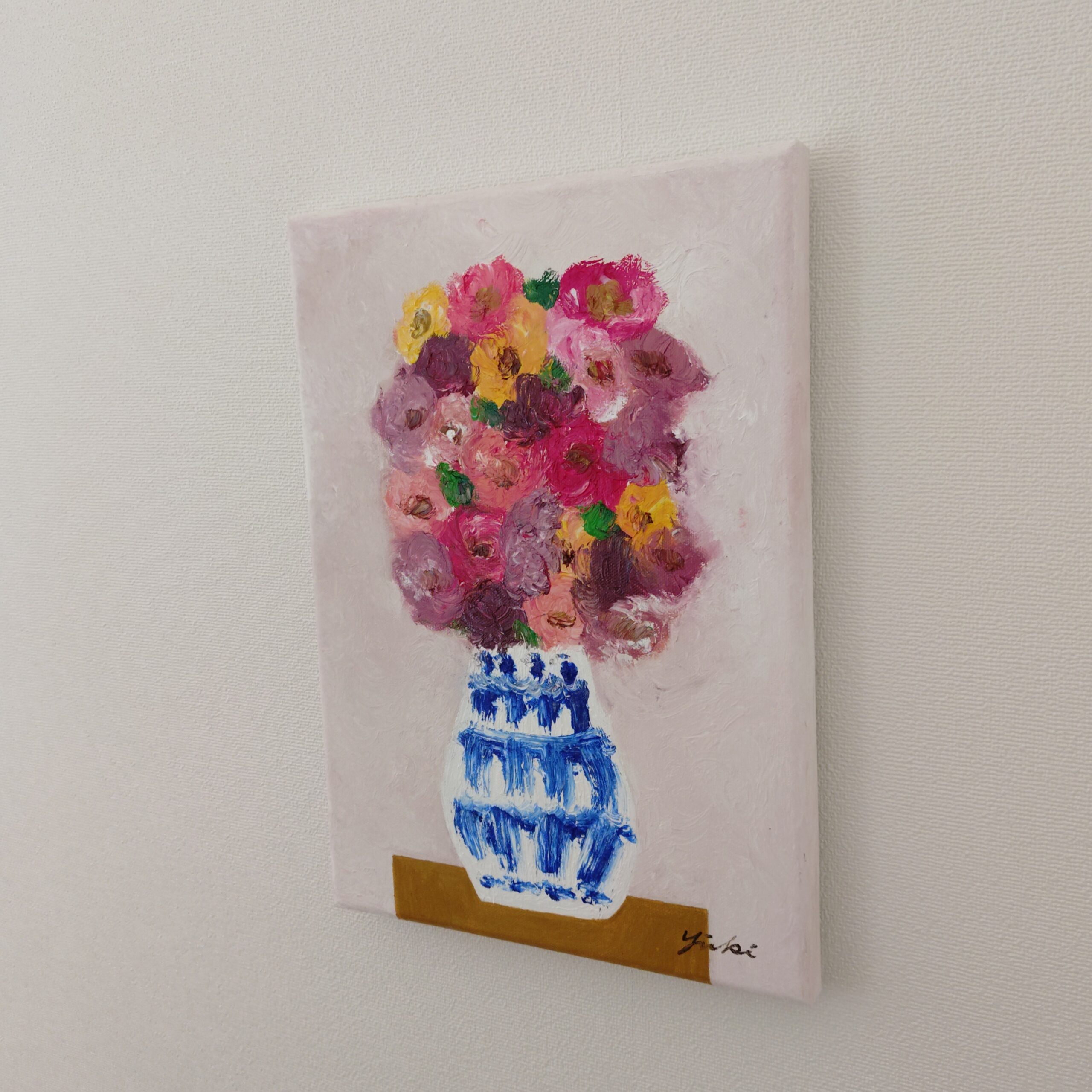 花瓶の花 静かな午後という作品は私がお仕事の合間に描く作品です。静かな午後、心静かに油彩と向き合い静かな時間を過ごすことが最近の私の主なルーティンとなっています。お花を飾ってその時その時違う表情を見せてくれる愛らしい花たちを眺めながら一作品一作品描いています。