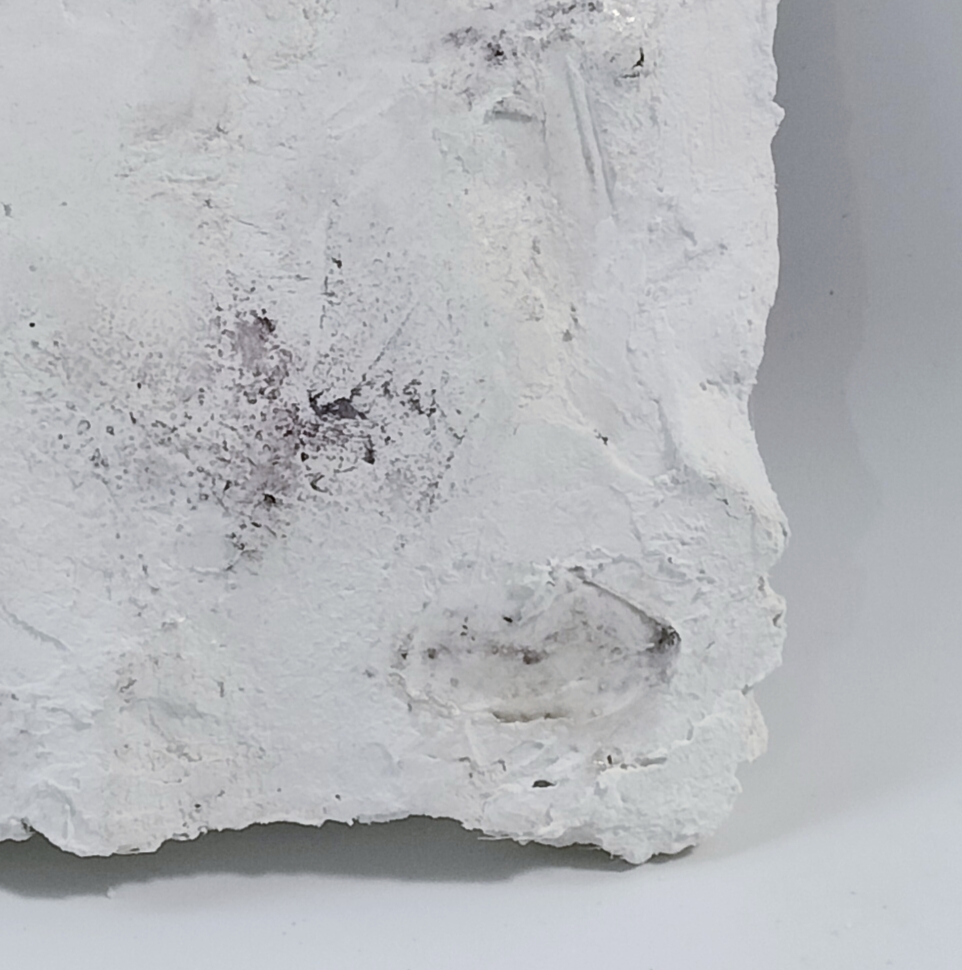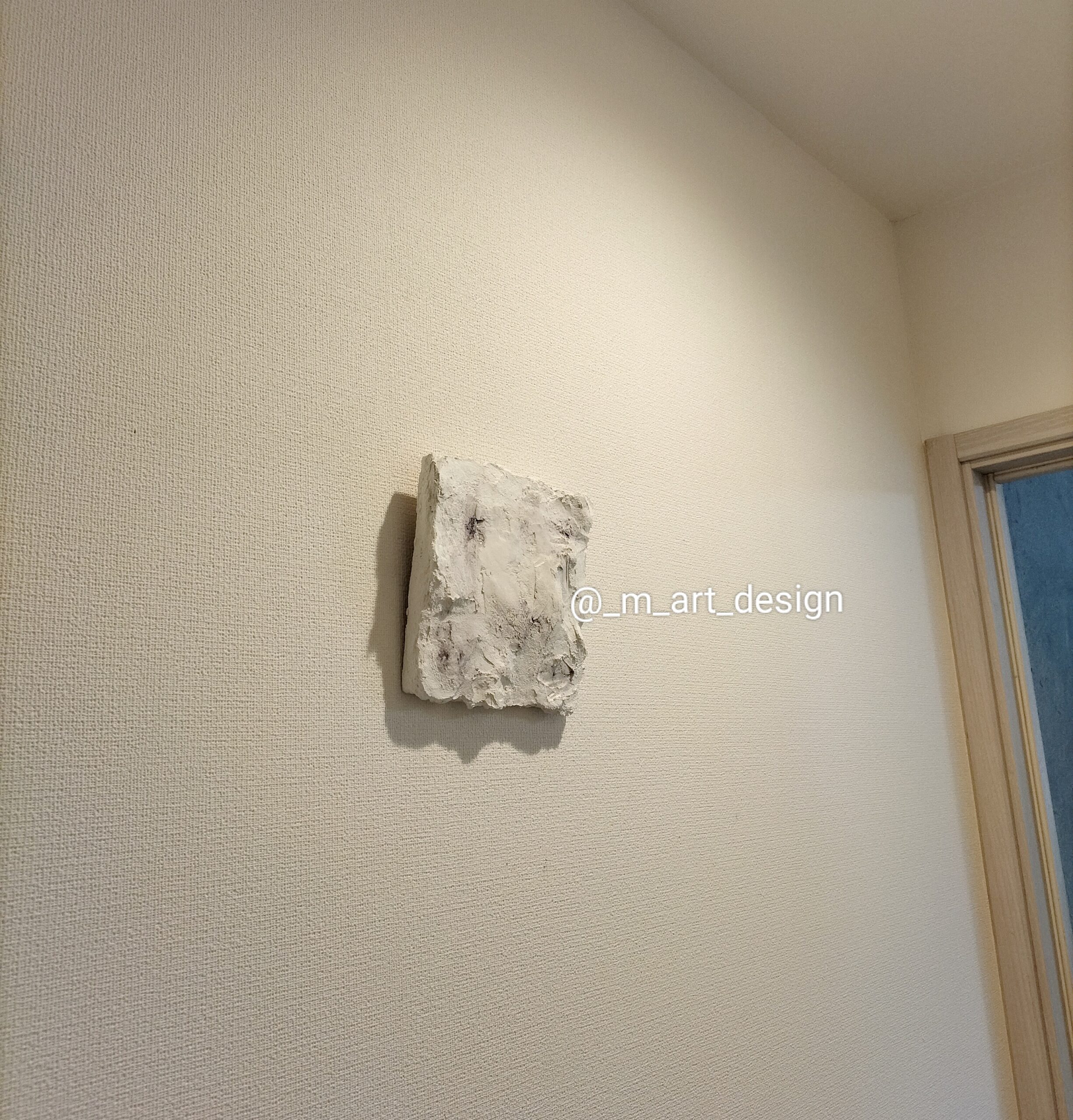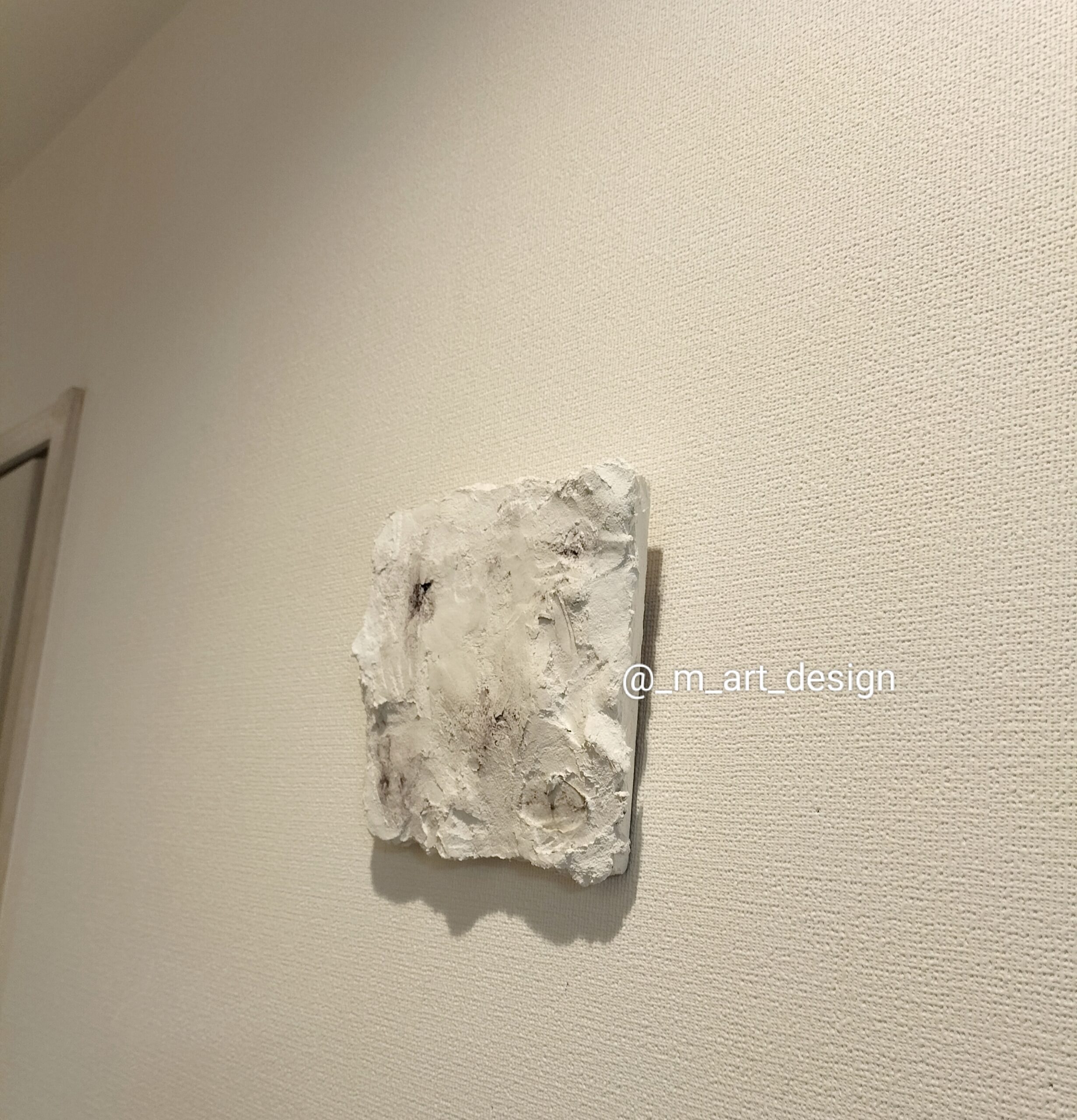 光や時間によって表情を変え、人や空間とともに呼吸する天然漆喰にやさしく溶け込んだウニ殻顔料。空間に飾ったその時から静かな生命の記憶と息遣いを感じられます。