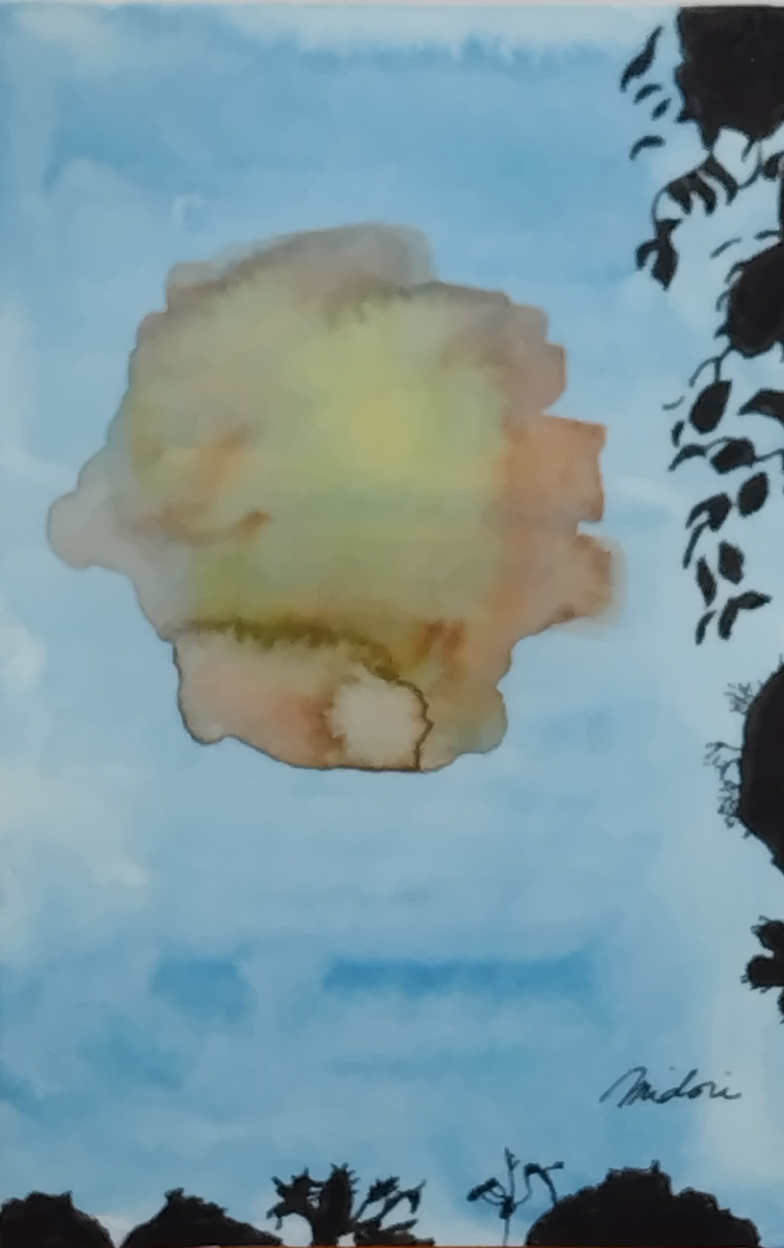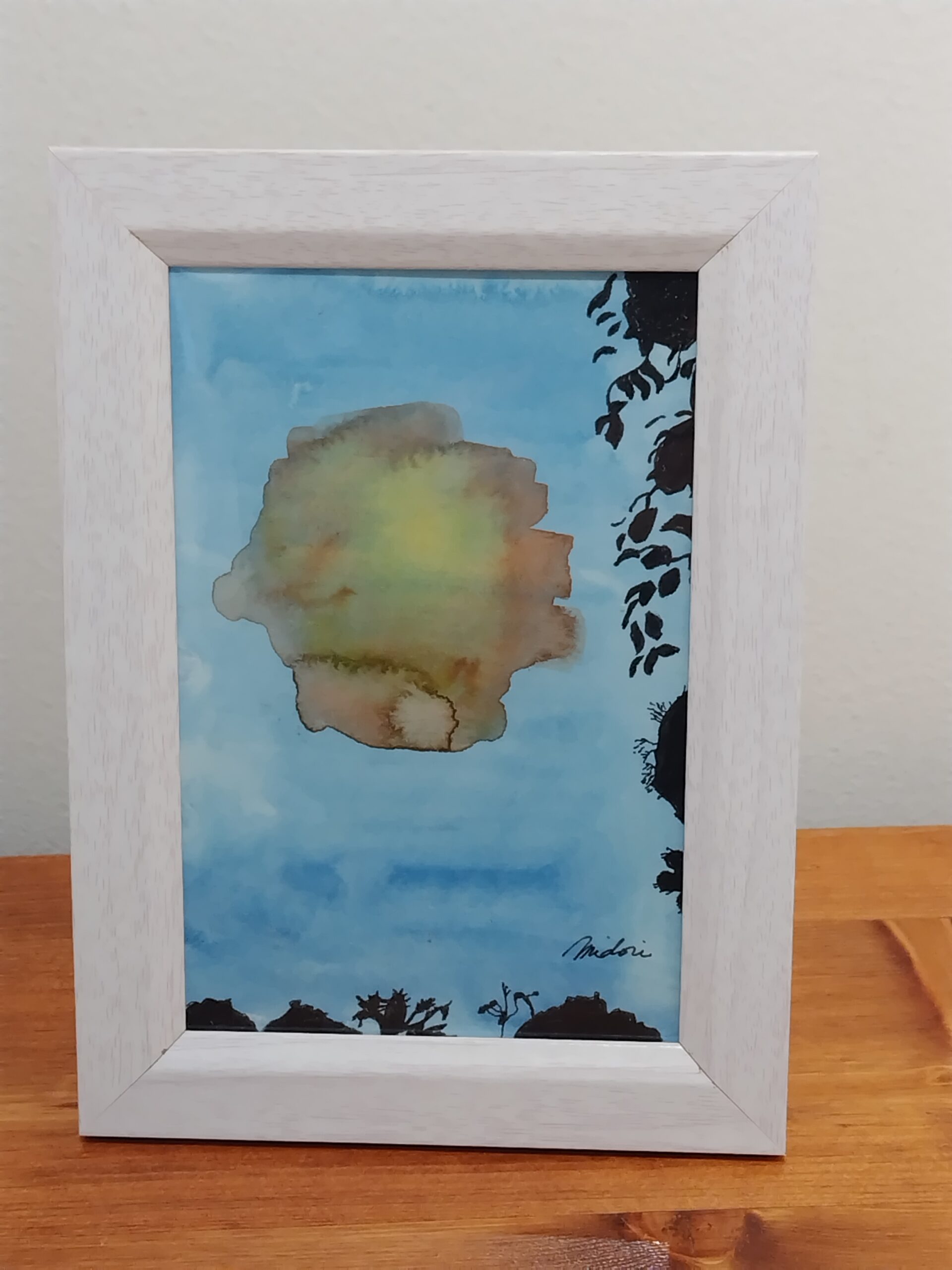 空を見上げると太陽がまぶしく、木々で切り取って描きました。水彩の鮮やかさとペンの黒色の対比をお楽しみいただければ嬉しいです。