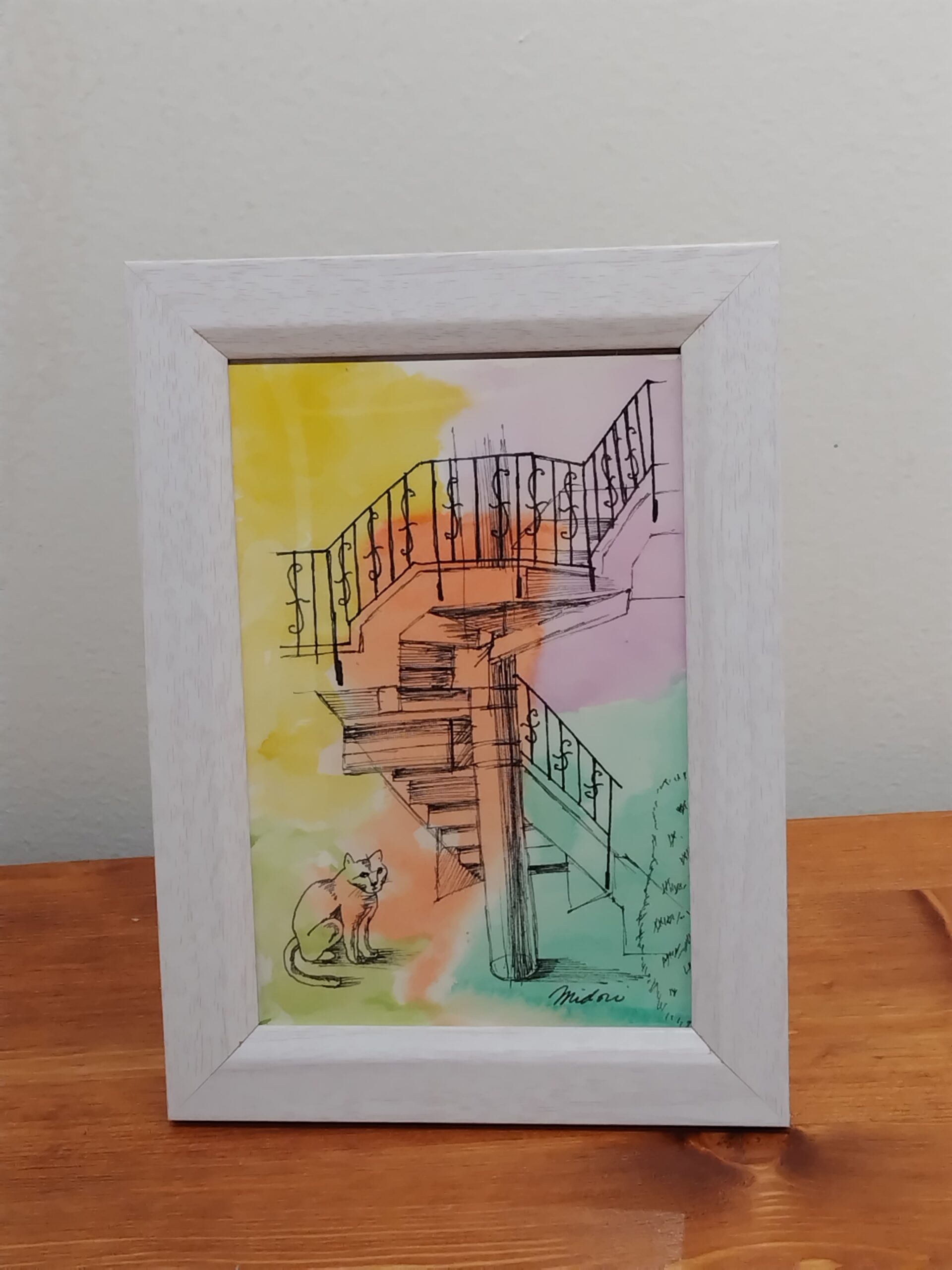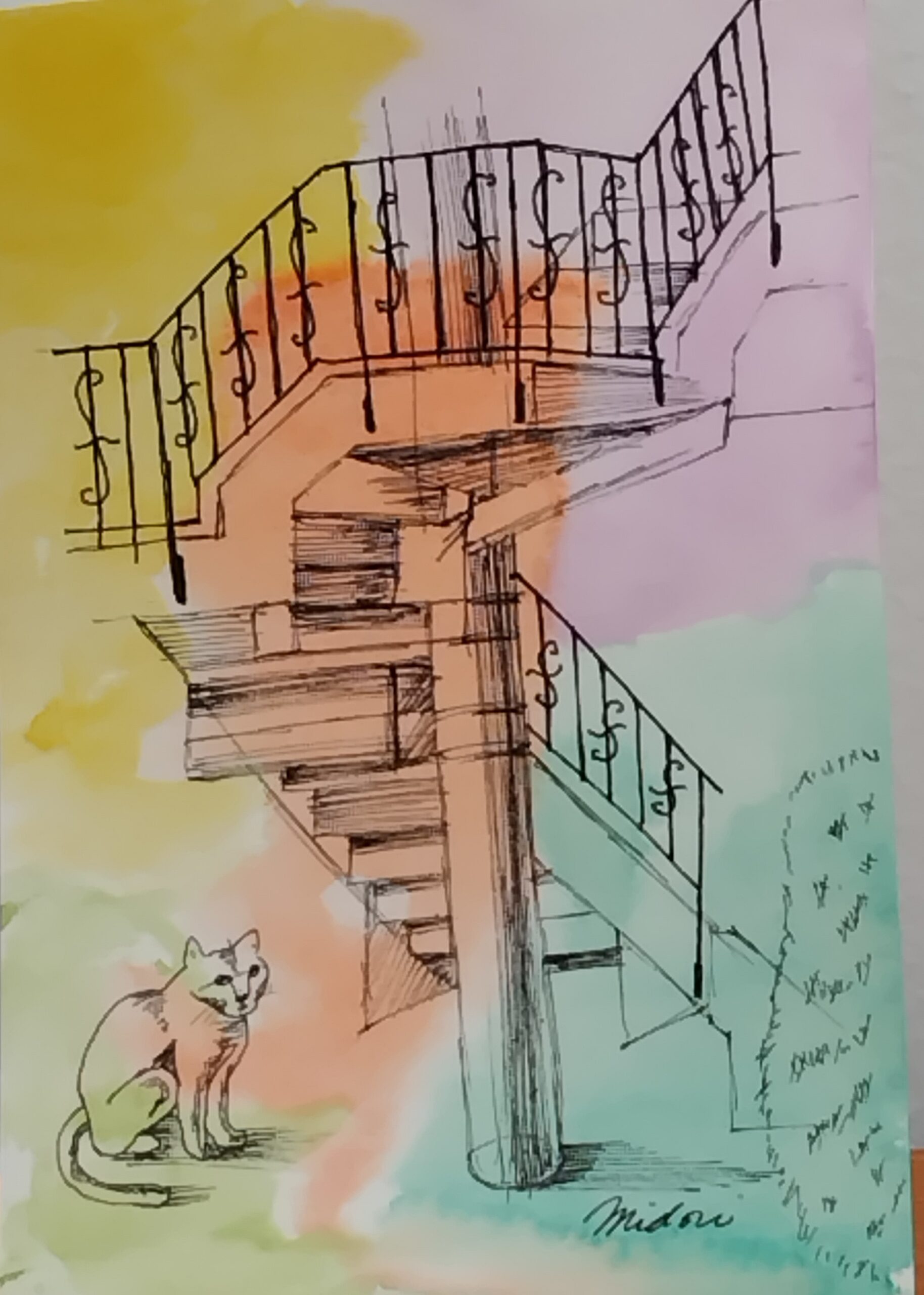 お洒落ならせん階段を描き、下に猫を配置しました。水彩の鮮やかさとペンの黒色の対比をお楽しみいただければ嬉しいです。