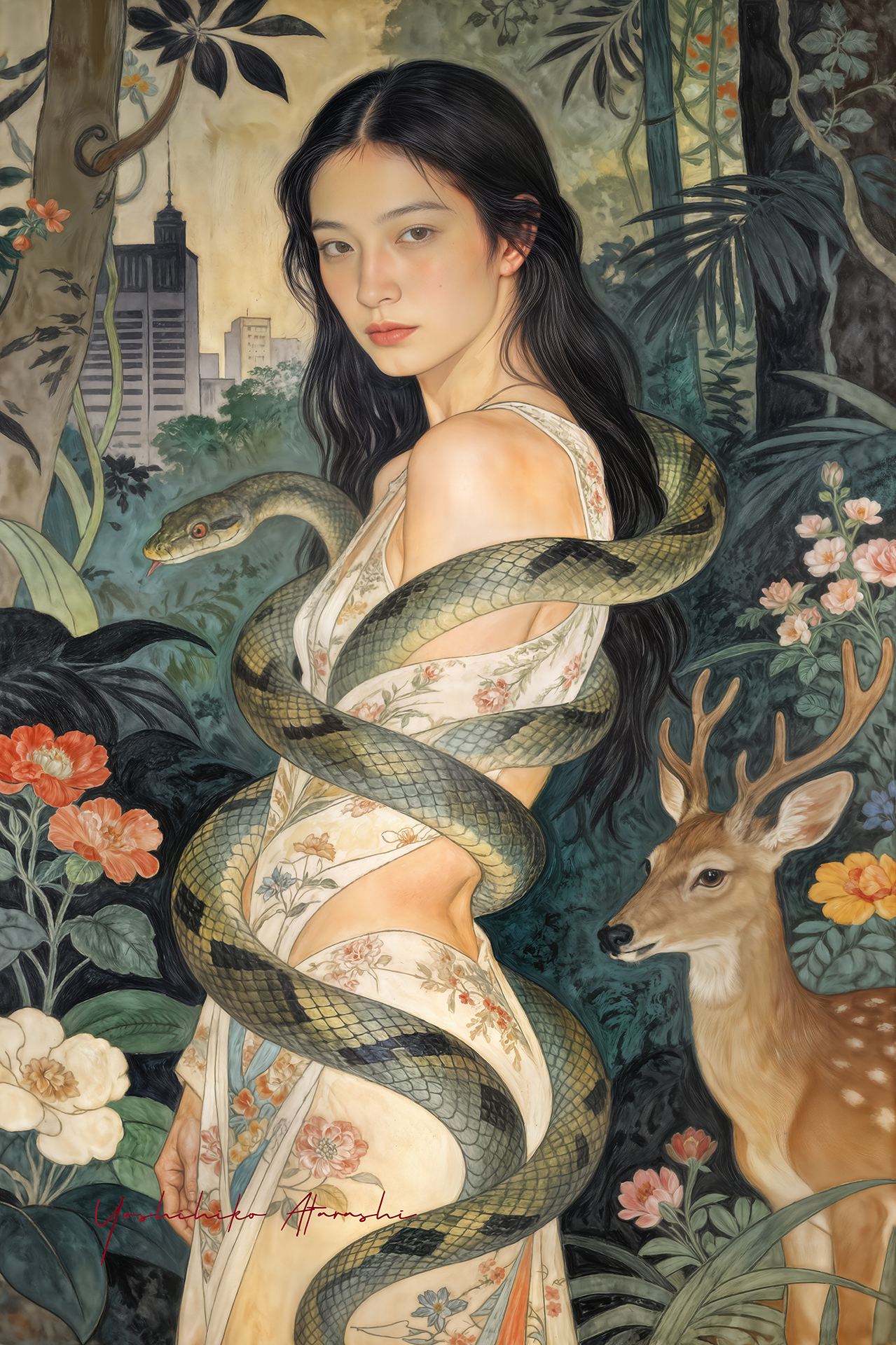 これらの作品は、自然と人、そして都市の気配が静かに重なり合う瞬間を描いています。蛇や植物、鹿といった象徴的なモチーフは、生命の循 環や内なる欲望、再生のイメージとして配置しました。曲線を強調した人体表現と装飾的な画面構成は、日本画や装飾絵画の影響を意識しつ つ、現代的な感性で再構成しています。見る人が物語を読み取るのではなく、時間や感情の揺らぎを画面の中で漂わせることを大切にしまし た。