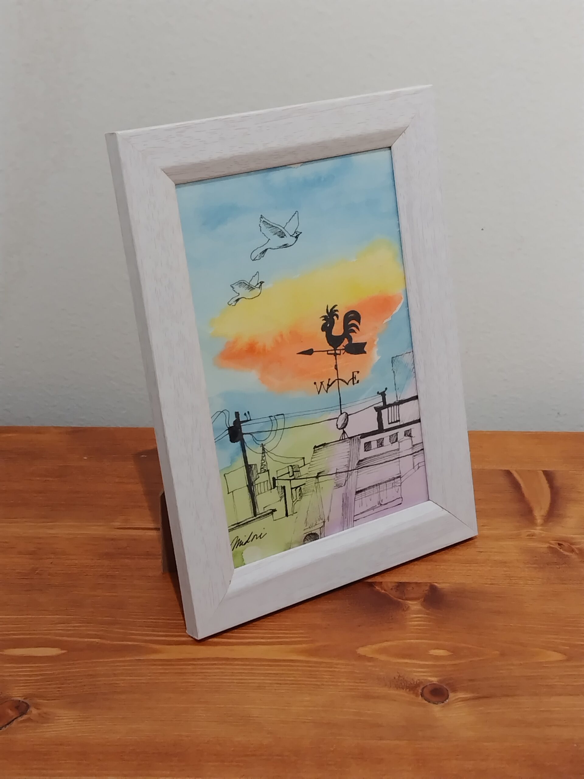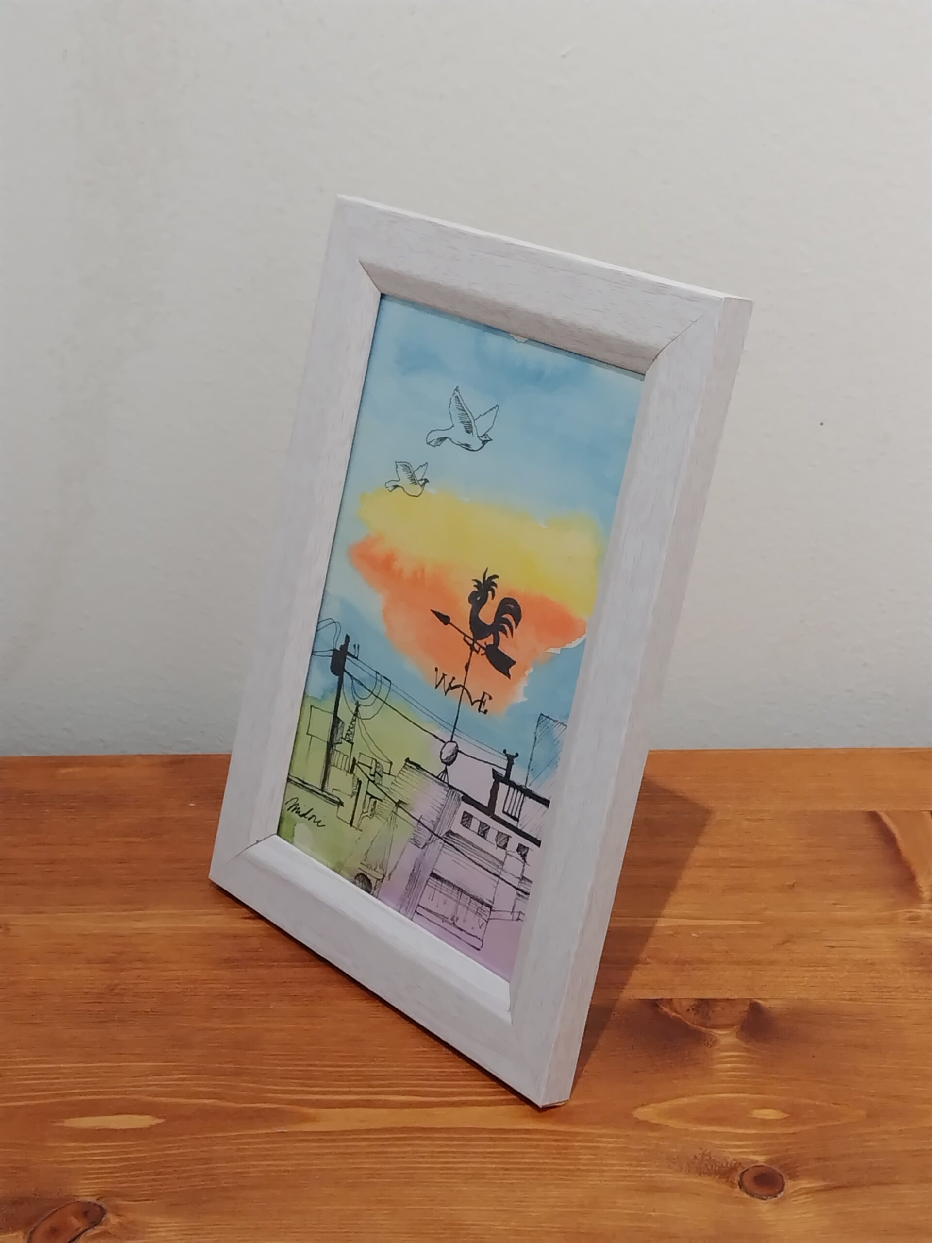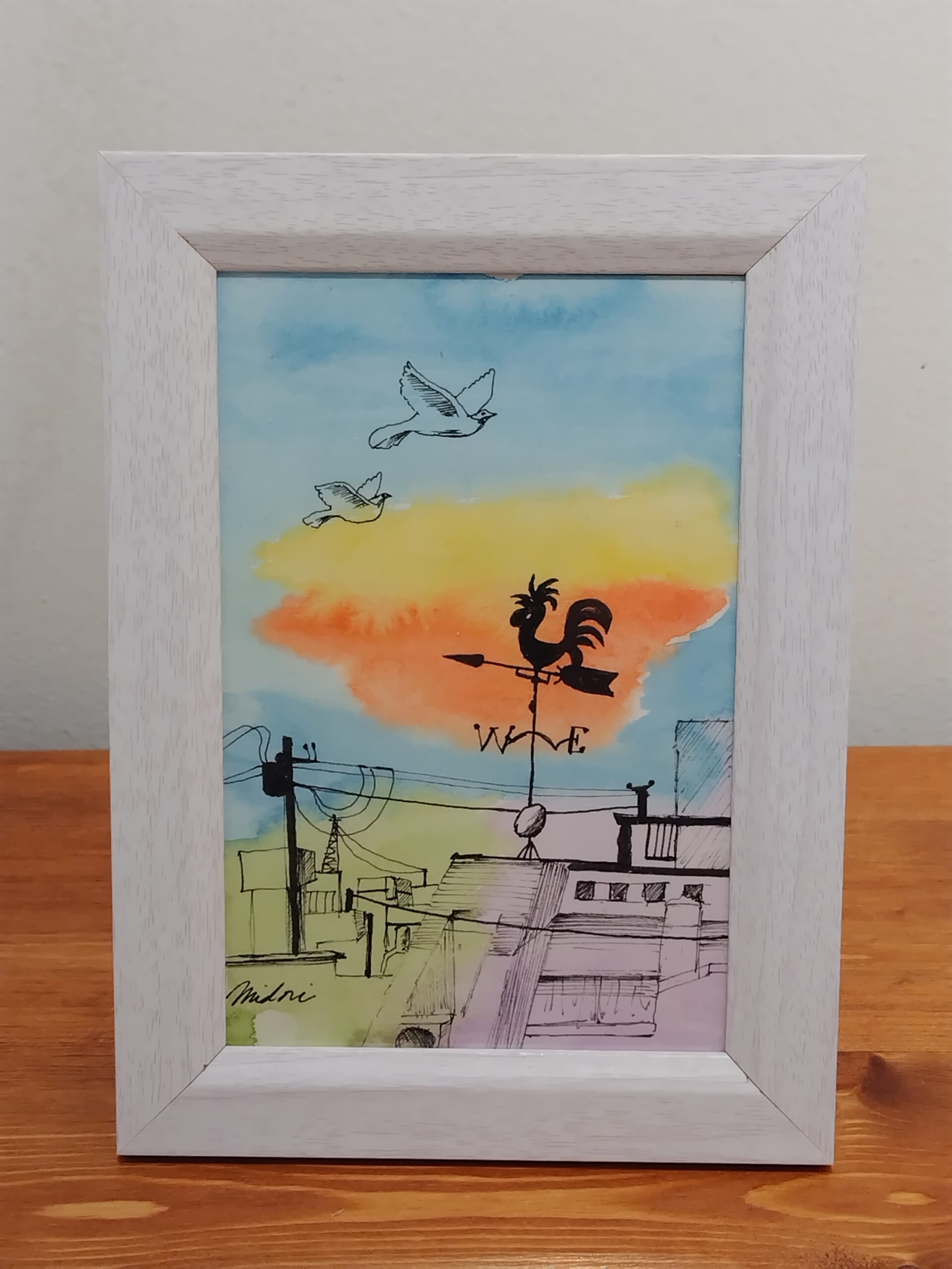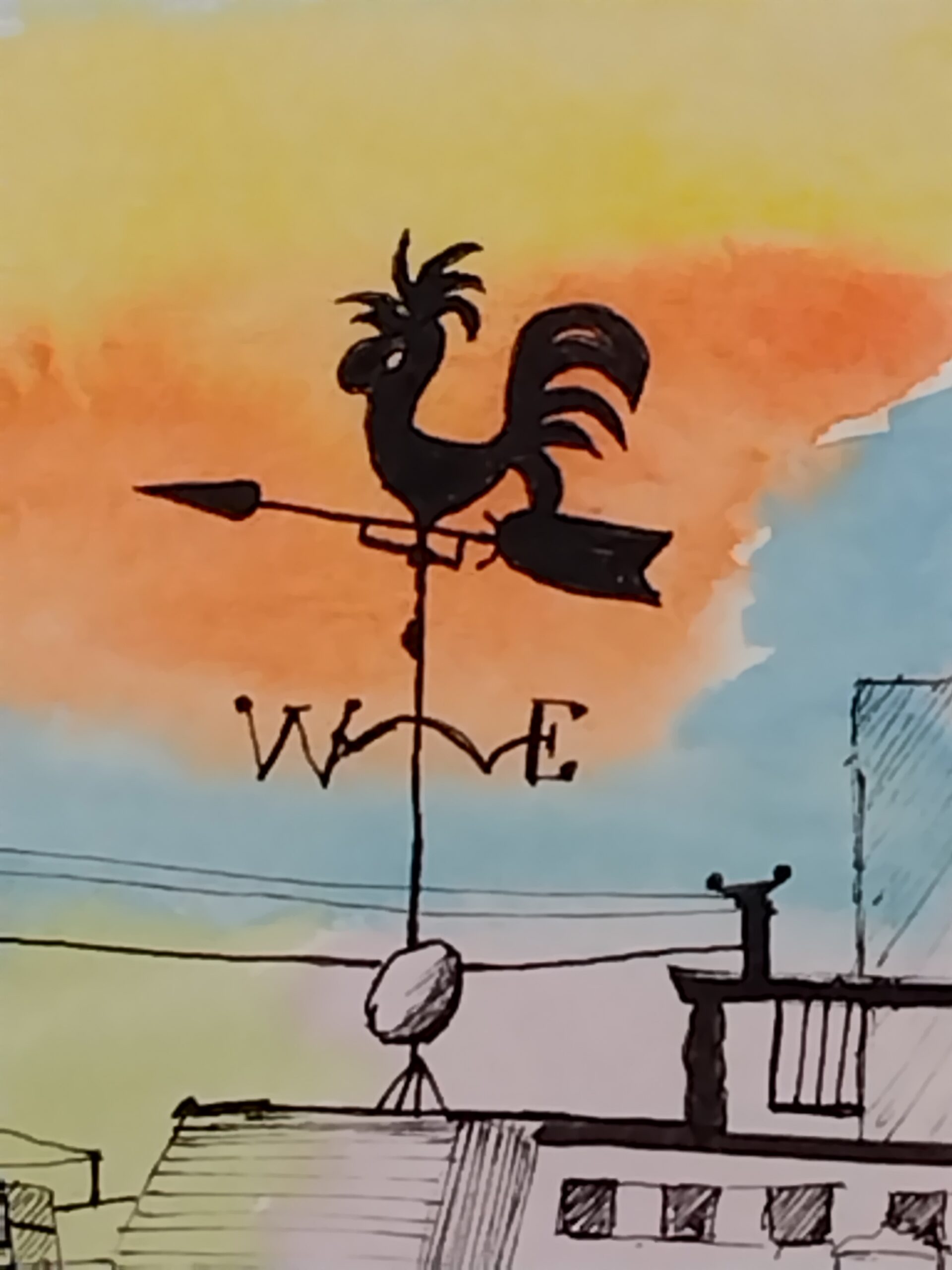 風見鶏のある街並みを描きました。水彩の鮮やかさとペンの黒色の対比をお楽しみいただければ嬉しいです。