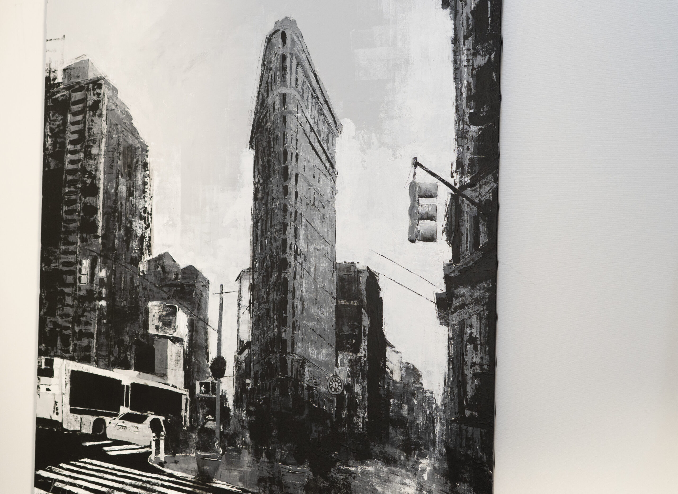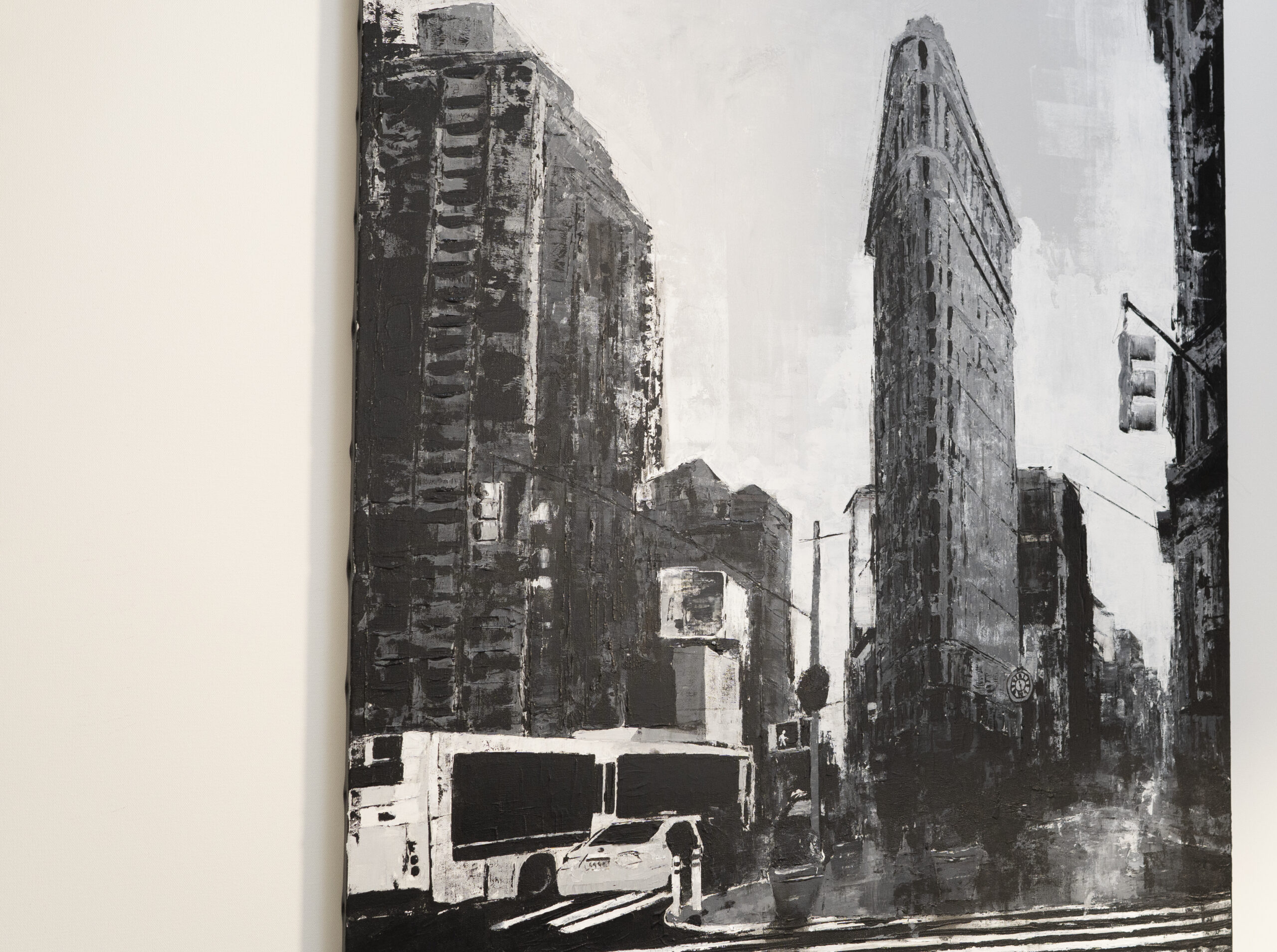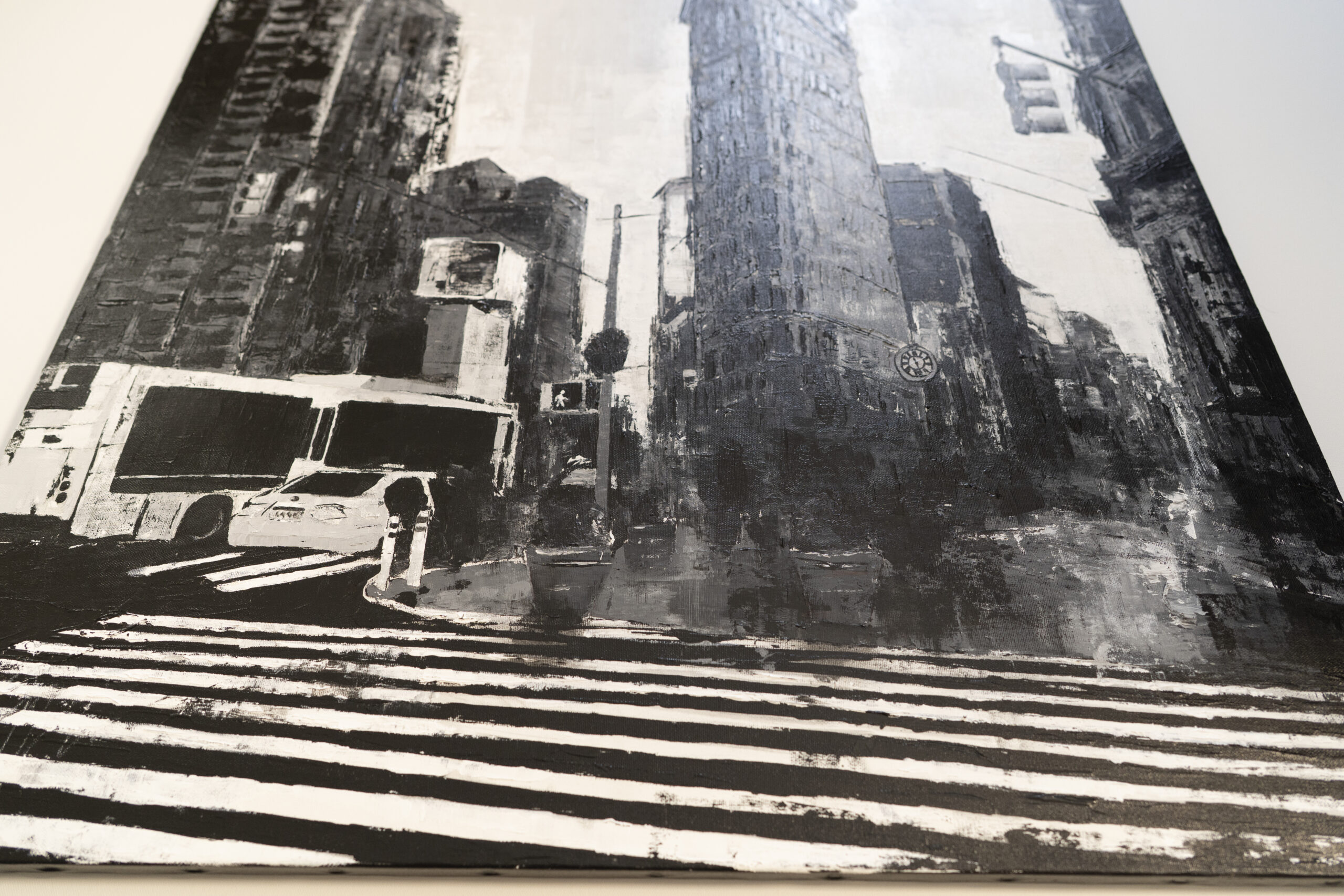 大きめサイズのキャンバスにマンハッタンの街並みをモノクロで制作されています。写真とは違うアートならではの独特な雰囲気がとても綺麗でかっこいい1点です。