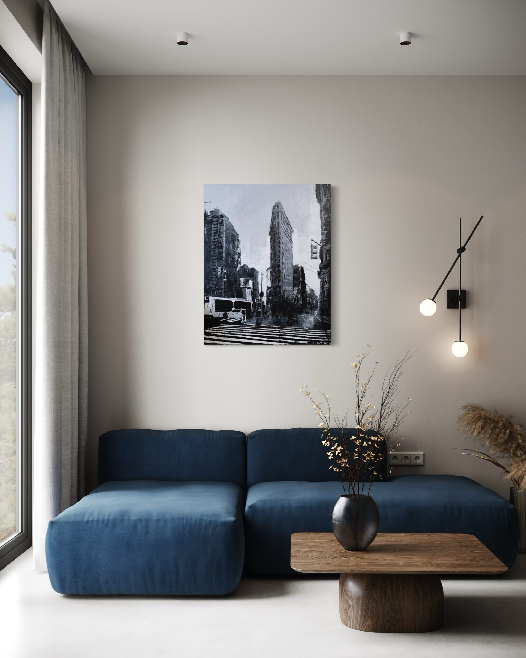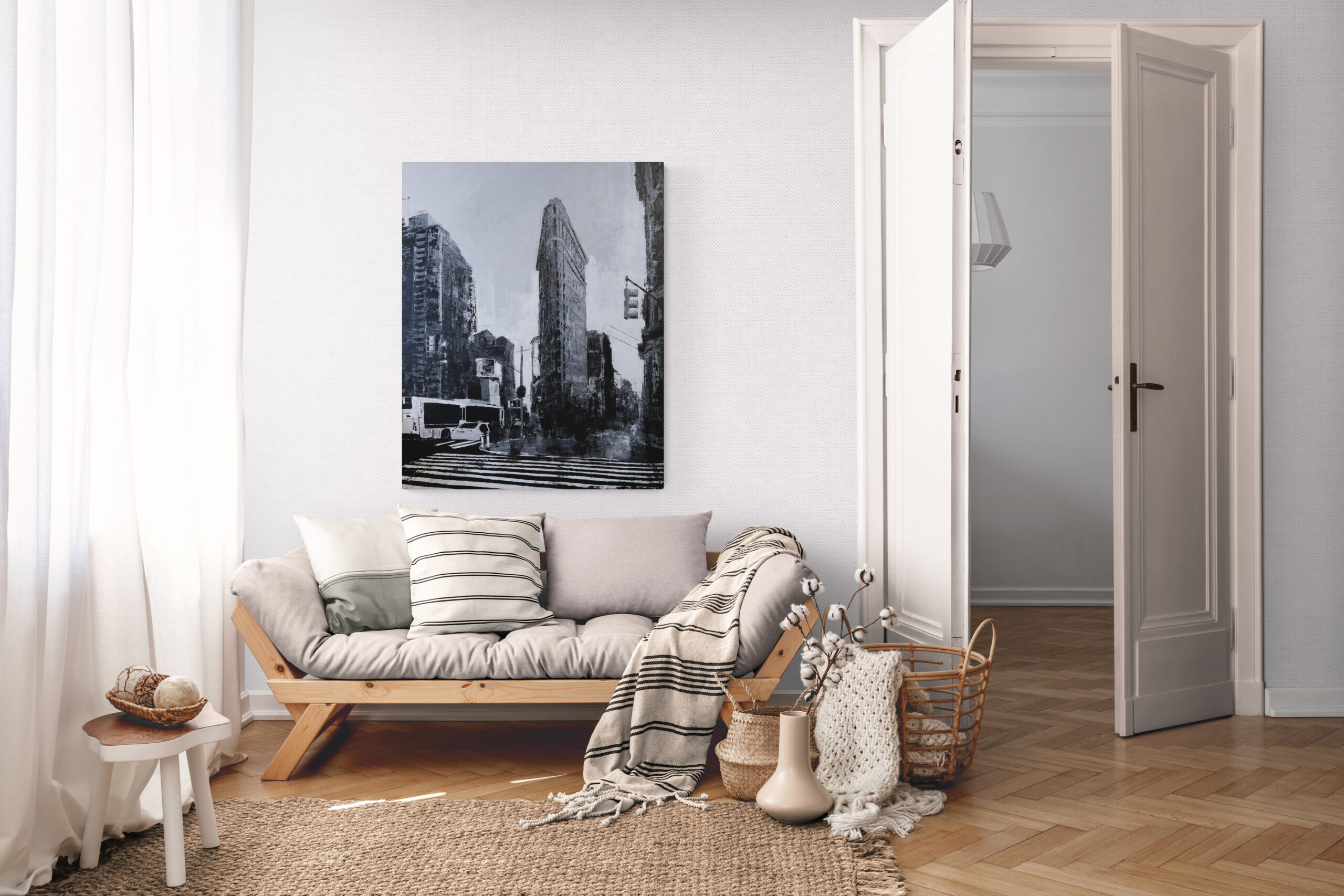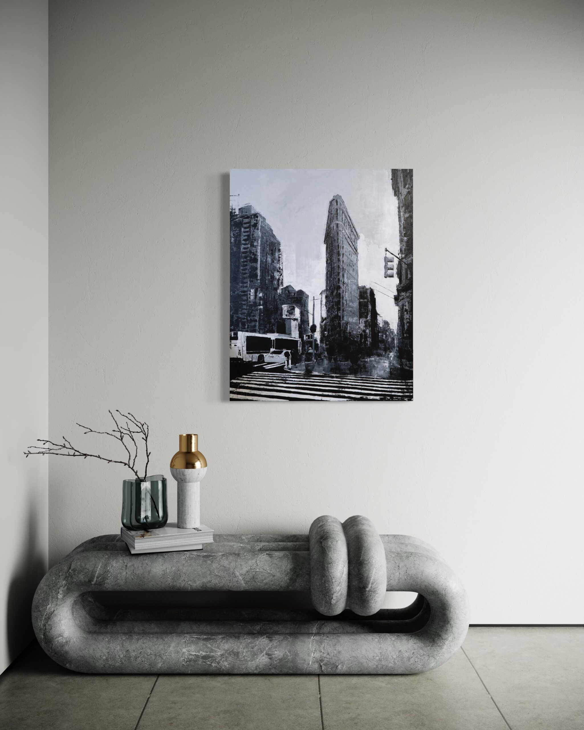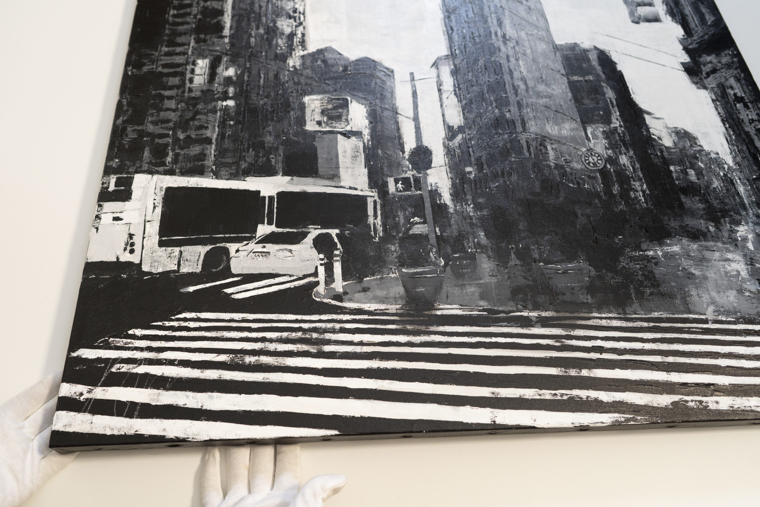 大きめサイズのキャンバスにマンハッタンの街並みをモノクロで制作されています。写真とは違うアートならではの独特な雰囲気がとても綺麗でかっこいい1点です。