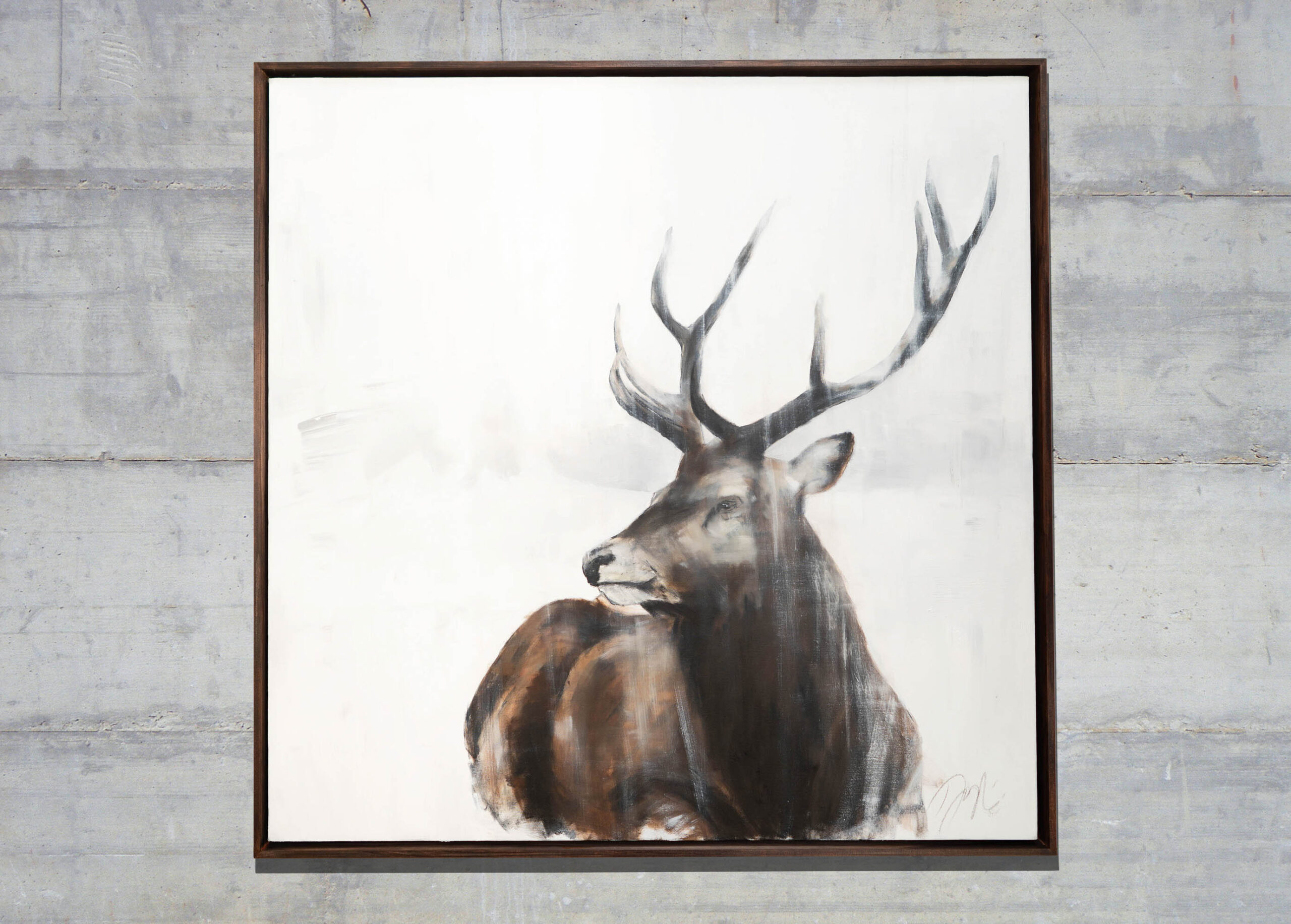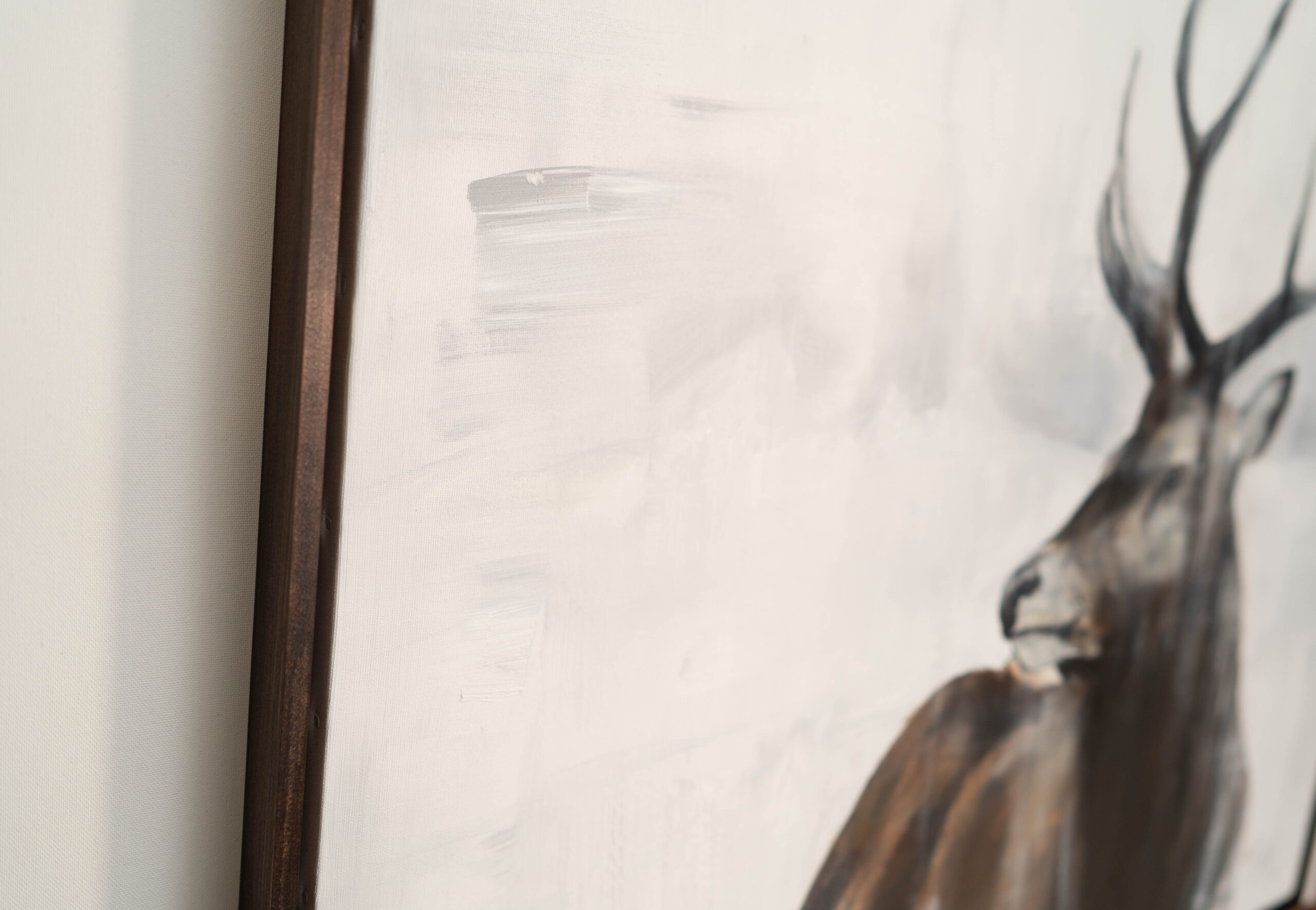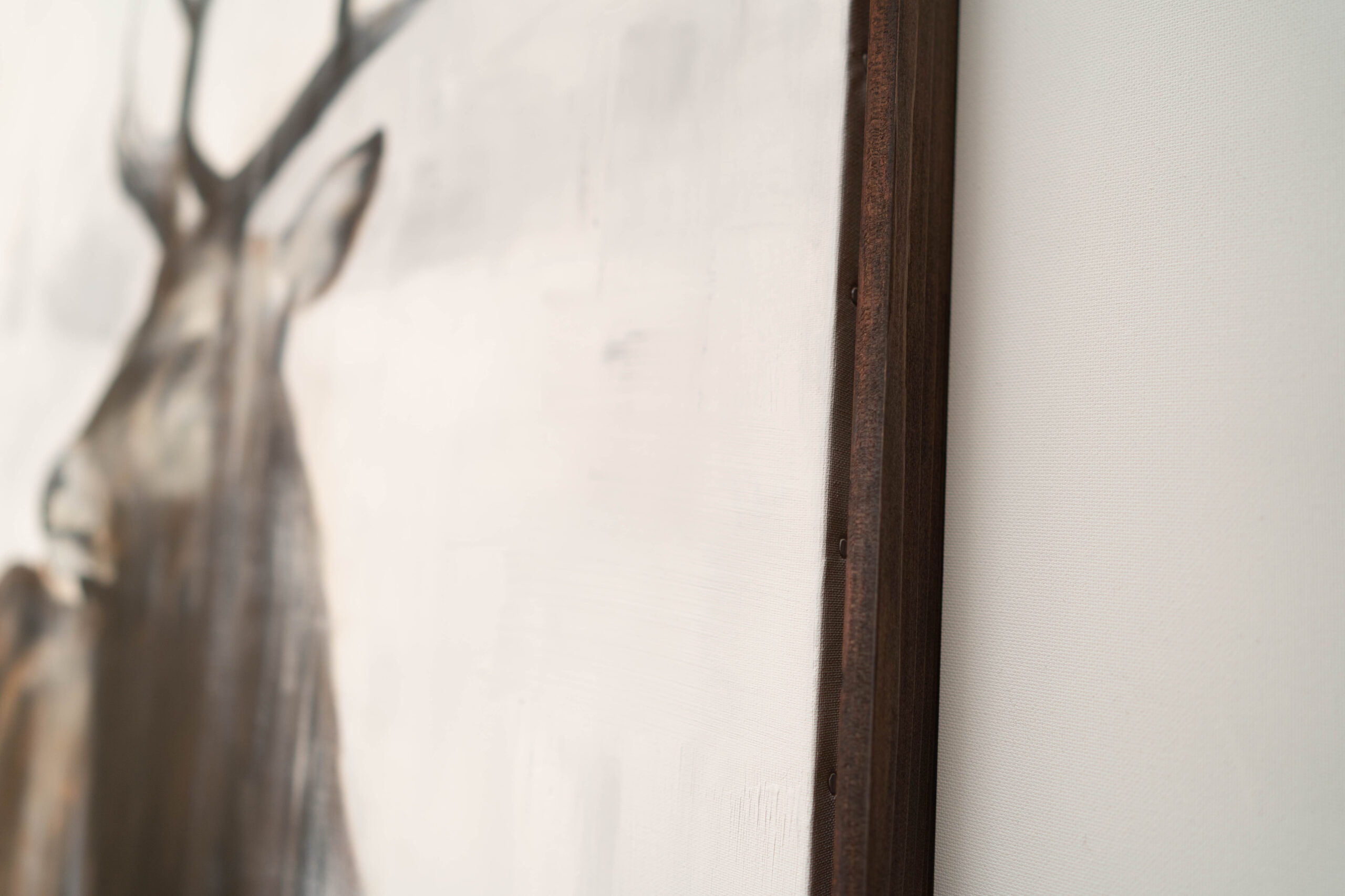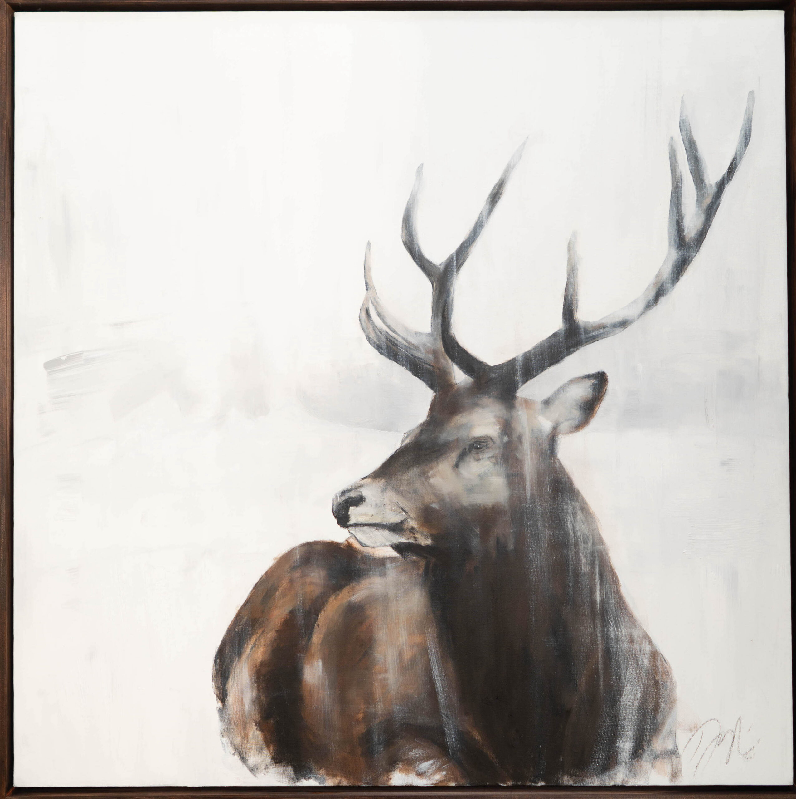 動物シリーズからトナカイの作品!雪の中佇むトナカイの姿を1メートル正方形キャンバスに表現した作品。とても美しく神々しく大変素敵な作品になっています。動物好きならずともおすすめの作品です。