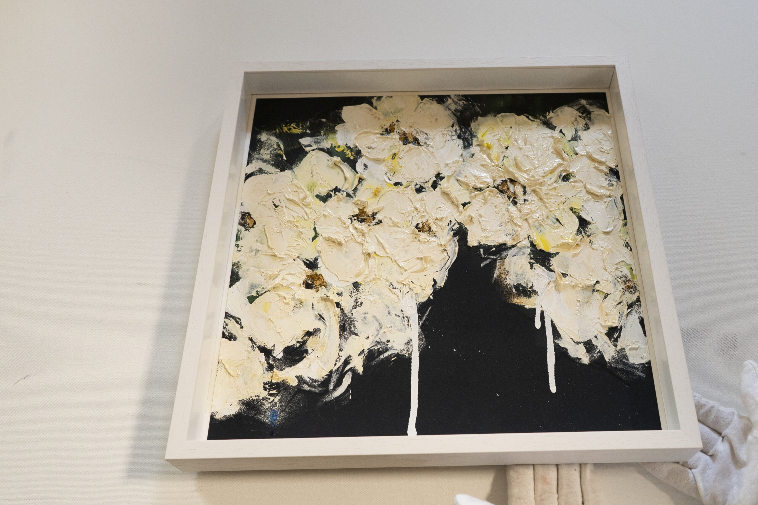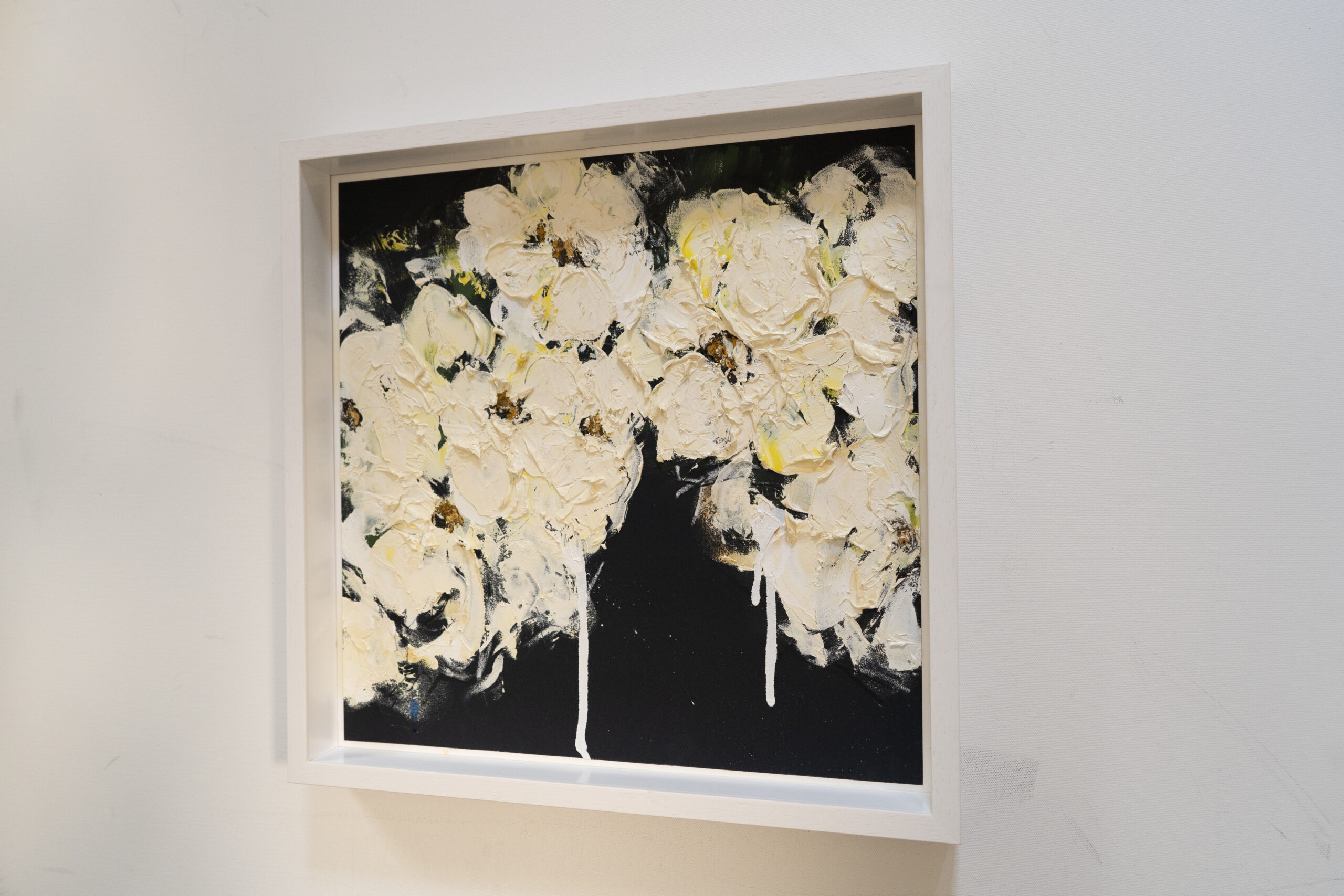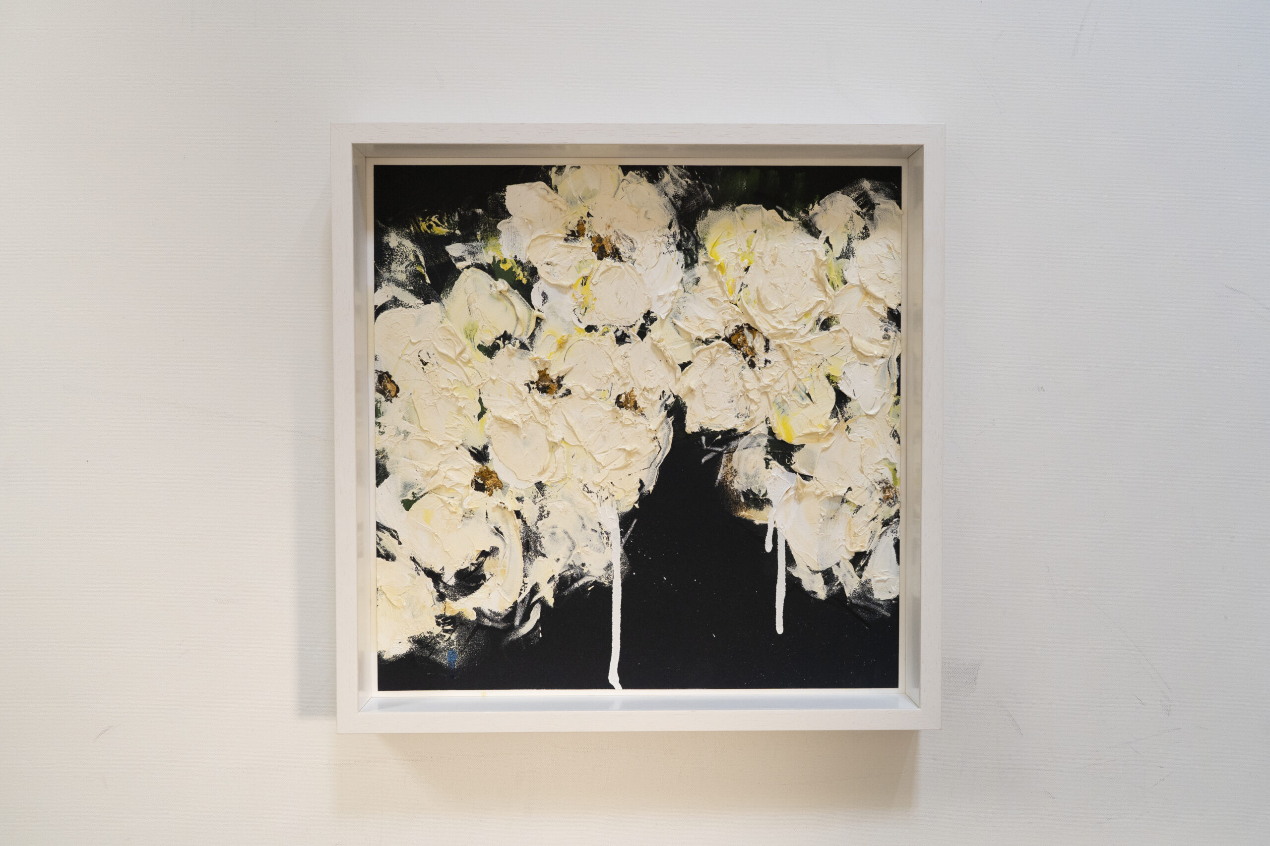 正方形の紙に制作された花の抽象画作品。こちらの作品は淡い白い花が印象的で