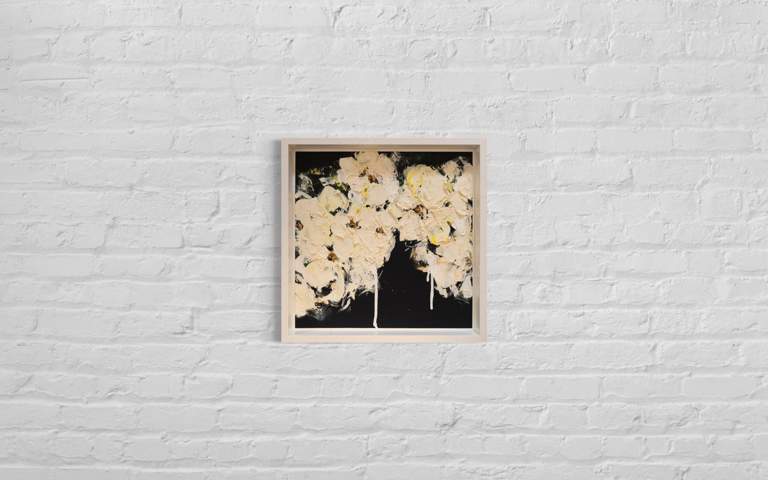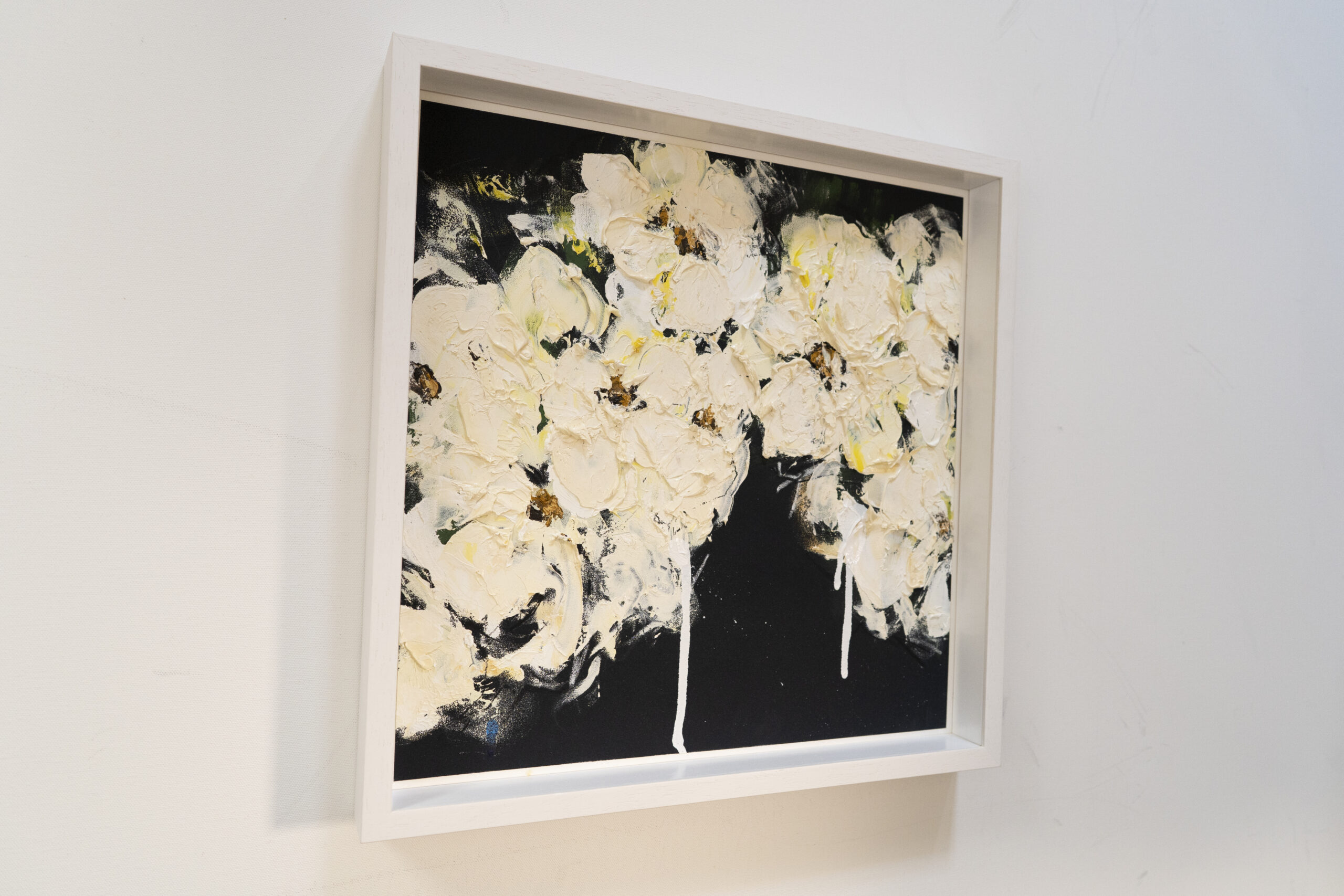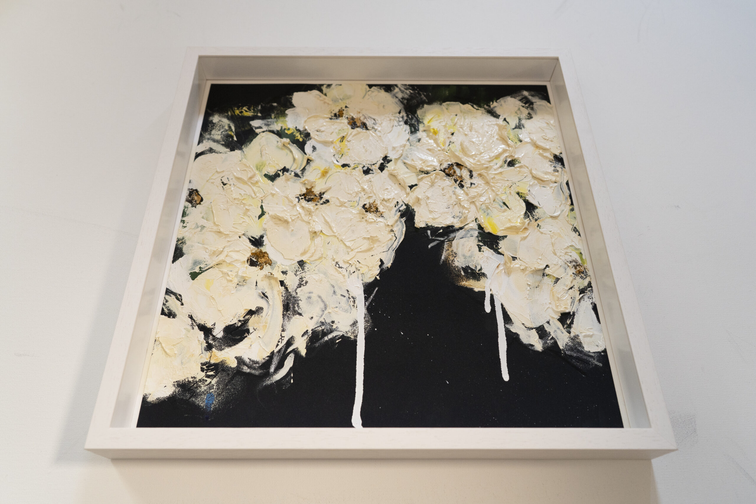 正方形の紙に制作された花の抽象画作品。こちらの作品は淡い白い花が印象的で