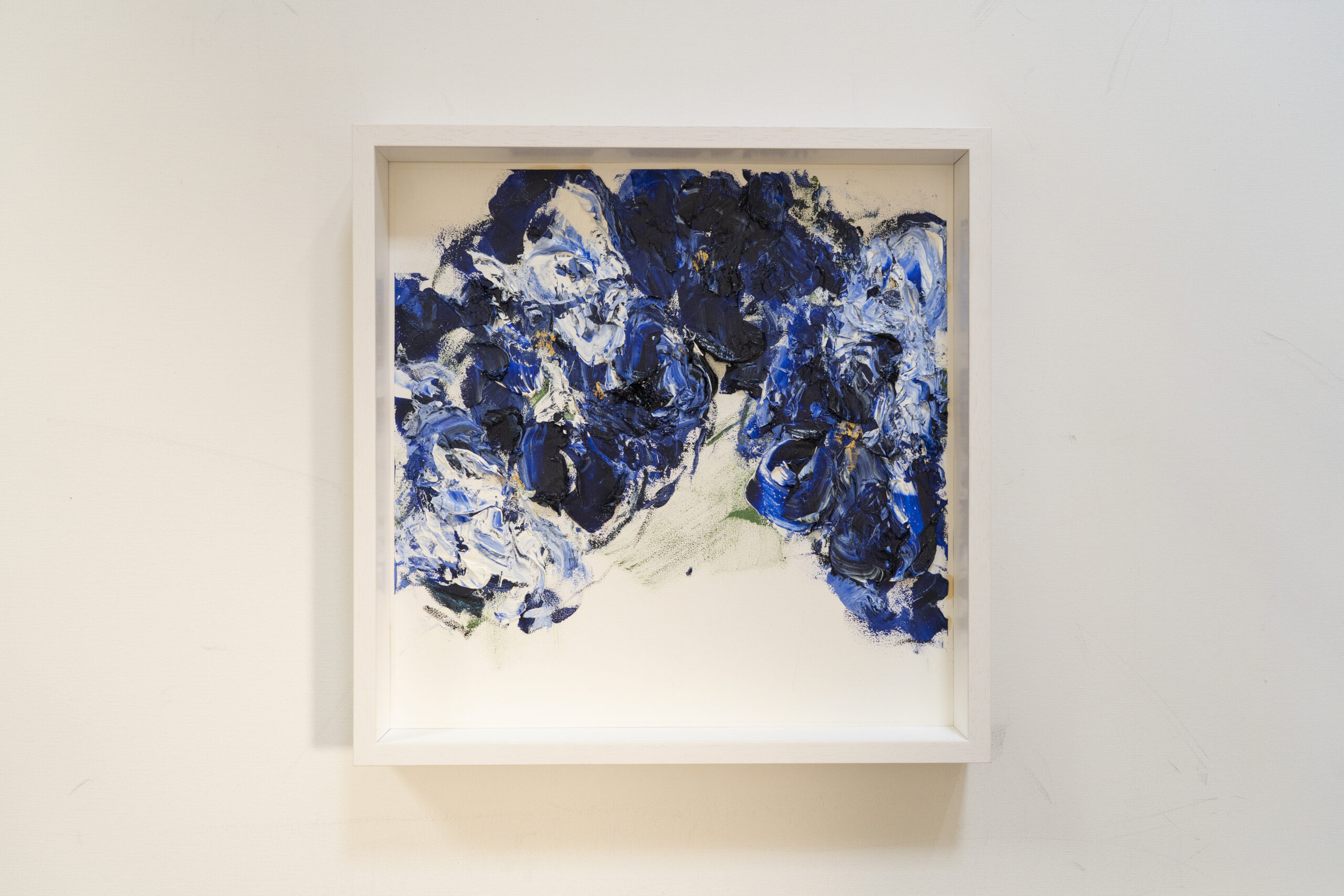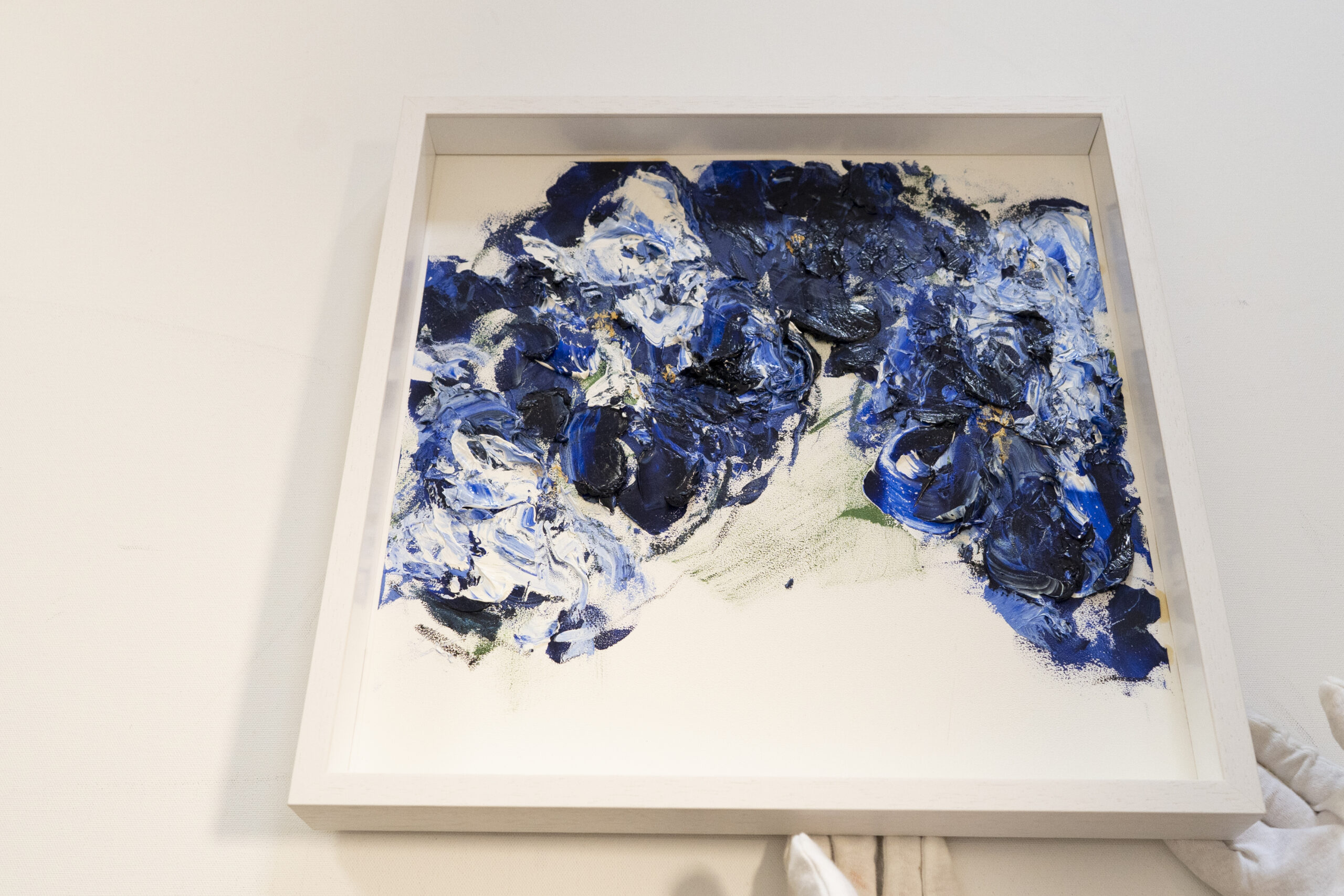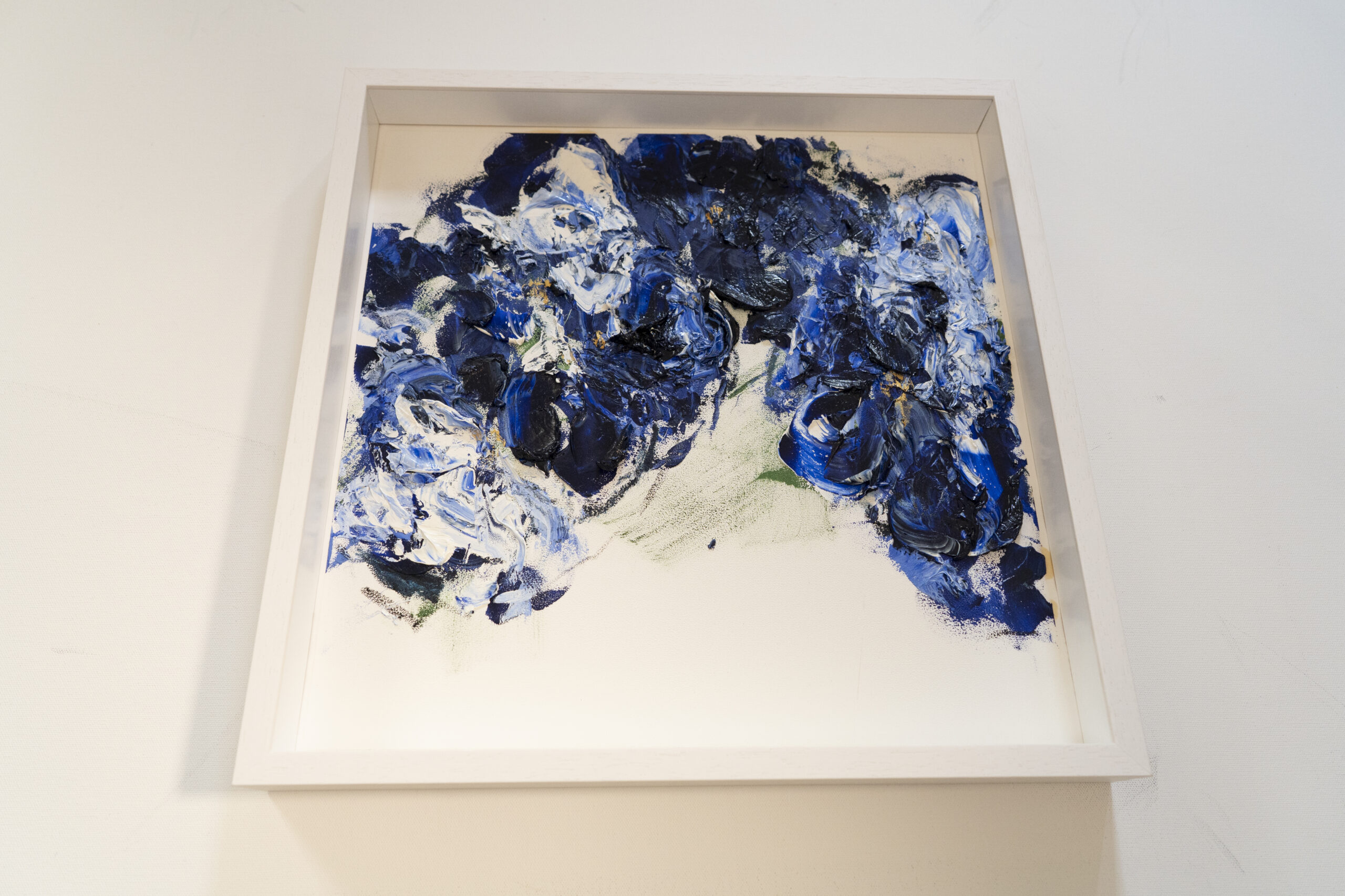 正方形の紙に制作された花の抽象画作品。こちらの作品は鮮やかな青が印象的で