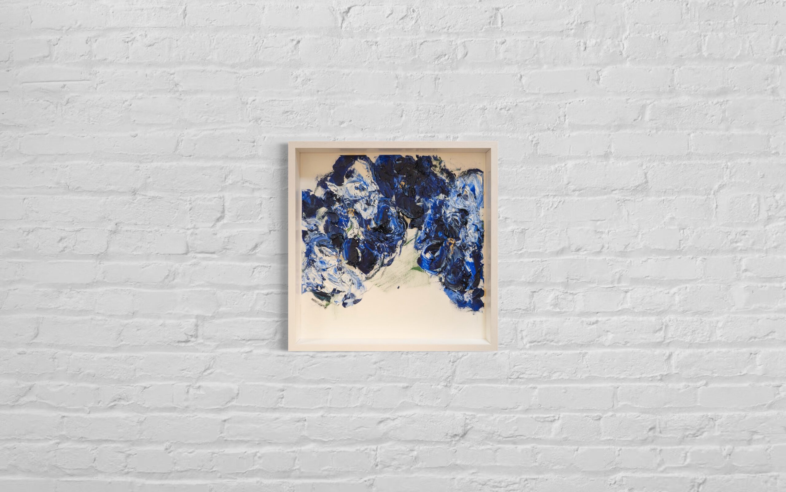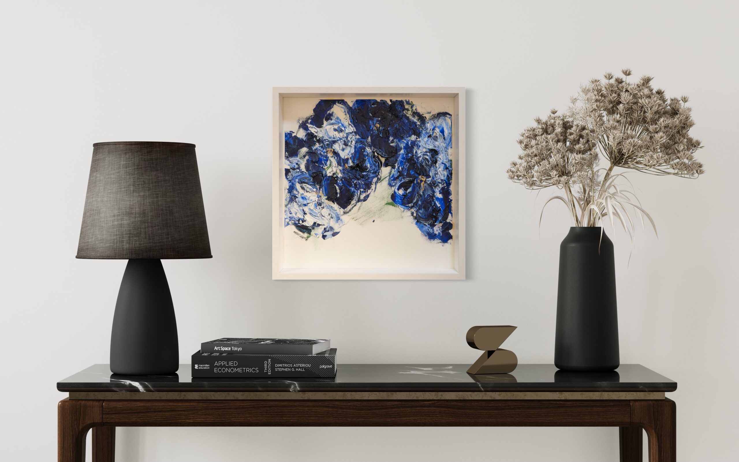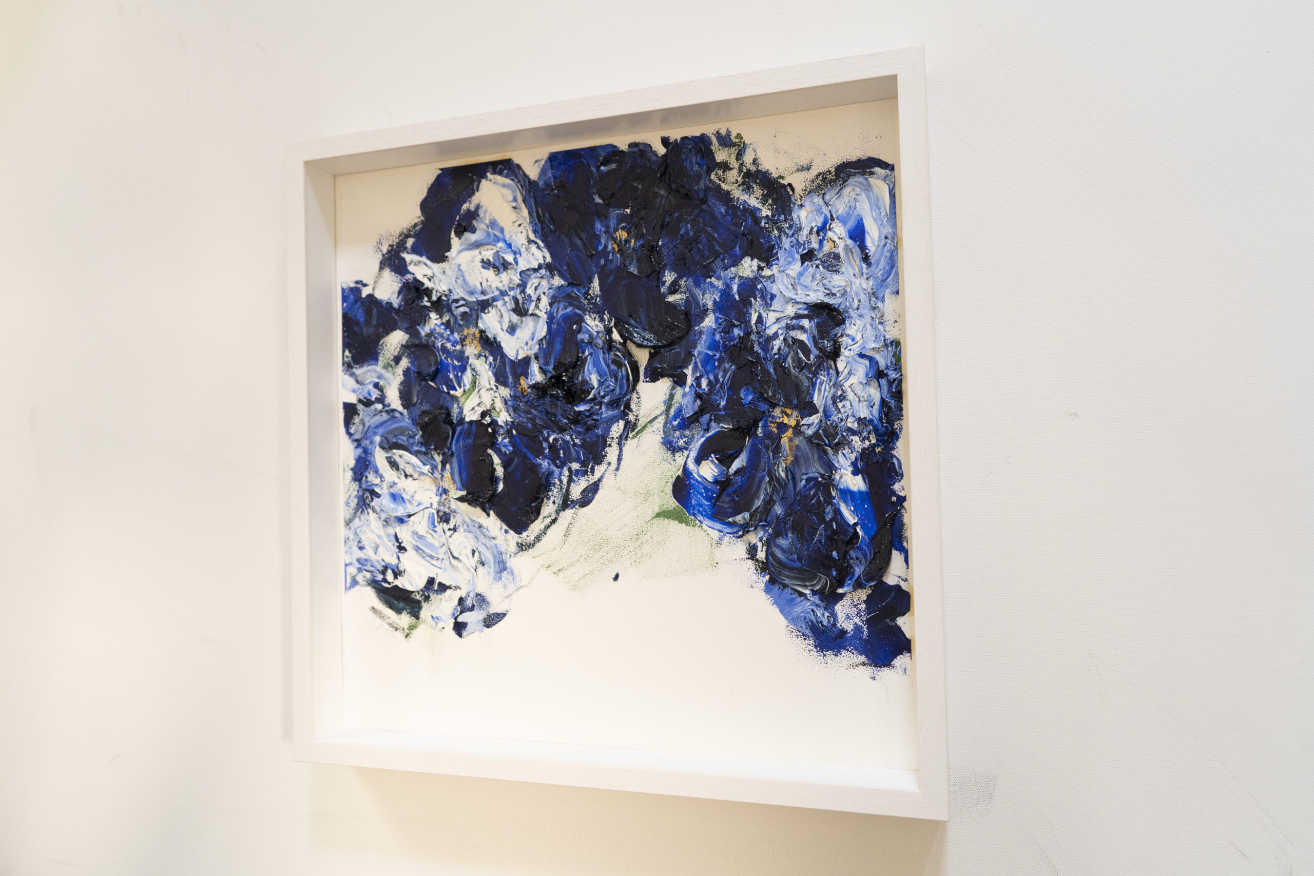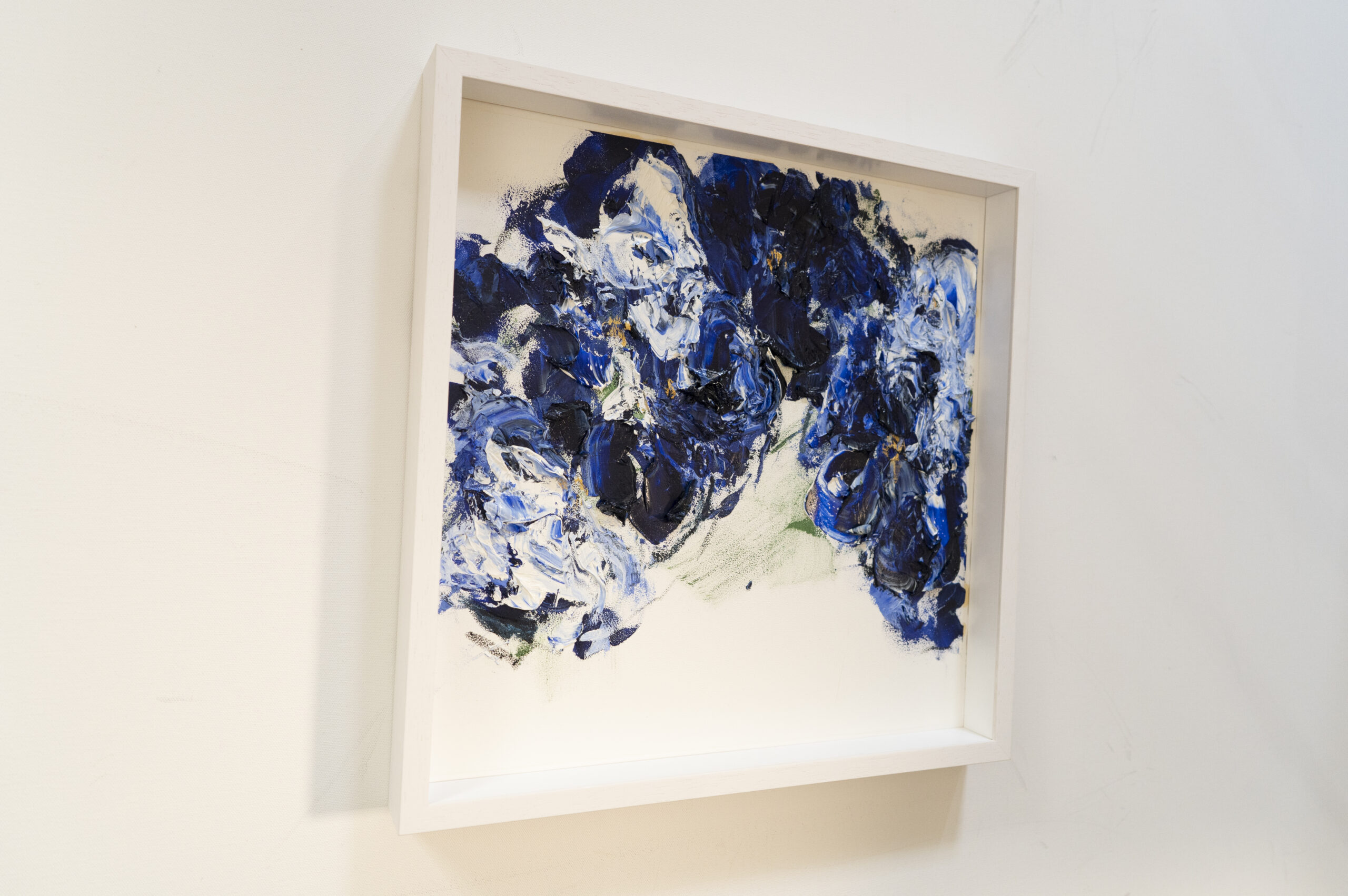 正方形の紙に制作された花の抽象画作品。こちらの作品は鮮やかな青が印象的で