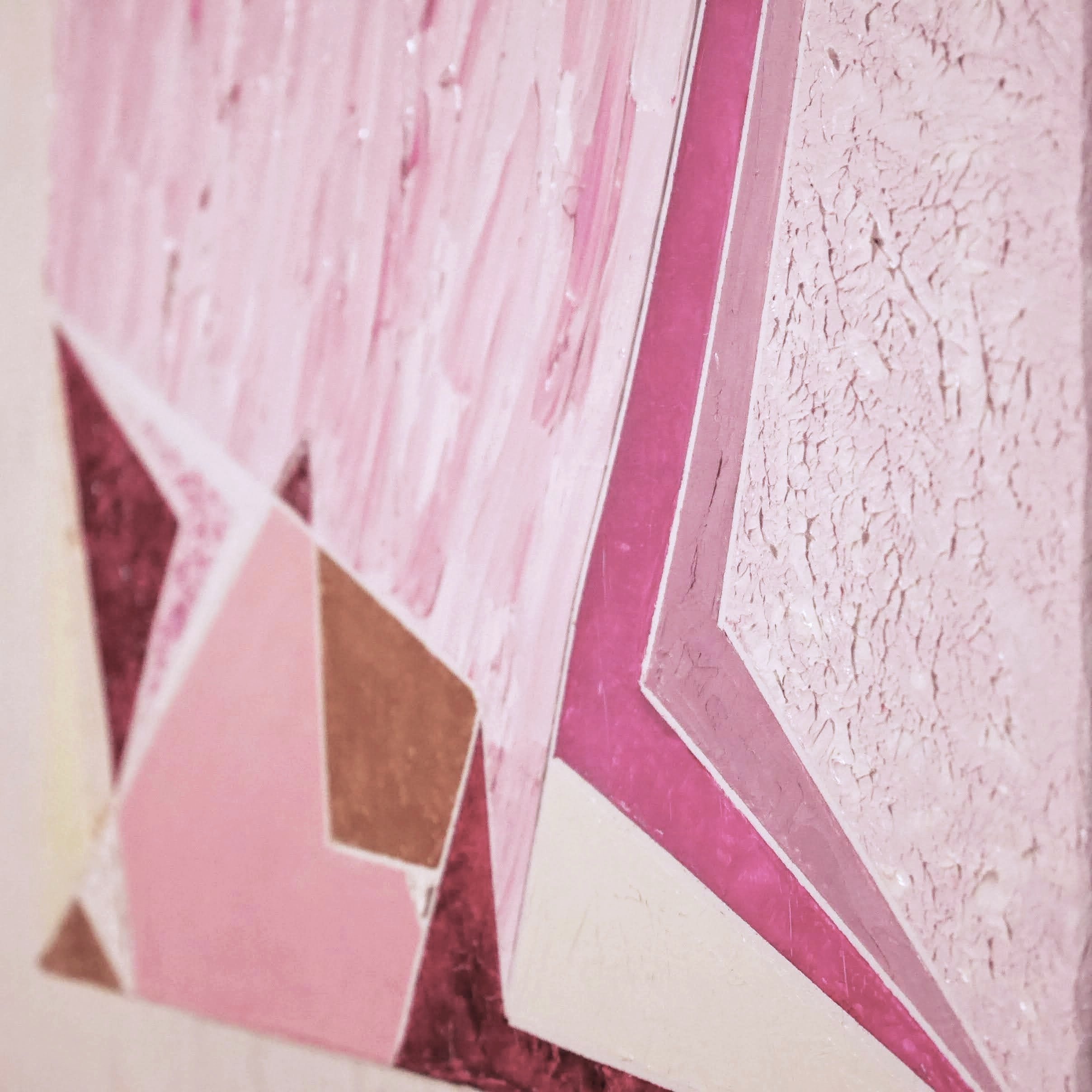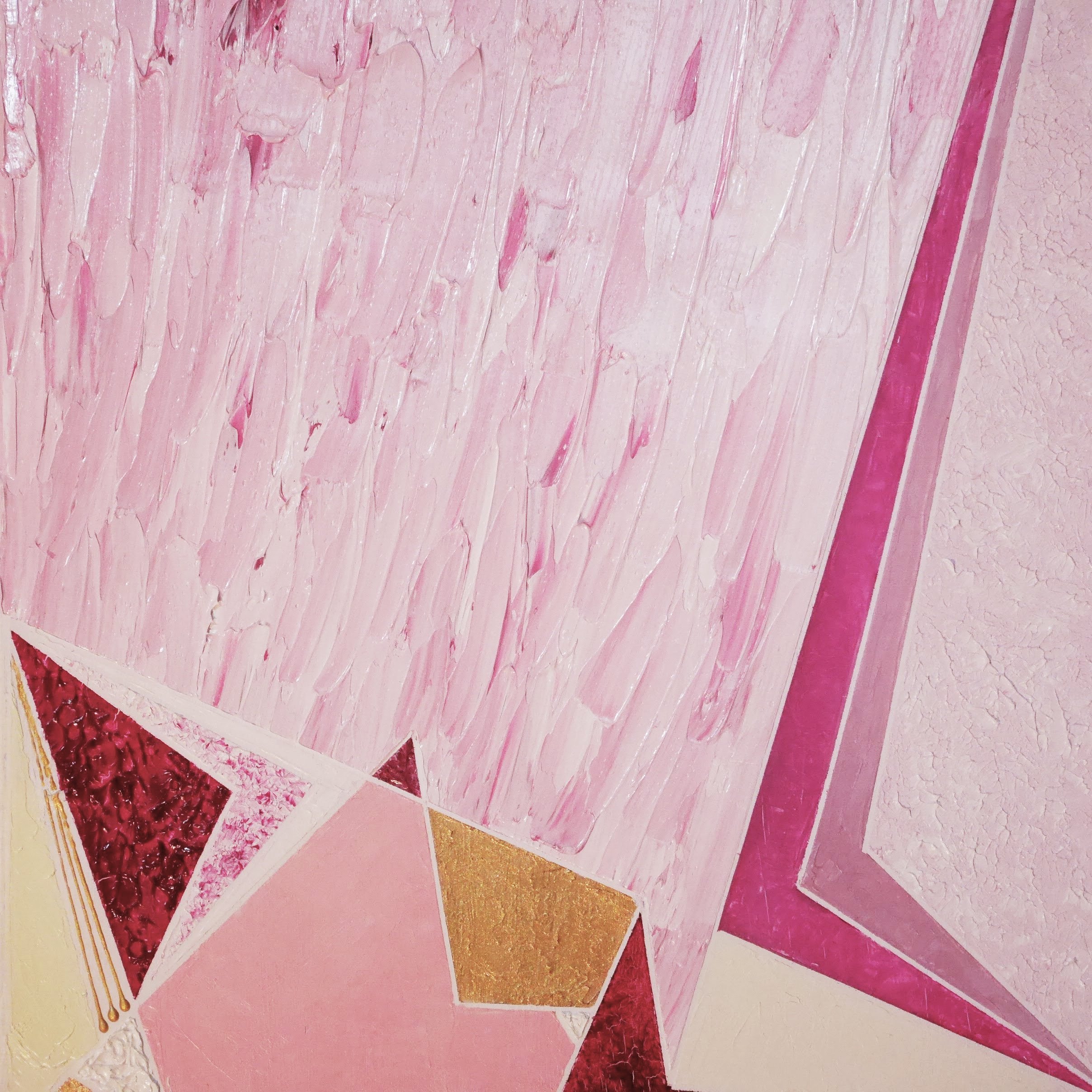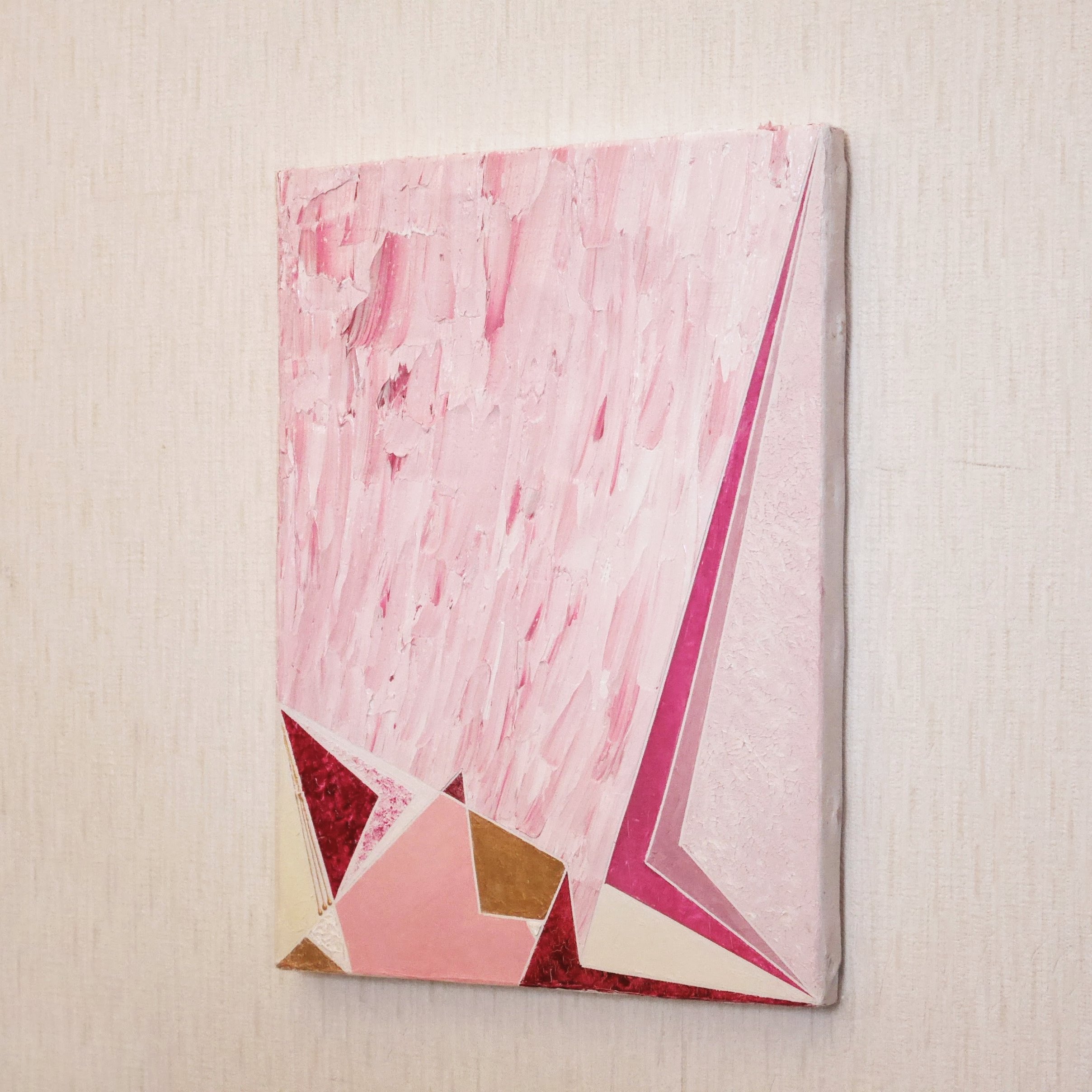 桜梅桃李それぞれの色彩をモチーフに黄金色を加えて、幾何学的にコンポジションを描いた抽象画です。一部、金色の細線によって繊細さが生まれています。