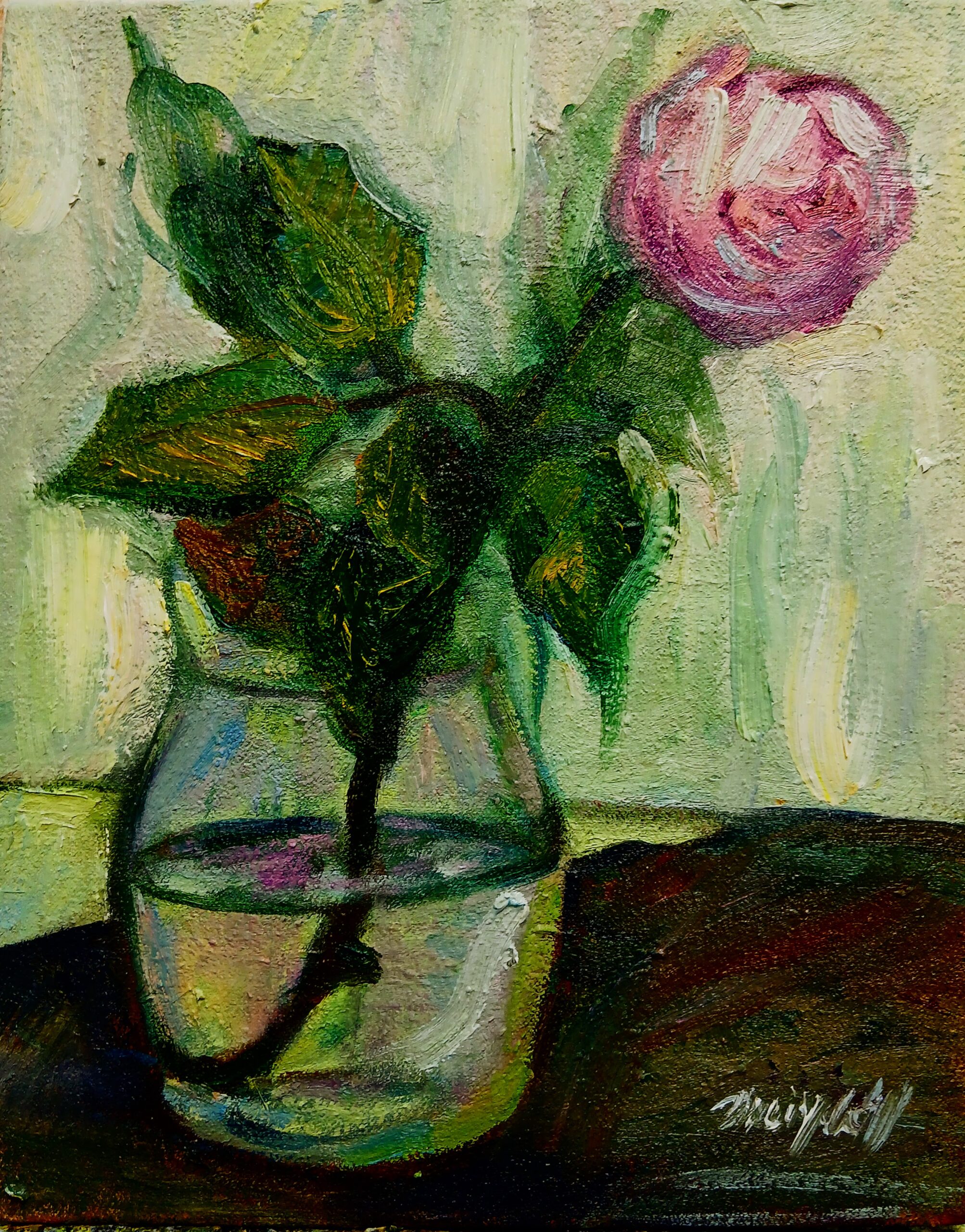 私の庭に春と冬に2度咲いてくれるバラが居ます。 かわいらしい淡いピンクの薔薇です。 私の冬の楽しみは彼女を愛でる事です。 ふと美しく咲いた瞬間を絵に残してみたいと思い立ち描いてみました。 凛としたプライド、それでいて優しげな儚い冬薔薇が描けた気がしています。 ゴールドの額縁が彼女の高貴さを引き立ててくれました。