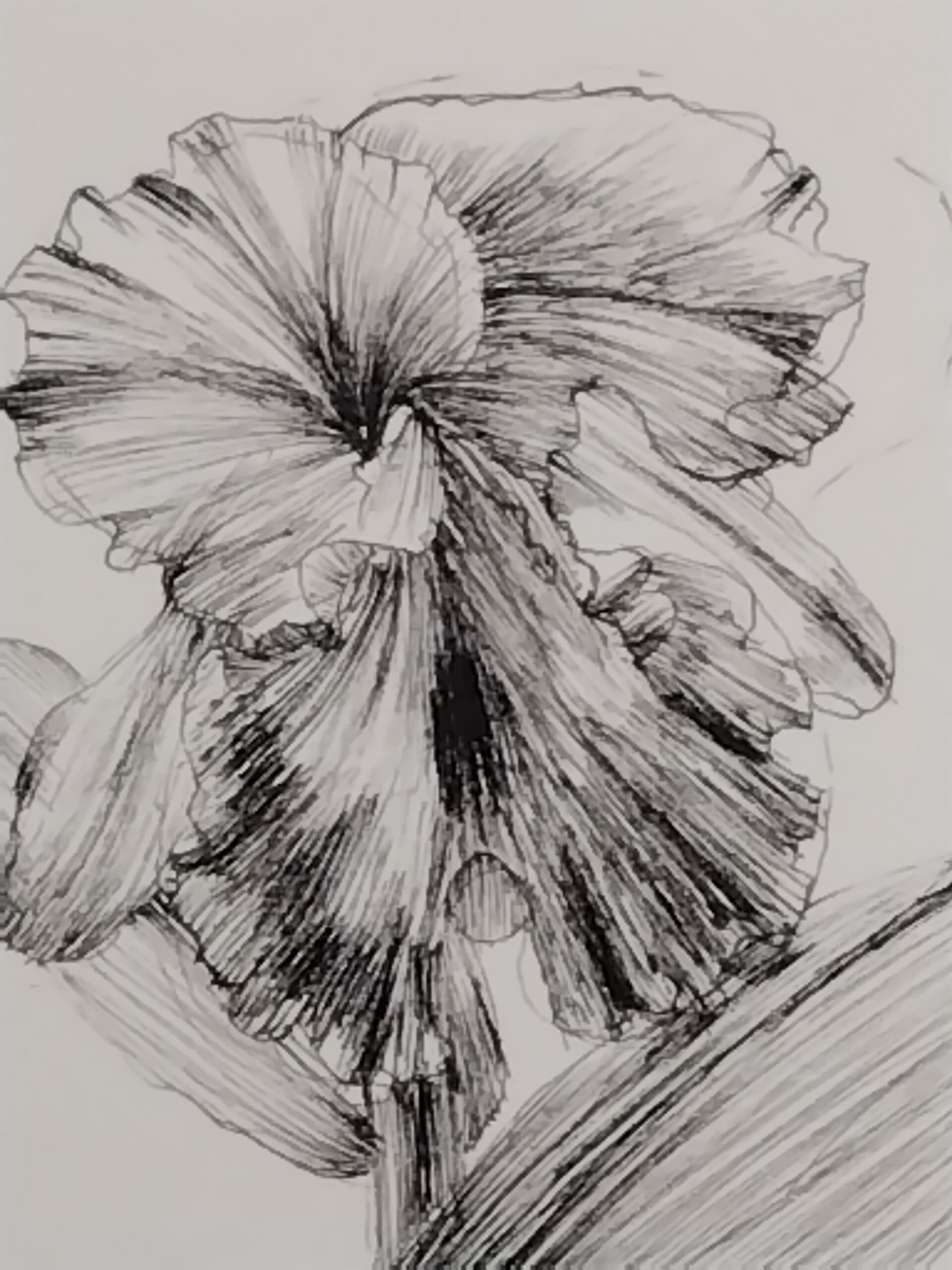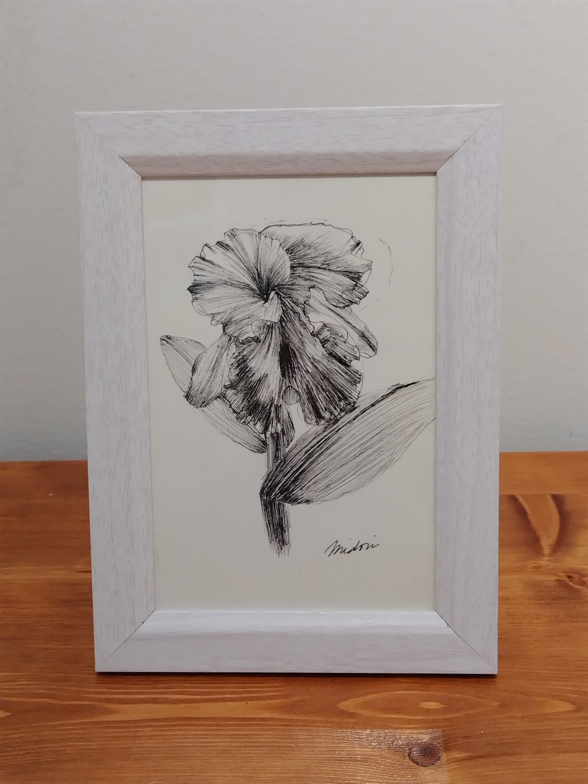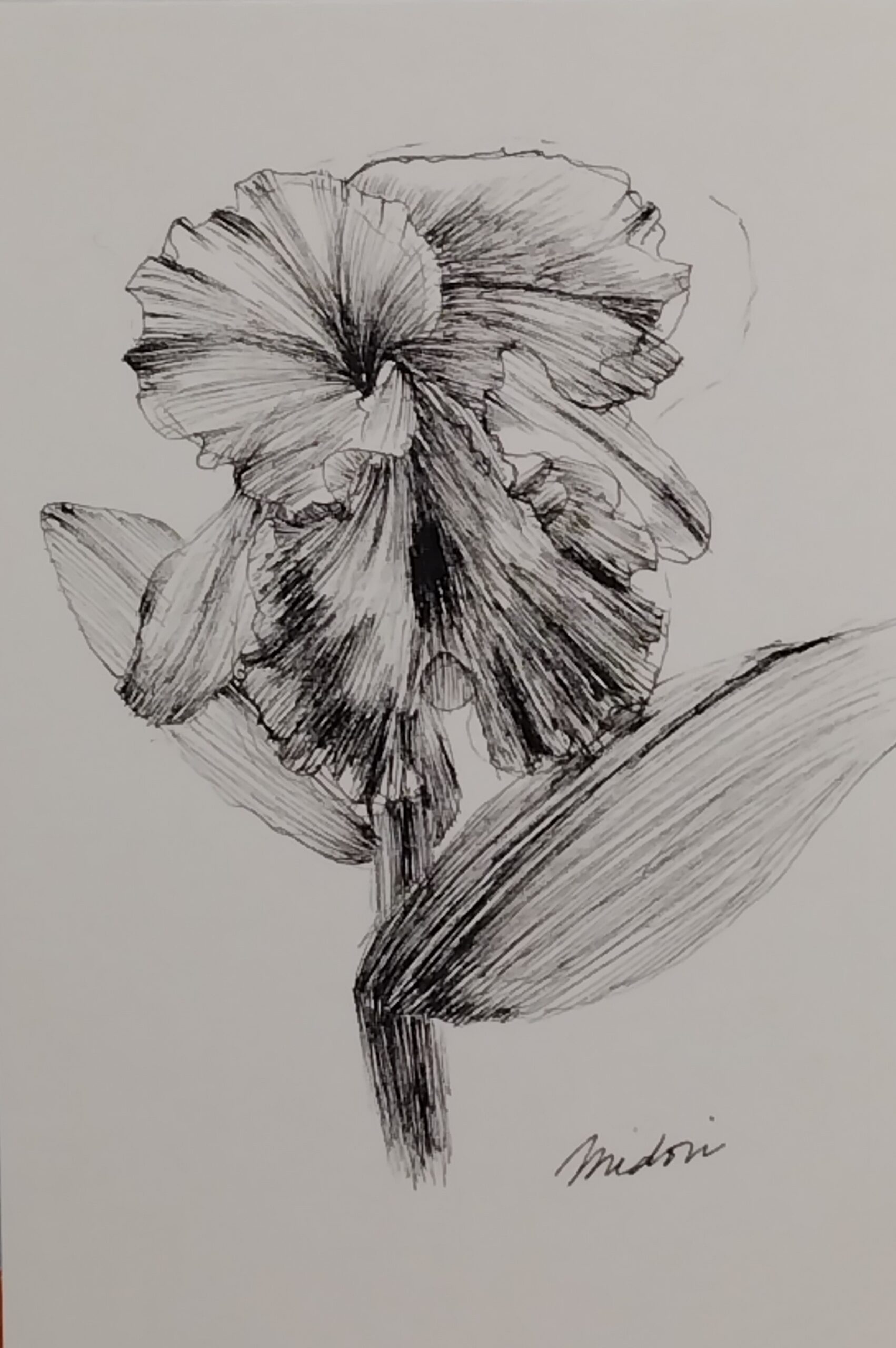 植物園でカトレアの花の優美さに惹かれ、描きました。黒色の美しさをお楽しみいただければ嬉しいです。