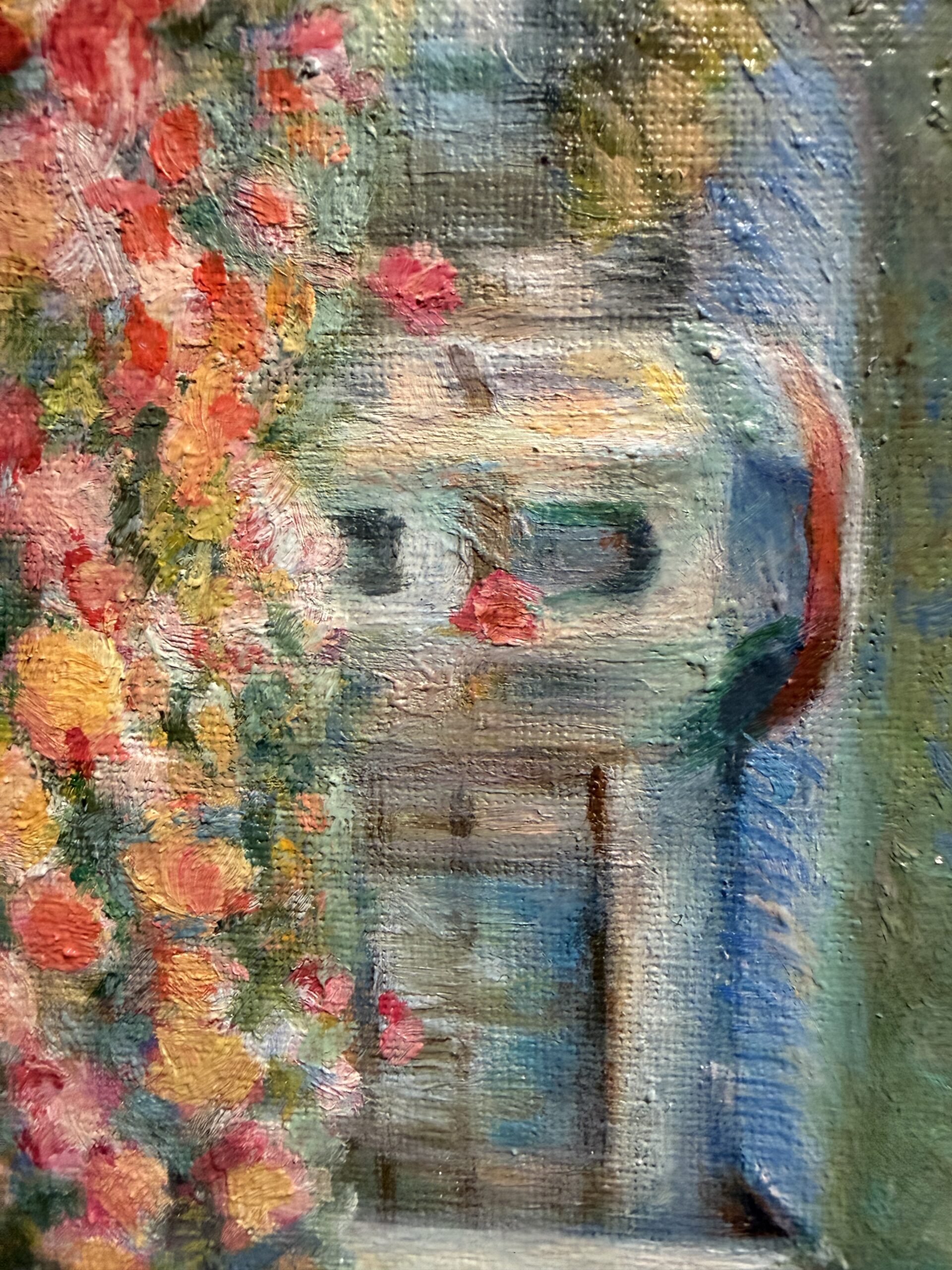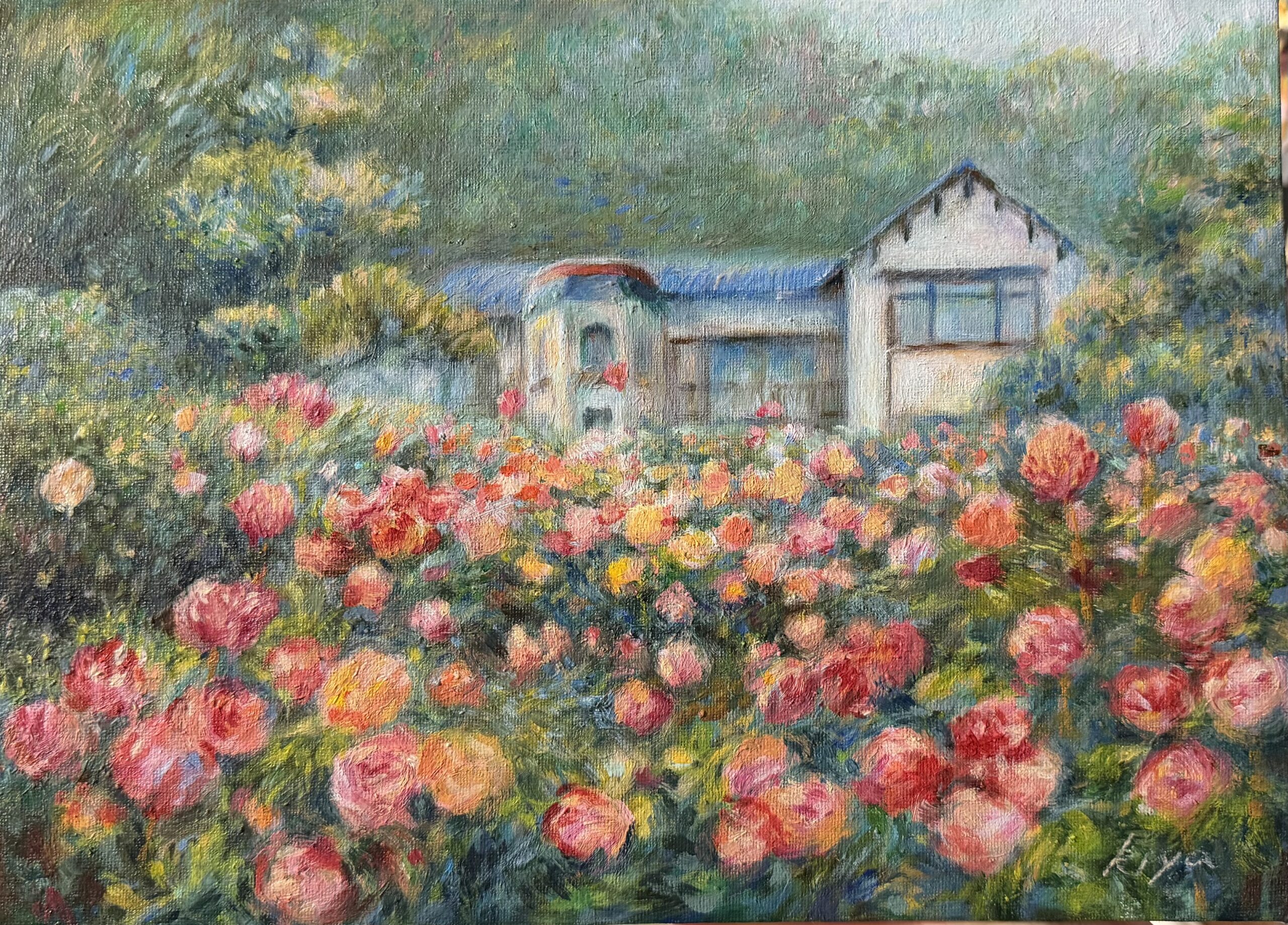油彩画特有の重厚感あるタッチと、春の自然が織りなす柔らかく、純粋な明るい色と溢れんばかりに咲き誇るバラたちの姿が可愛らしく描かれています。