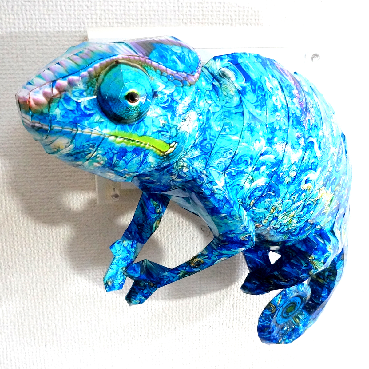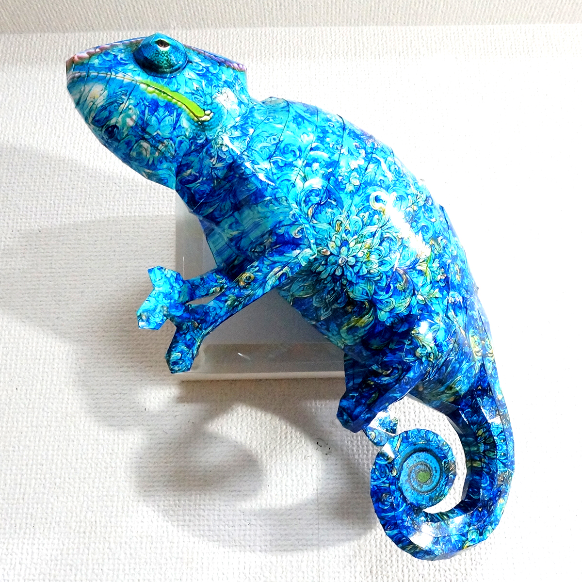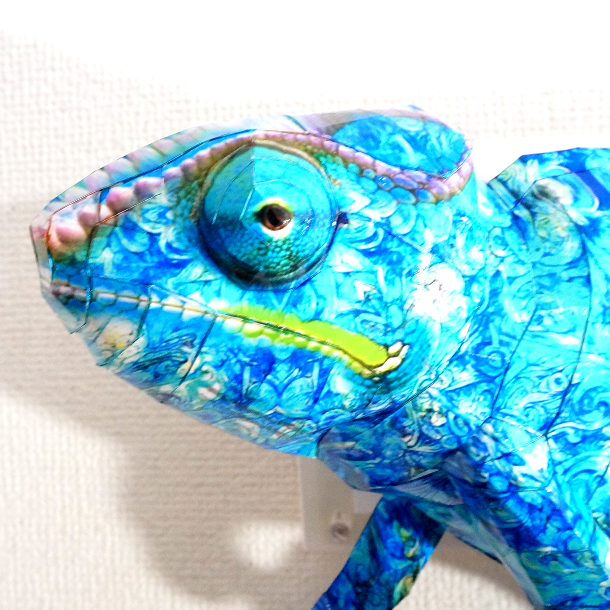 カメレオンのコラージュ画像を作成し、ペーパークラフト技術を用いて立体的に表現した作品です。