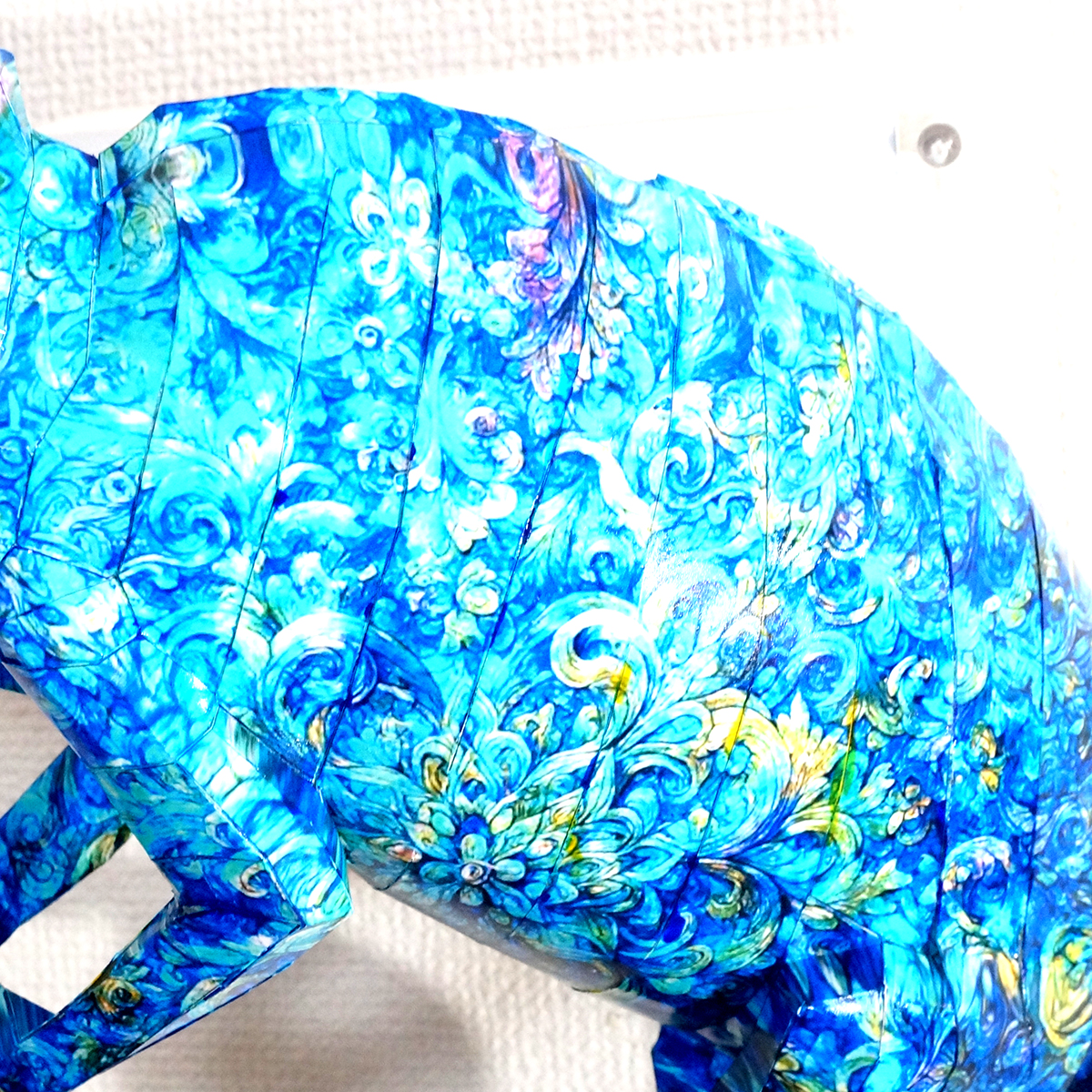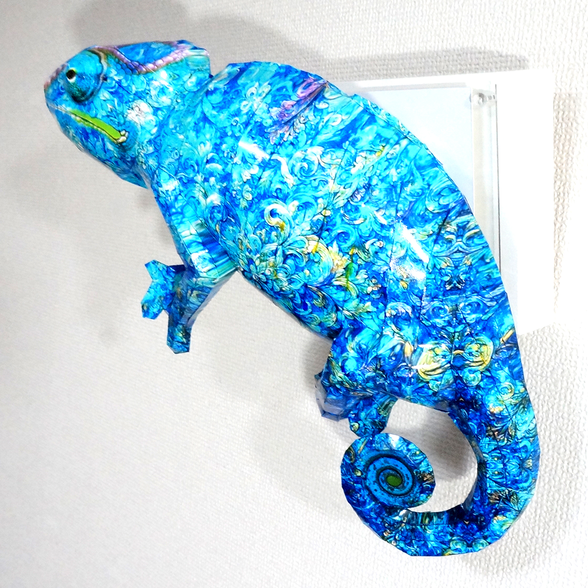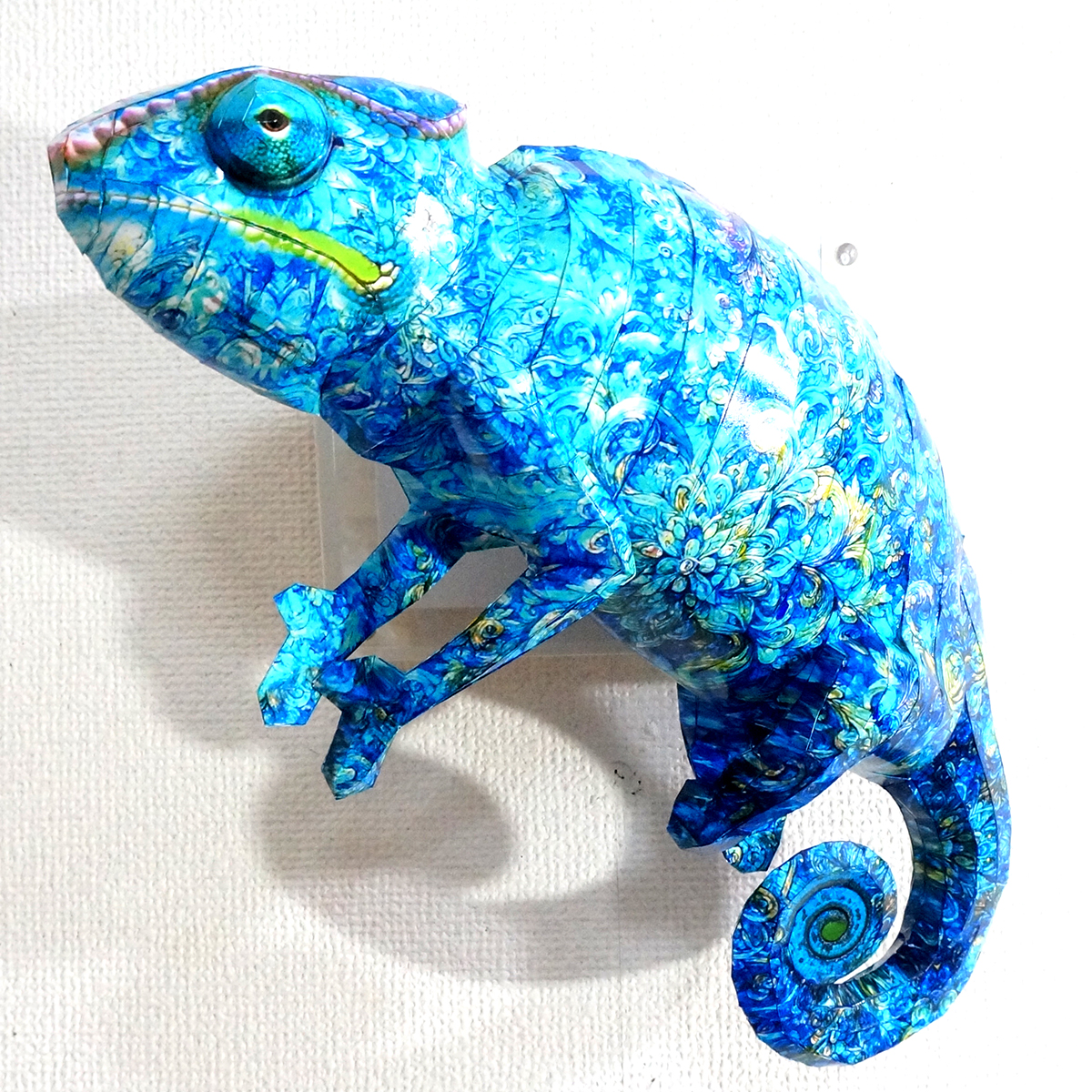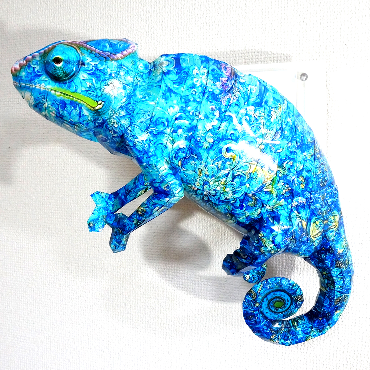 カメレオンのコラージュ画像を作成し、ペーパークラフト技術を用いて立体的に表現した作品です。