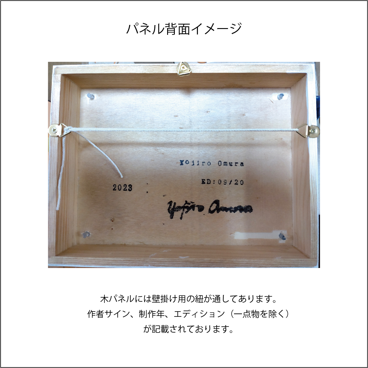 パネルの裏面には紐掛け用のフックを取り付け、制作年、作者サインを記しております。