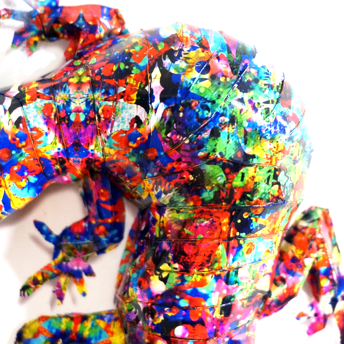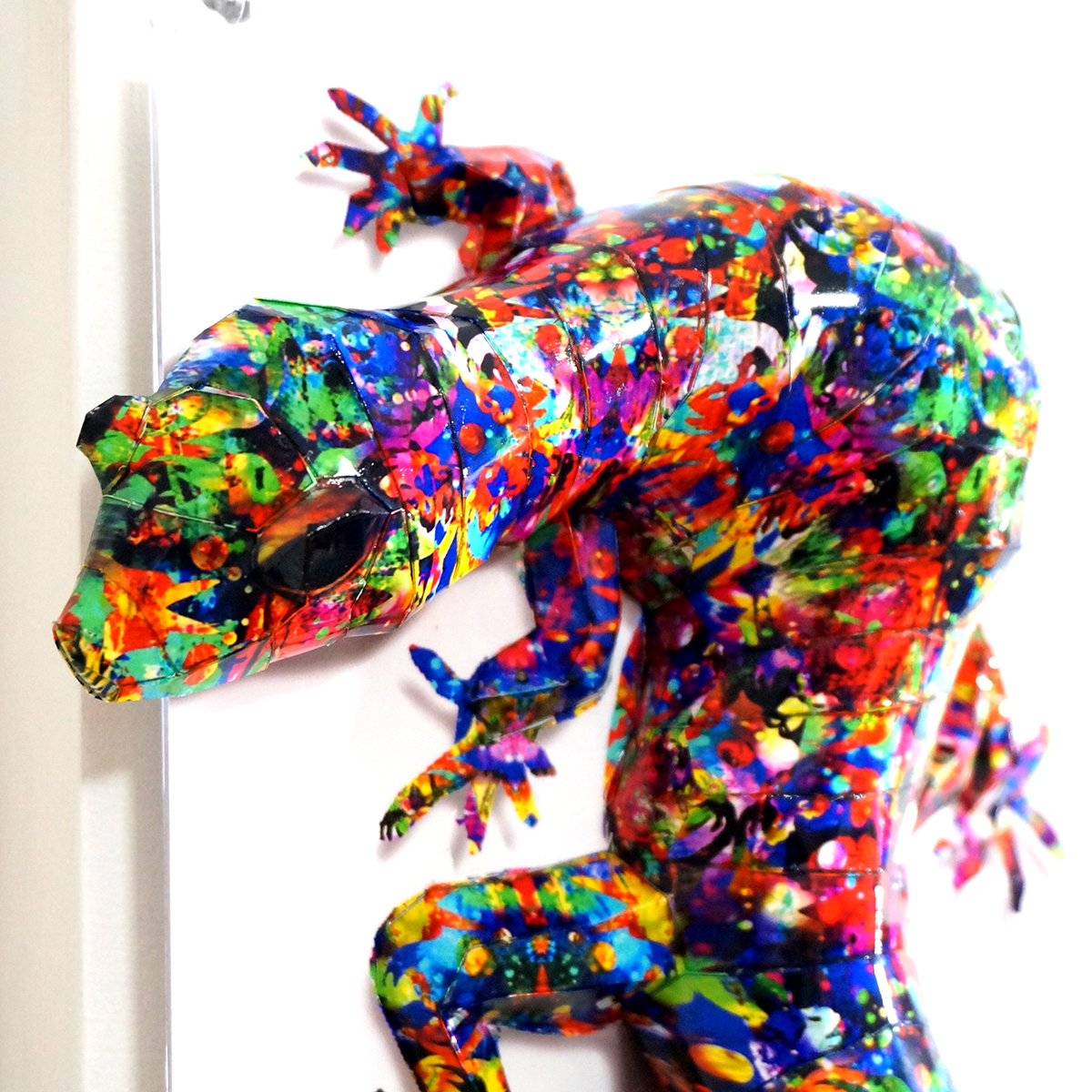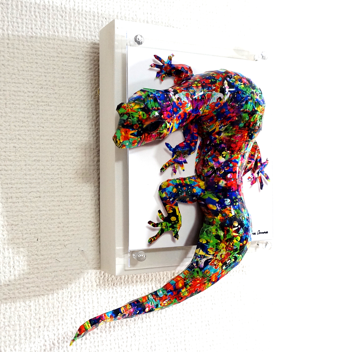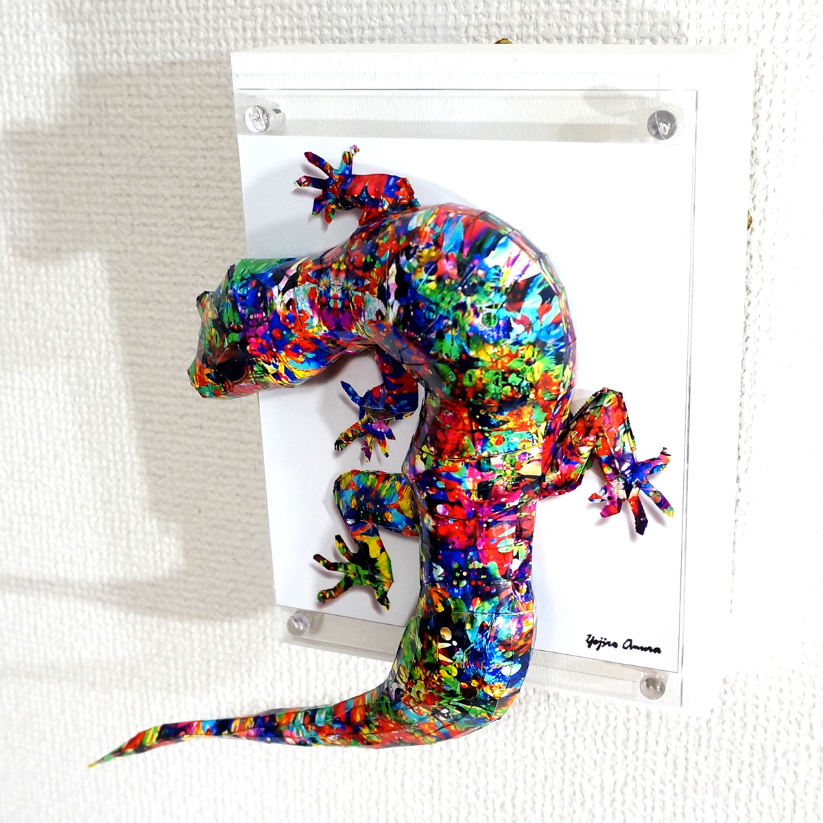 サイケデリックなイメージの模様とトカゲ本来の風合いを重ね合わせたデザインです。表面上は光沢紙の艶のある質感となっております。