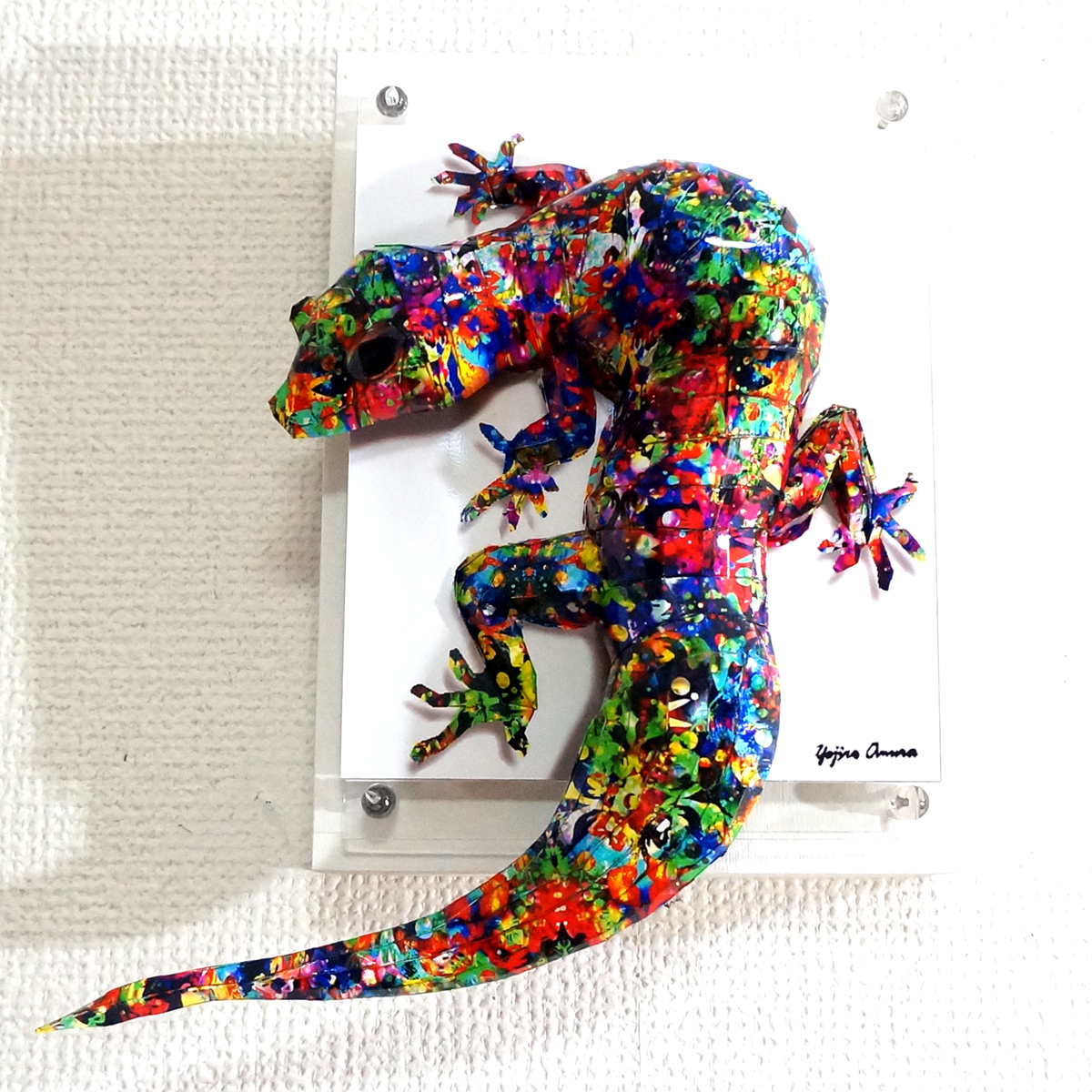 トカゲのコラージュ画像を作成し、ペーパークラフト技術を用いて立体化した作品です。