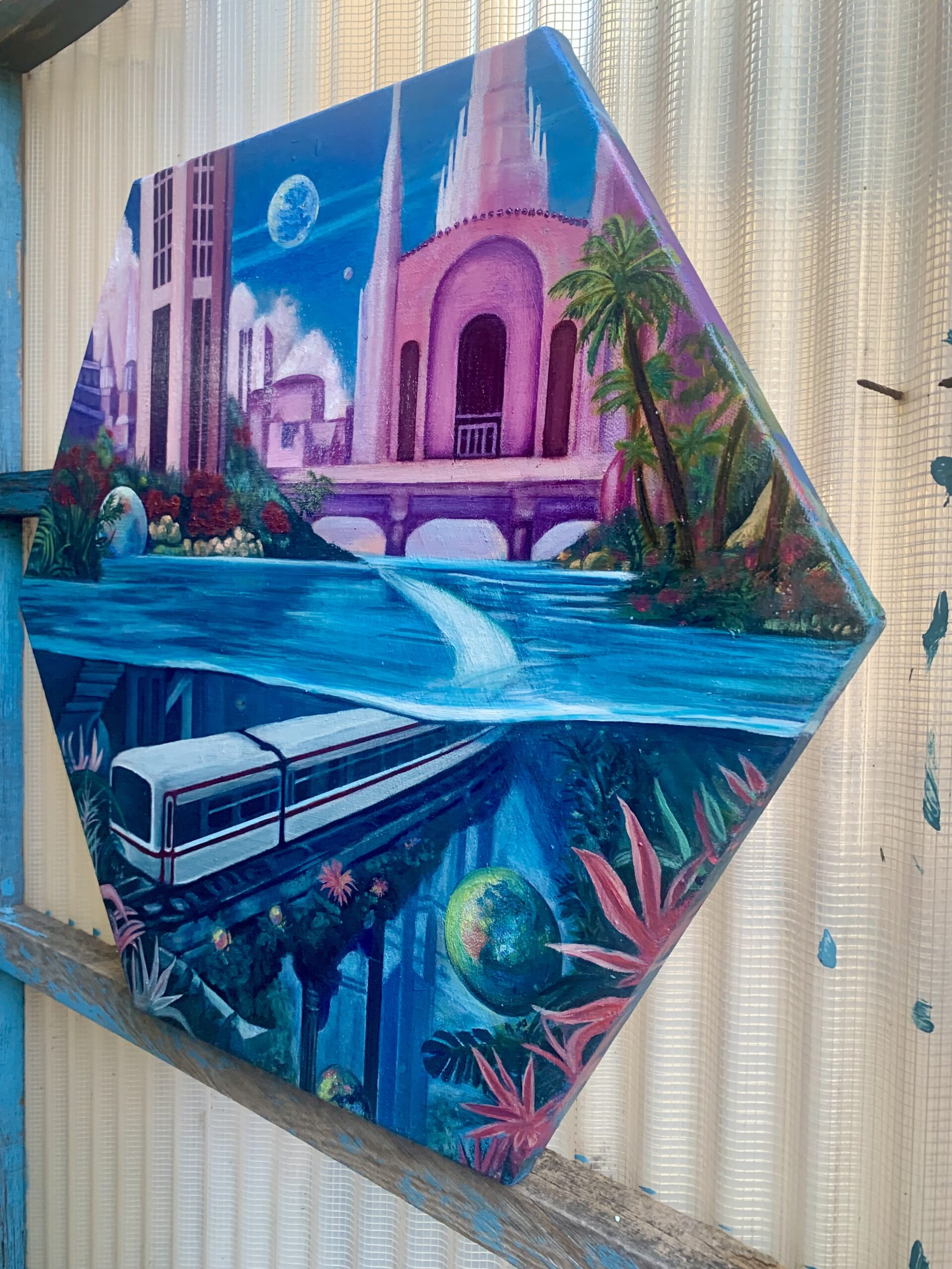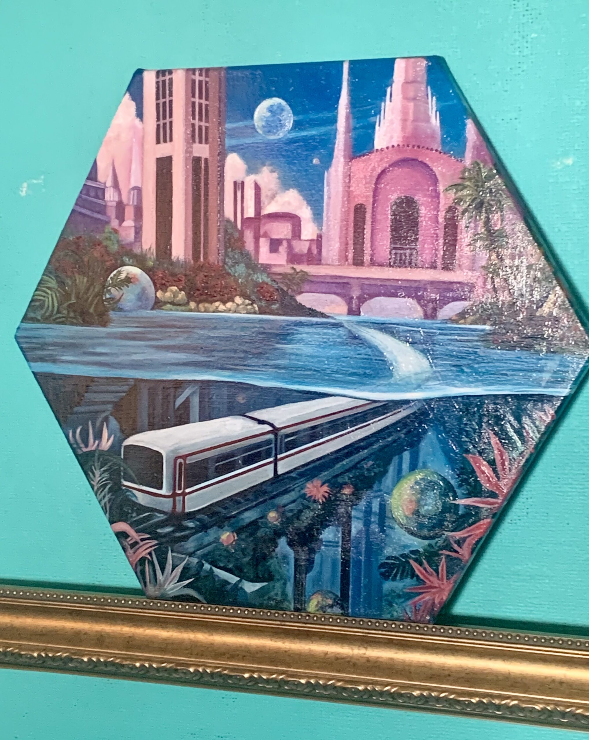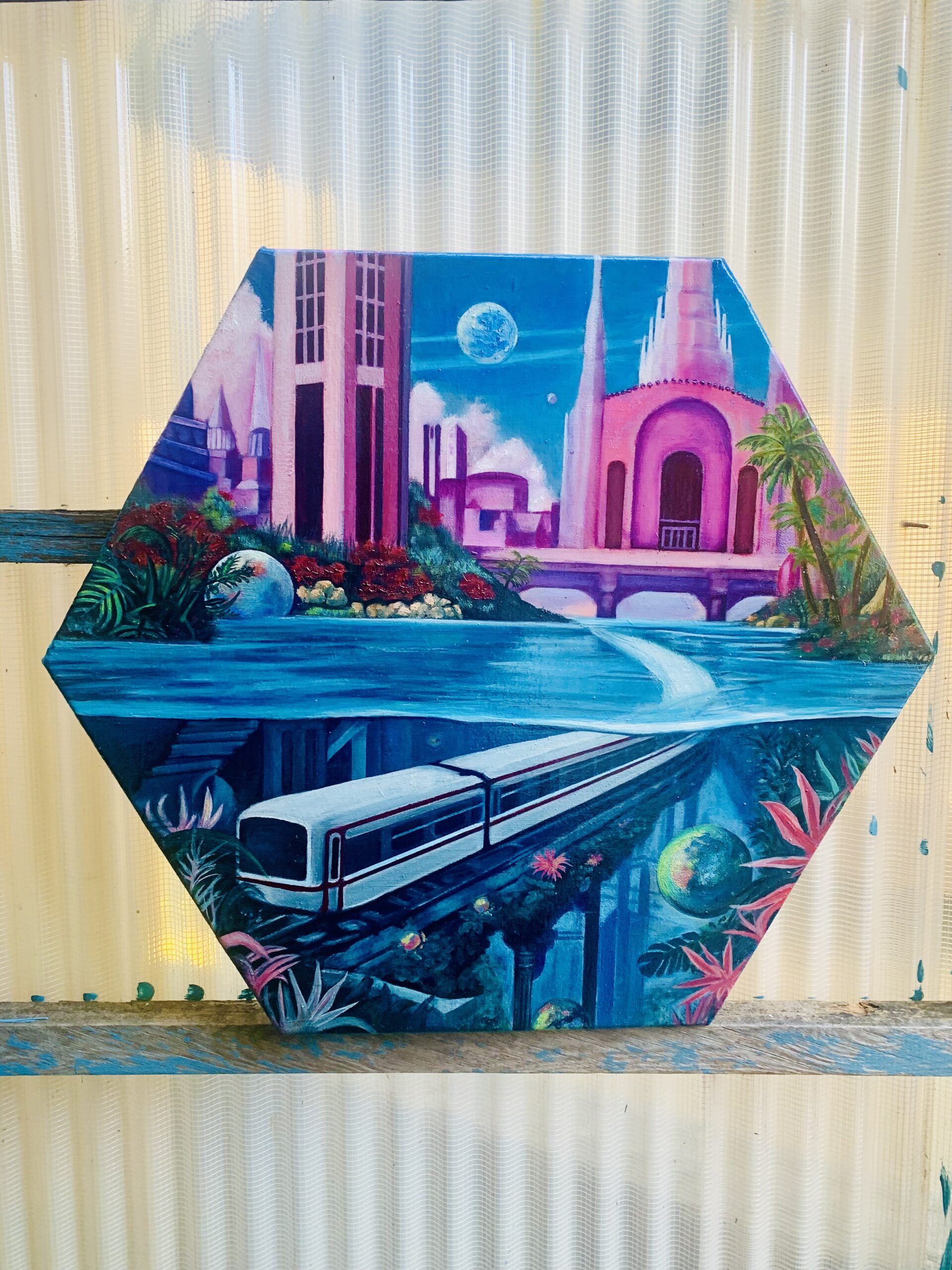 六角形のキャンバスに描かれていることで、より一層、都市の持つ幾何学的な美しさが強調されています