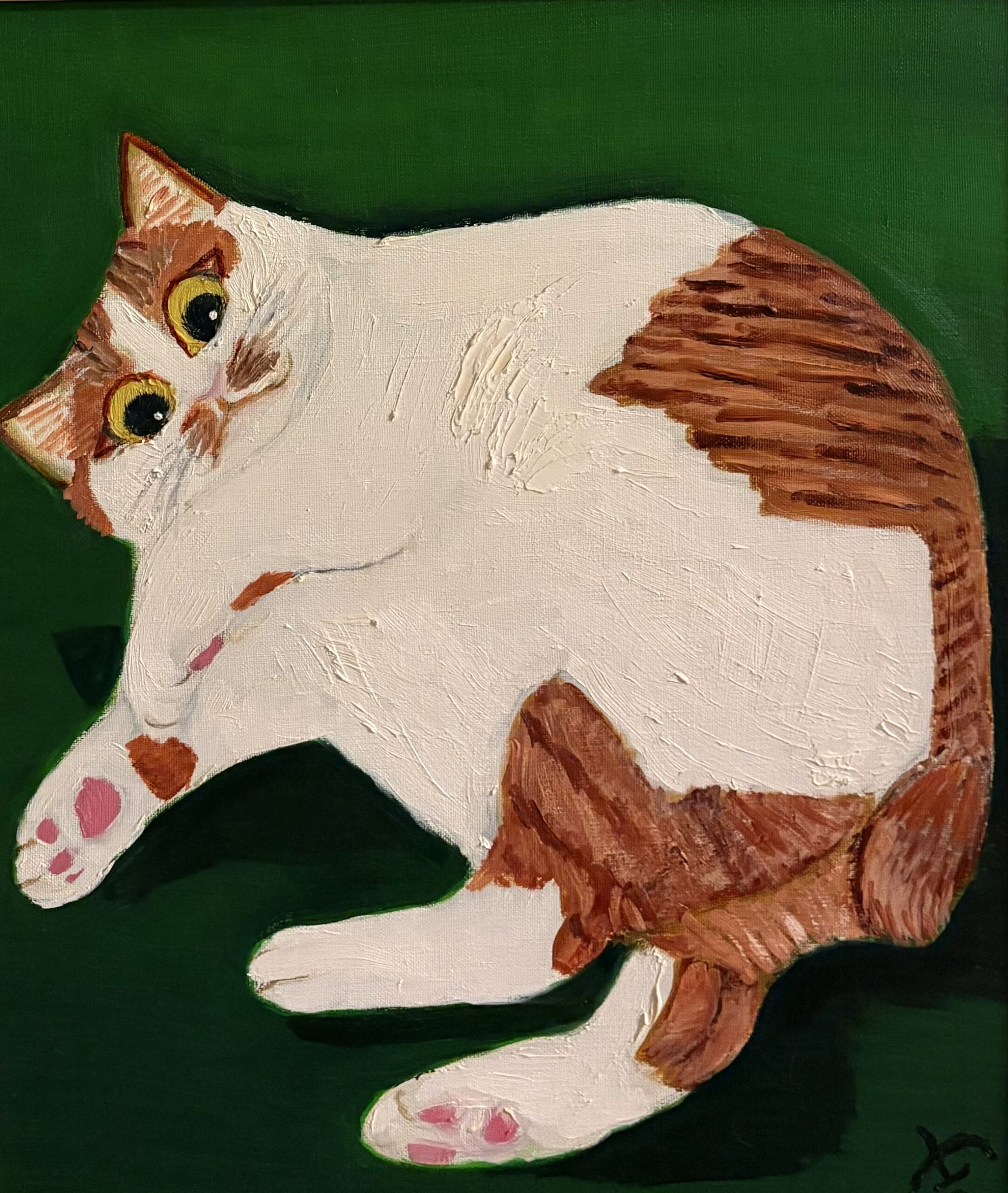 出かけようとすると必ず進路をふさいで、寝転がり遊びを誘う猫。この絵を見て思わず笑顔になっていただければ幸いです。