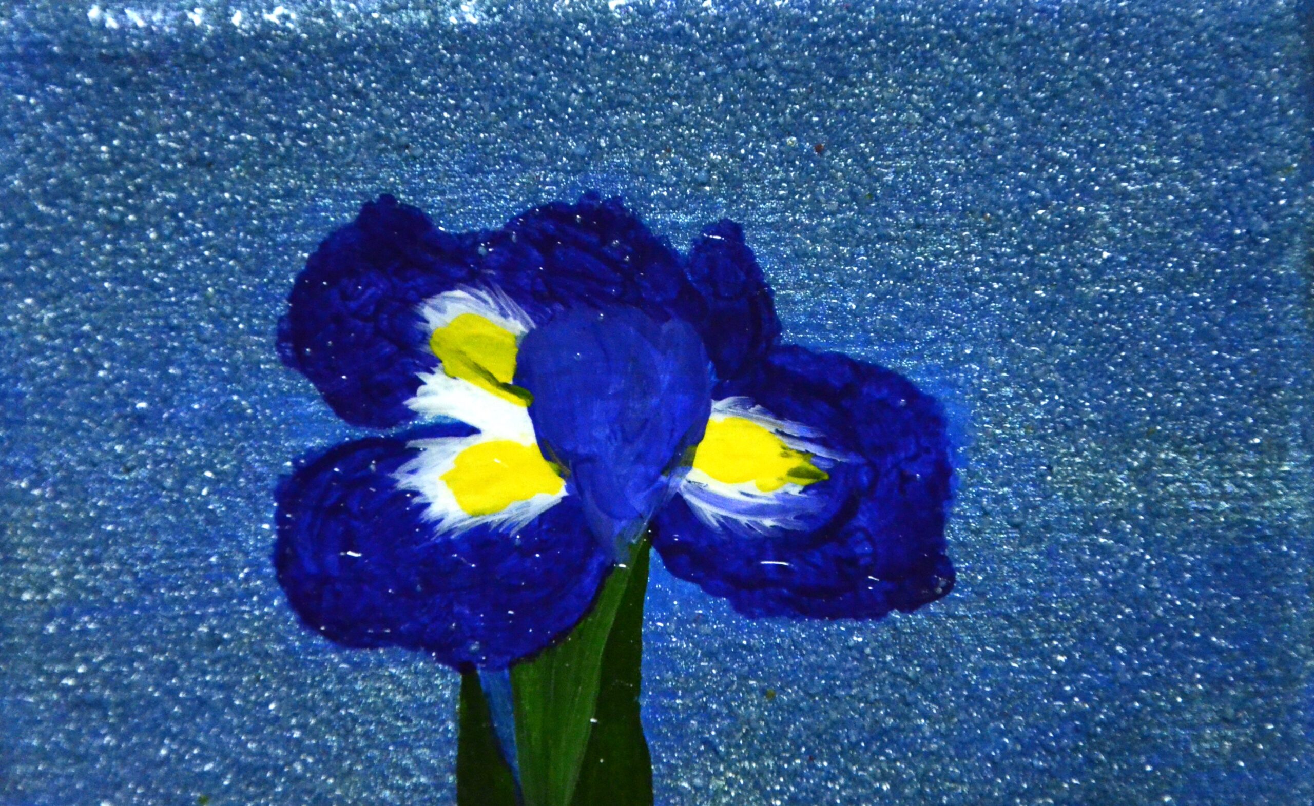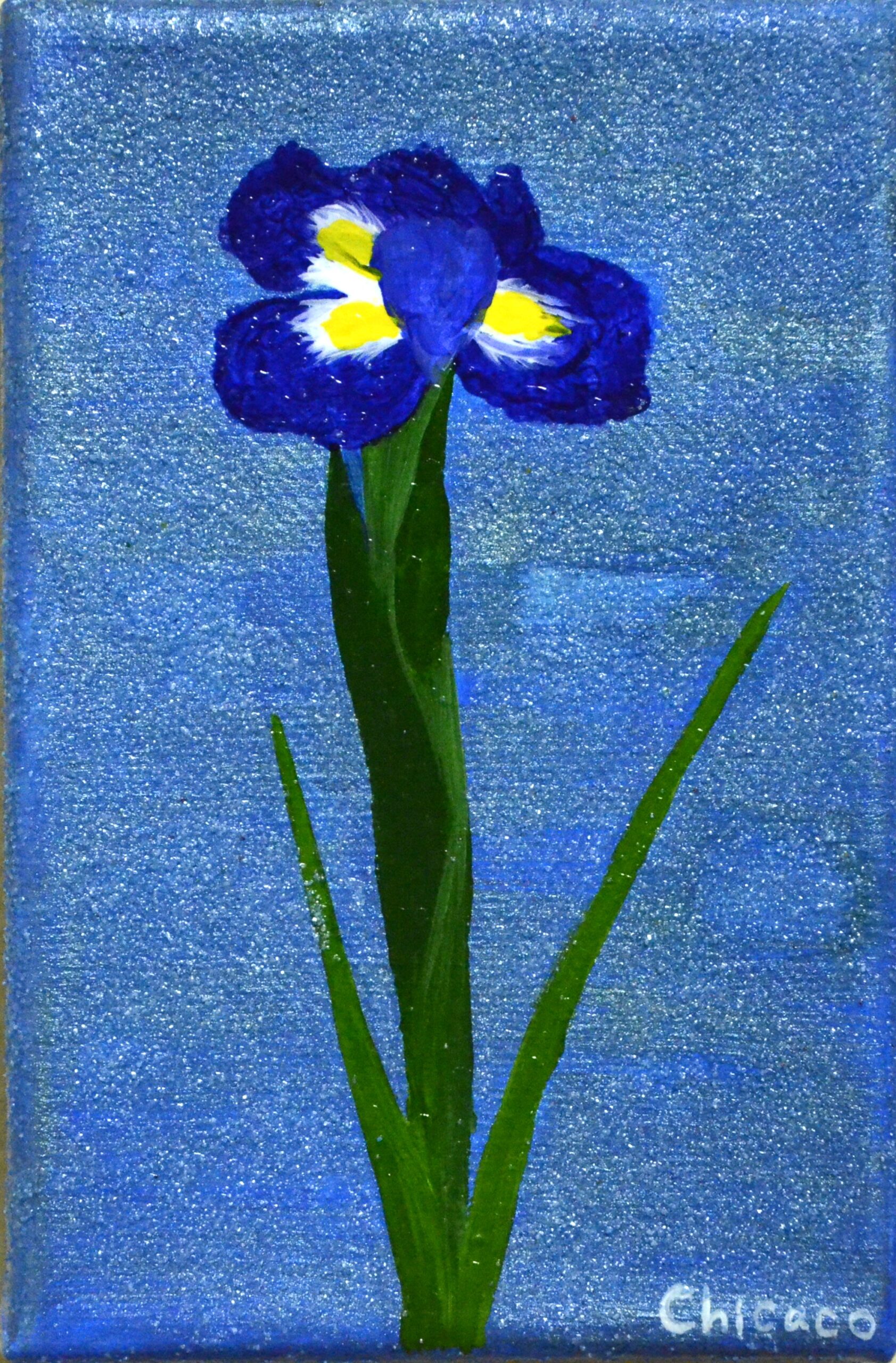 菖蒲の花を描いた作品。菖蒲の花はアクリル絵の具で繊細に描き、背景にはラメのあるアクリル絵の具と砂を使用し、質感の違いを楽しめる作品。