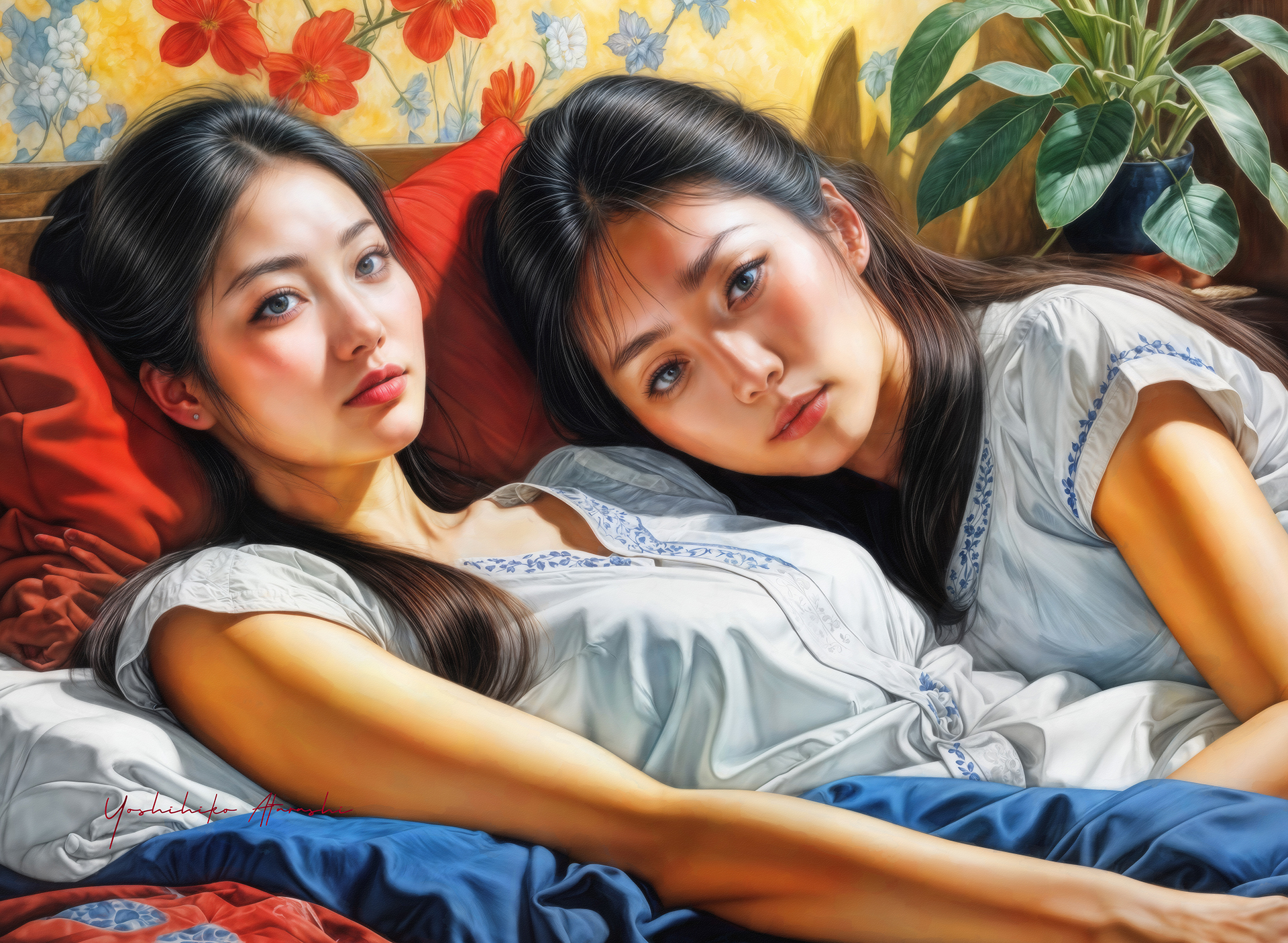 まるで写真のようなリアリズムで描かれた本作は、まどろみの中にある女性たちの静かな時間と感情を映し出します。柔らかな光と布の質感が、心の奥にそっと触れるような余韻を生みます。展示は低めの位置に配置し、ベッドのような演出やクッションを添えることで、鑑賞者が絵の世界に入り込める空間を演出します。寝室やラウンジへの設置にも最適です。