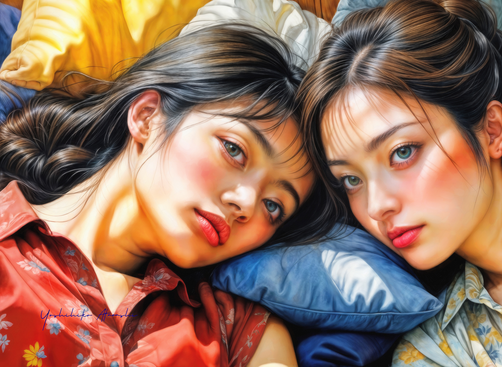 まるで写真のようなリアリズムで描かれた本作は、まどろみの中にある女性たちの静かな時間と感情を映し出します。柔らかな光と布の質感が、心の奥にそっと触れるような余韻を生みます。展示は低めの位置に配置し、ベッドのような演出やクッションを添えることで、鑑賞者が絵の世界に入り込める空間を演出します。寝室やラウンジへの設置にも最適です。