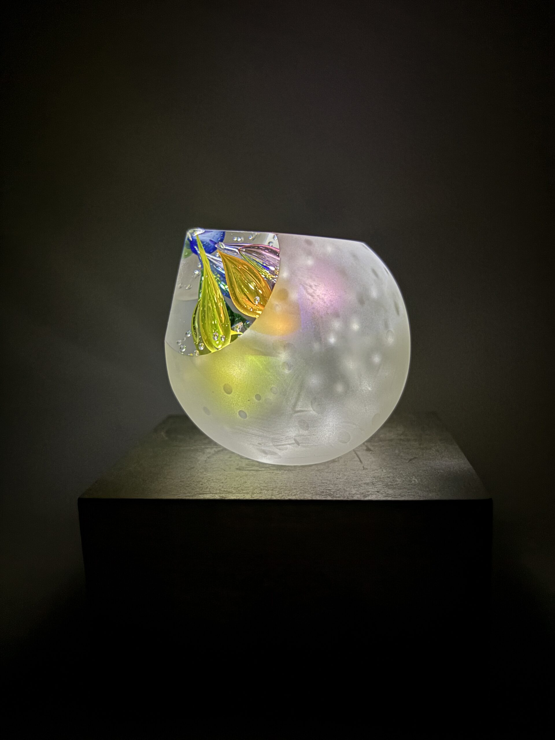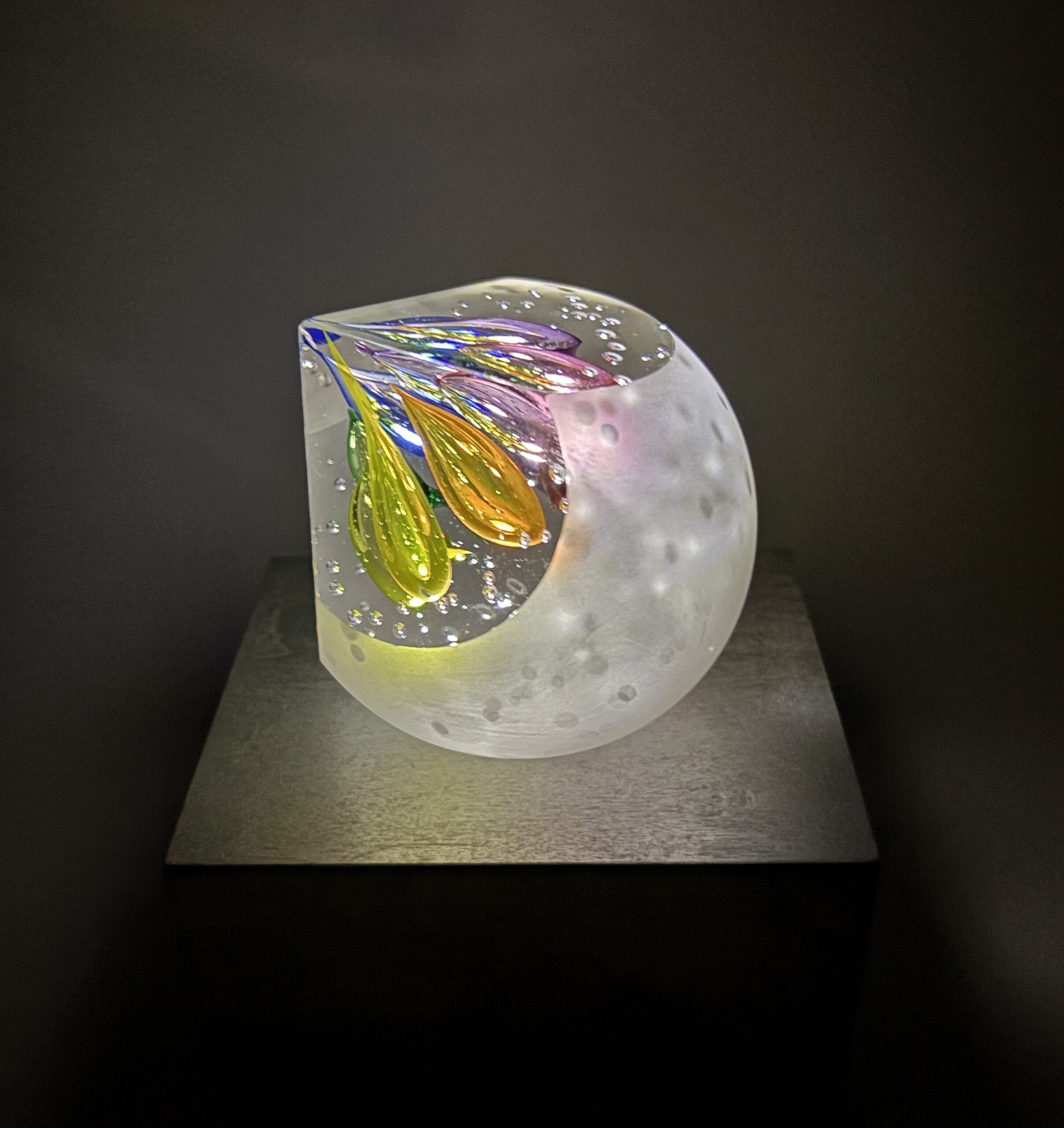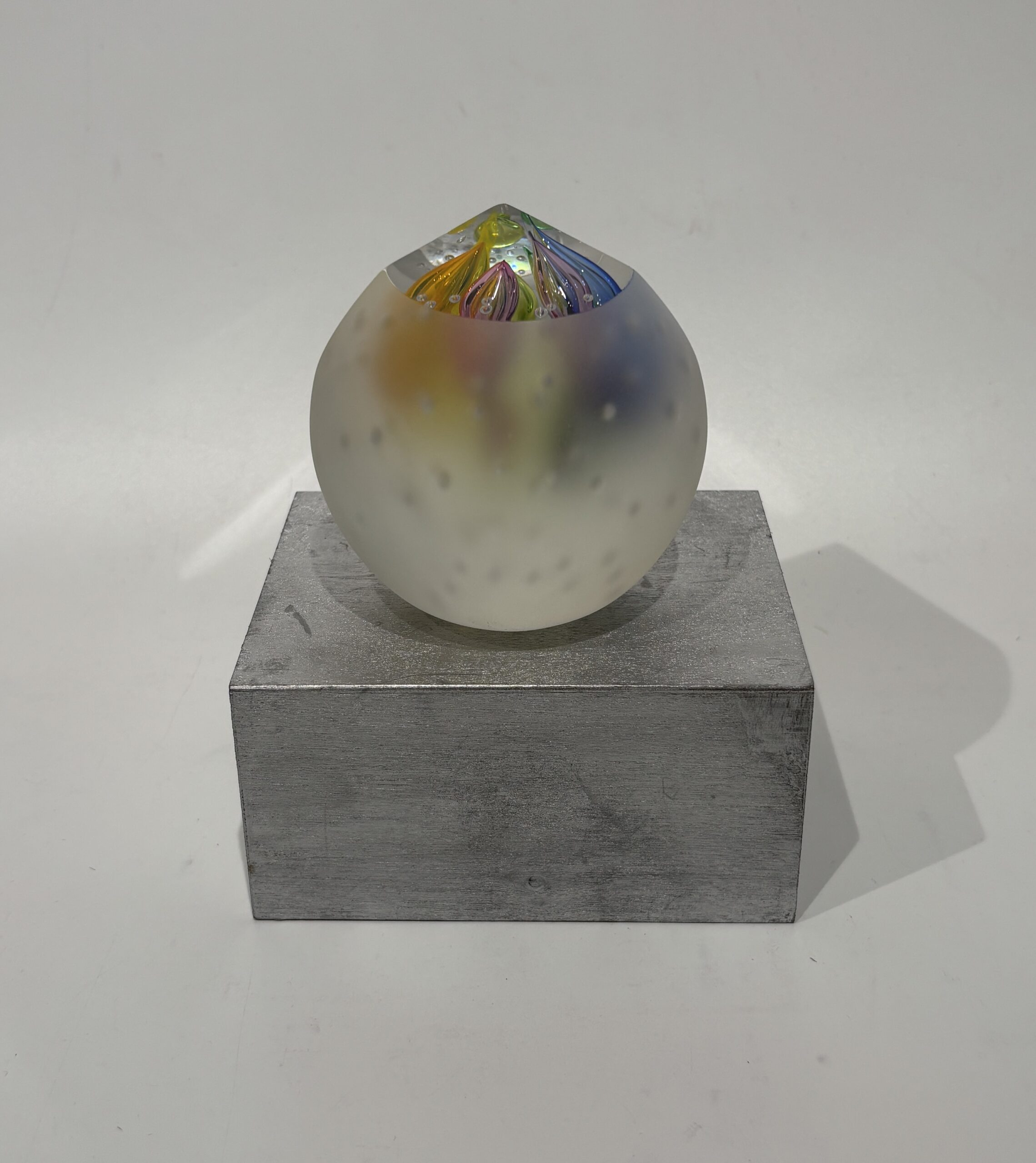 虹7色の泡がガラスの中に入っていてその周りに規則正しい小さな気泡が入っている。外側サンドブラスト加工。ピラミッド型にカットして垂直では無い斜め置き。下の台付き。電池式のLEDライトが付いていて照明の様にもなる。