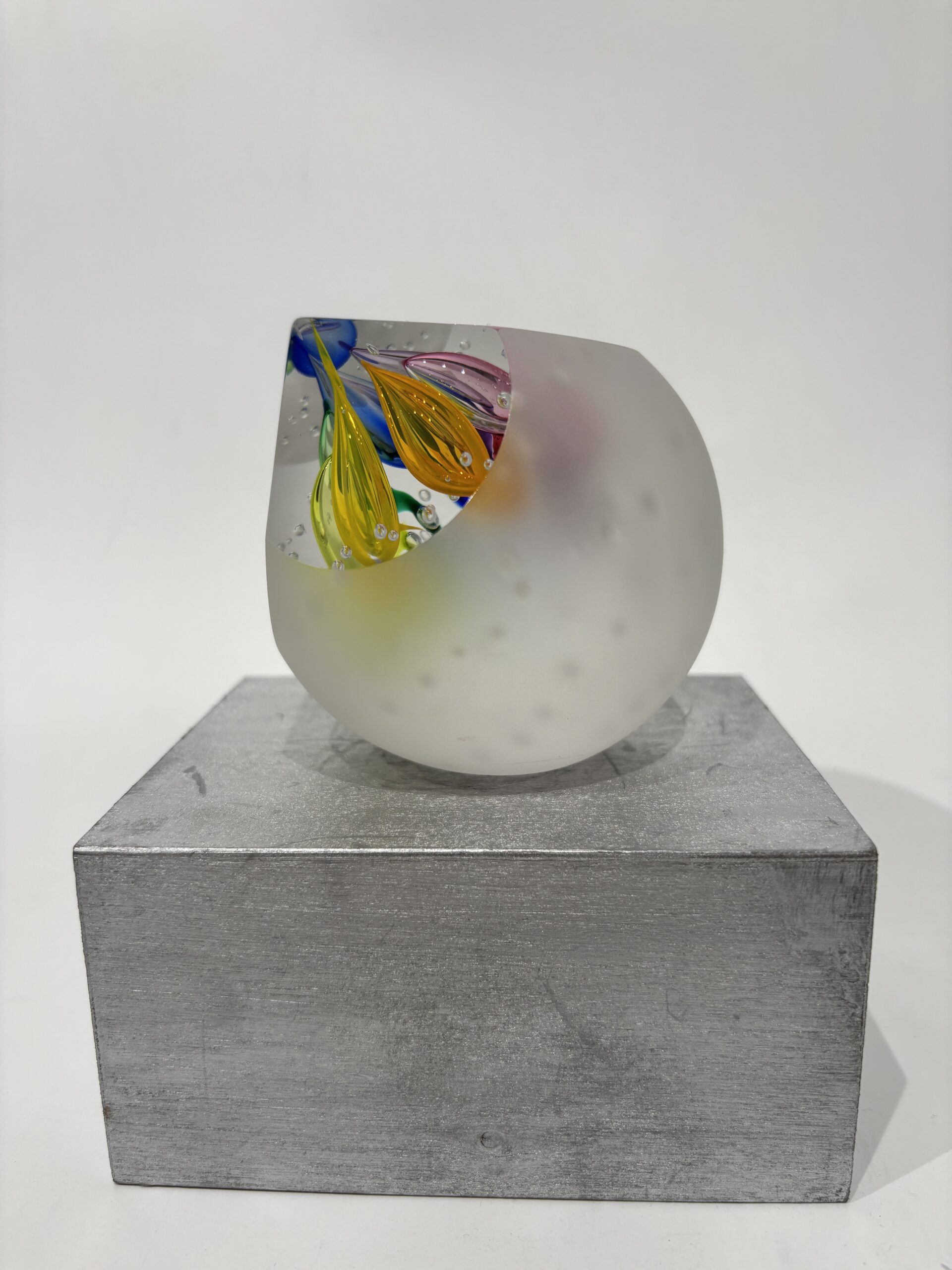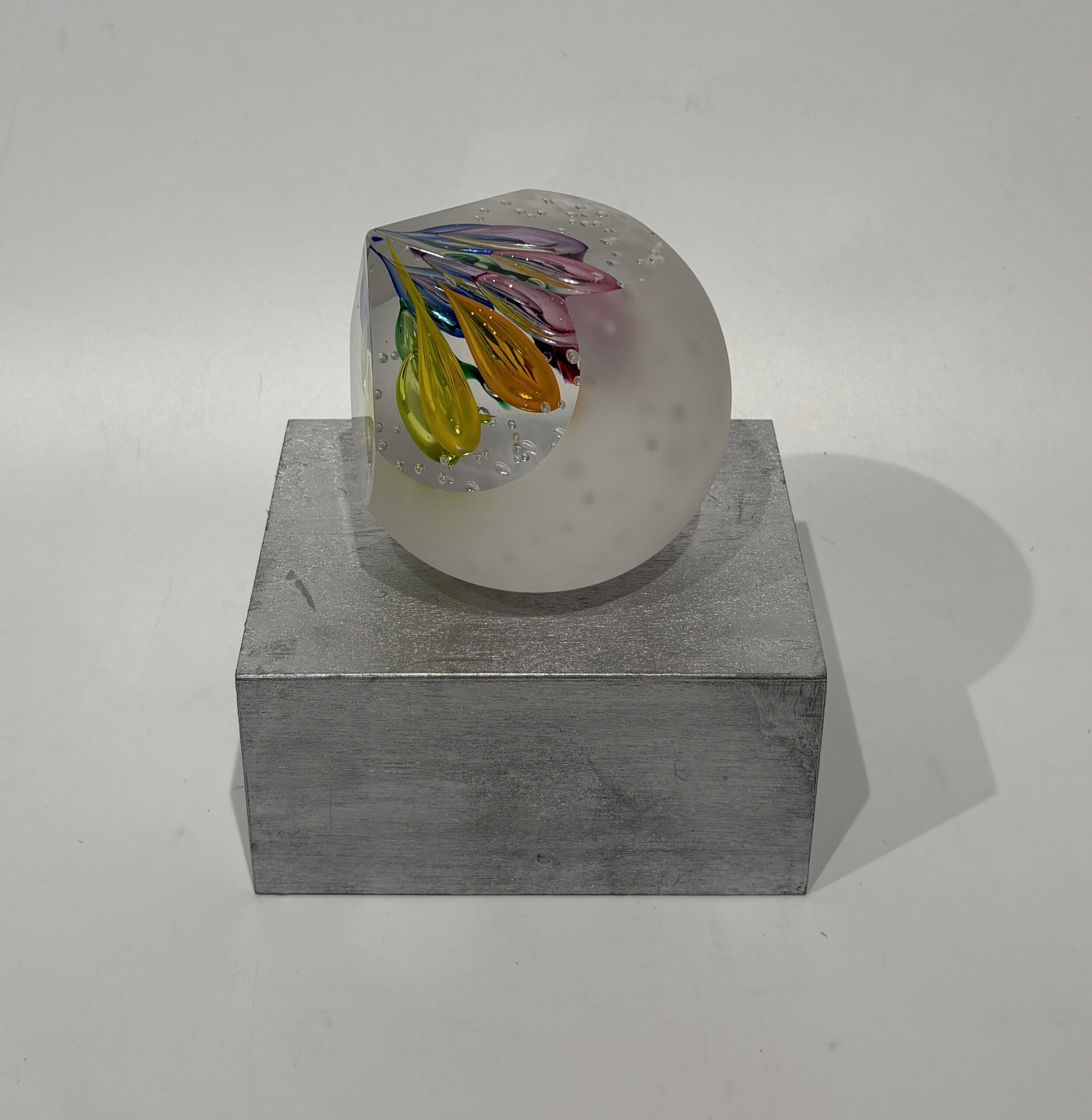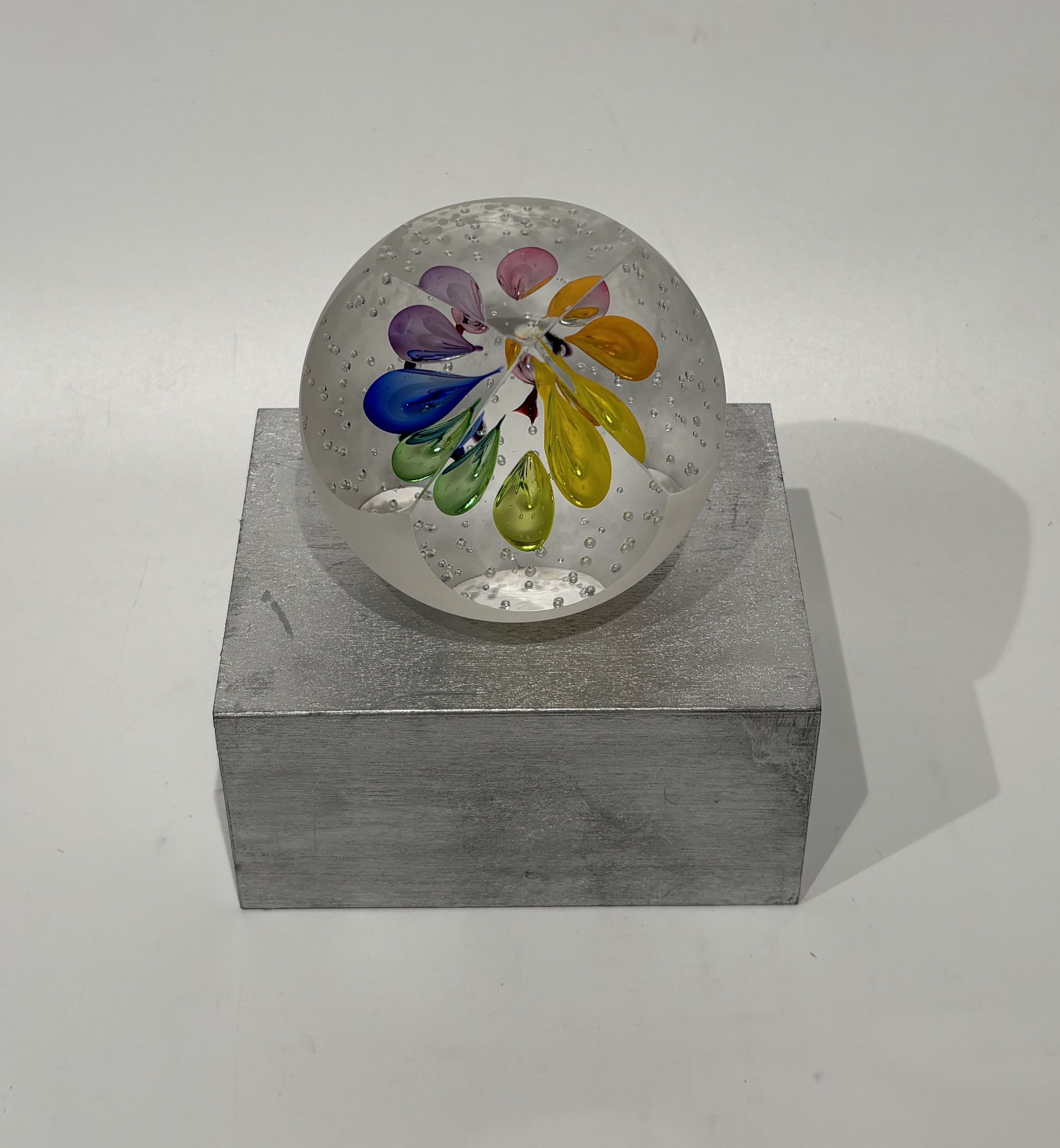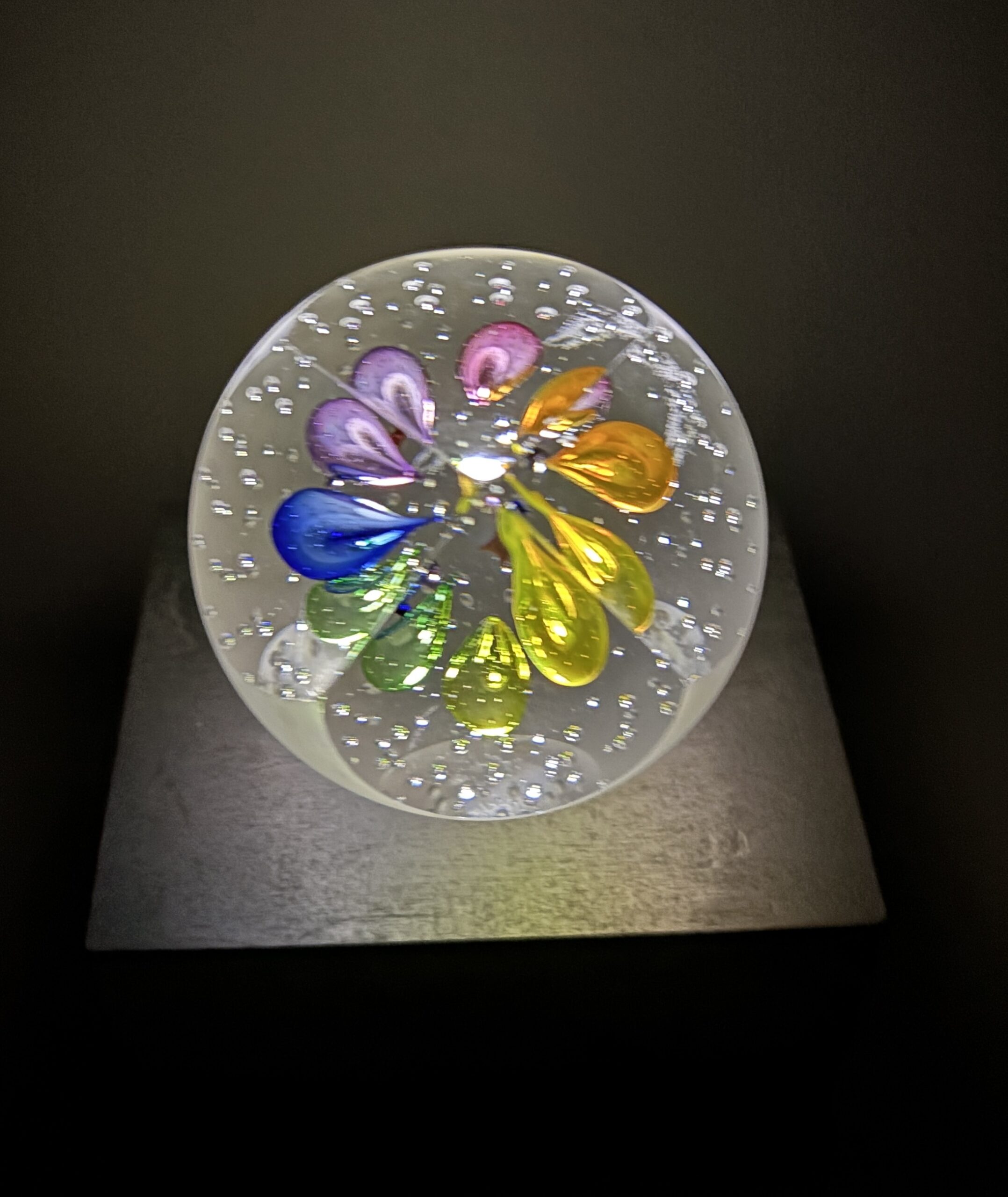 虹7色の泡がガラスの中に入っていてその周りに規則正しい小さな気泡が入っている。外側サンドブラスト加工。ピラミッド型にカットして垂直では無い斜め置き。下の台付き。電池式のLEDライトが付いていて照明の様にもなる。
