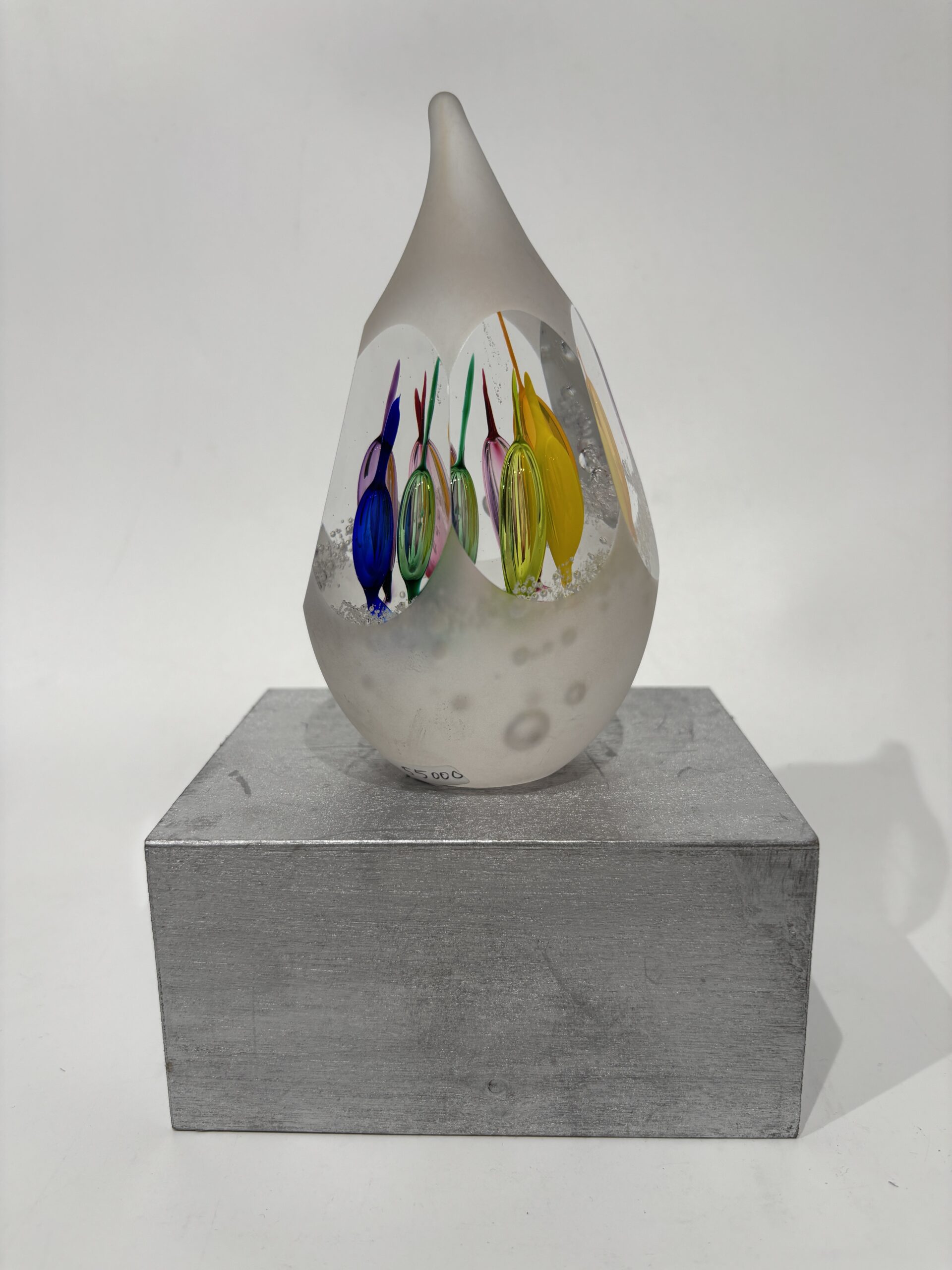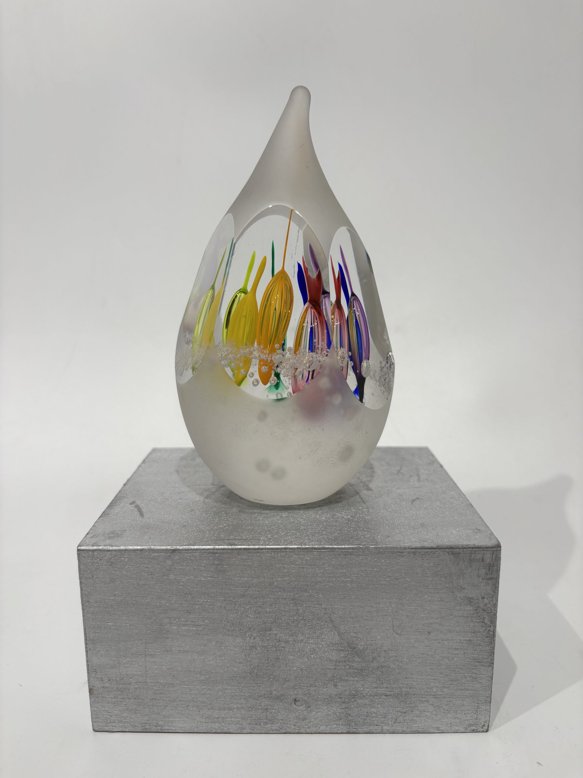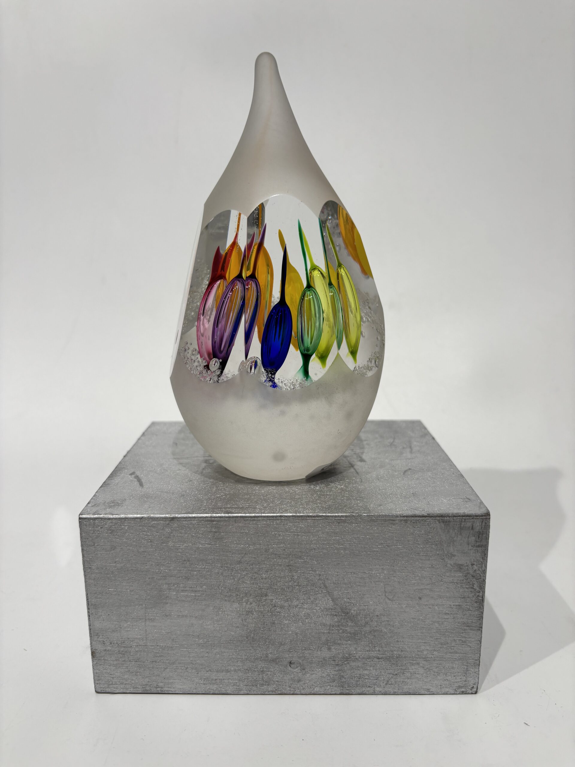 虹7色の泡がガラスの中に入り周りは流動的な気泡が入った球根の形。周りはサンドブラスト加工。カットは7面体。下の台付き。LEDライトが付いていて照明の様にもなる。
