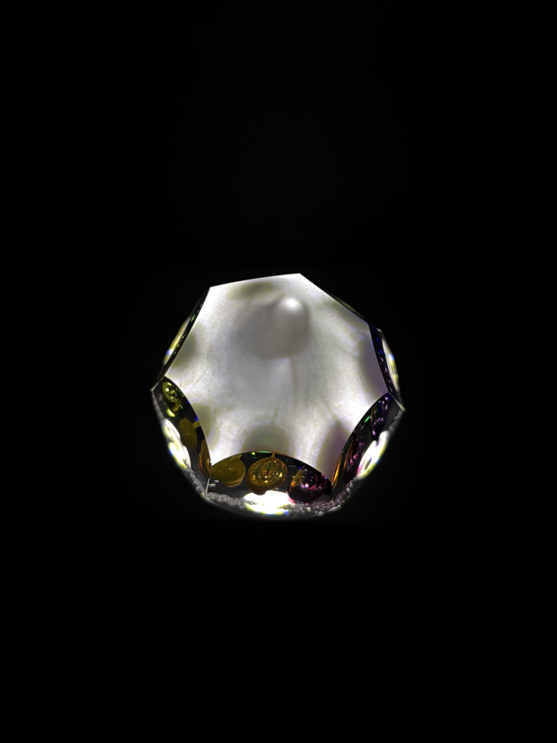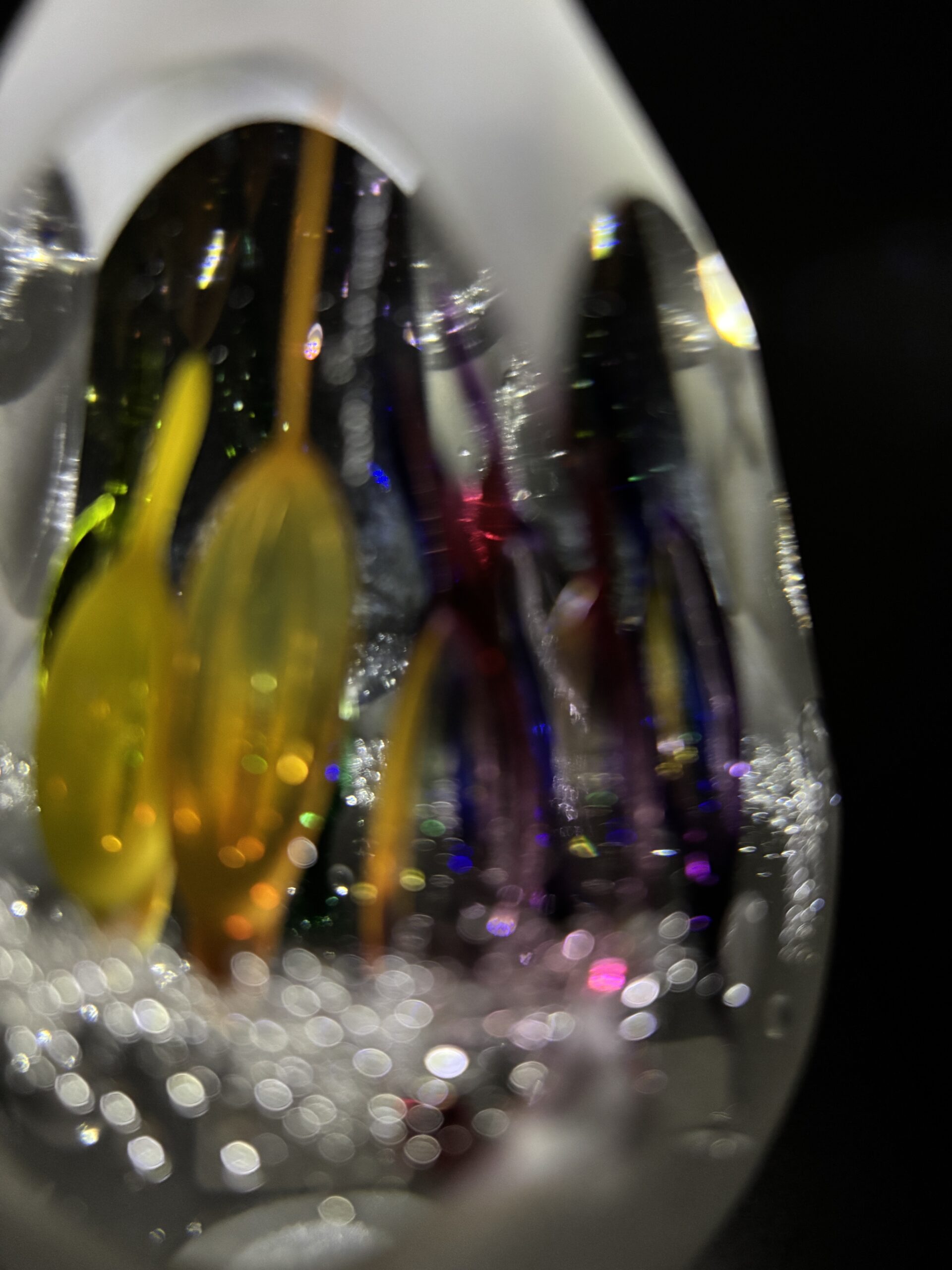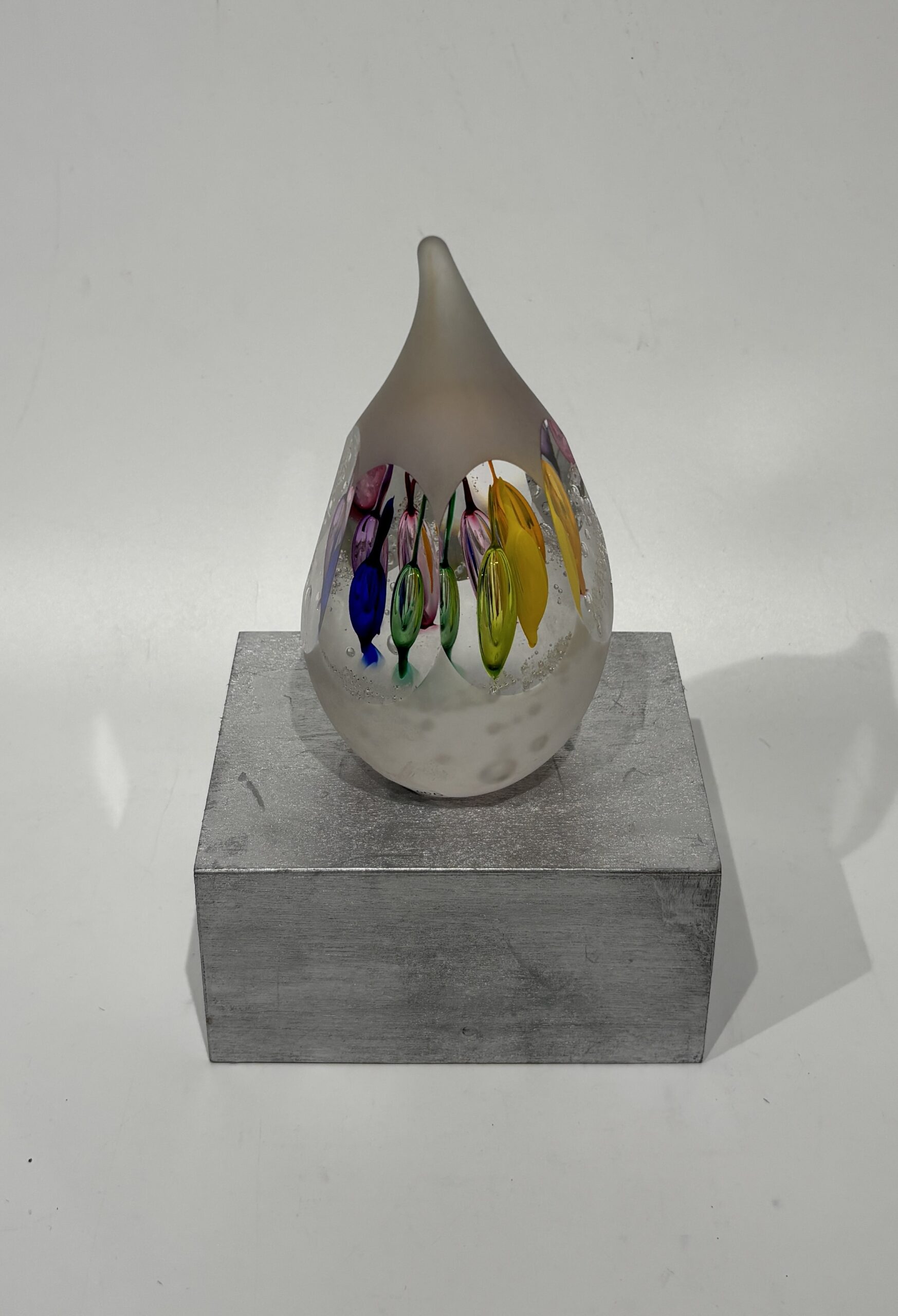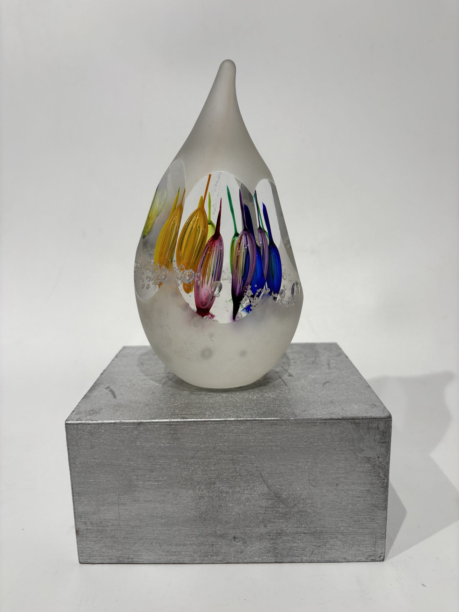 虹7色の泡がガラスの中に入り周りは流動的な気泡が入った球根の形。周りはサンドブラスト加工。カットは7面体。下の台付き。LEDライトが付いていて照明の様にもなる。