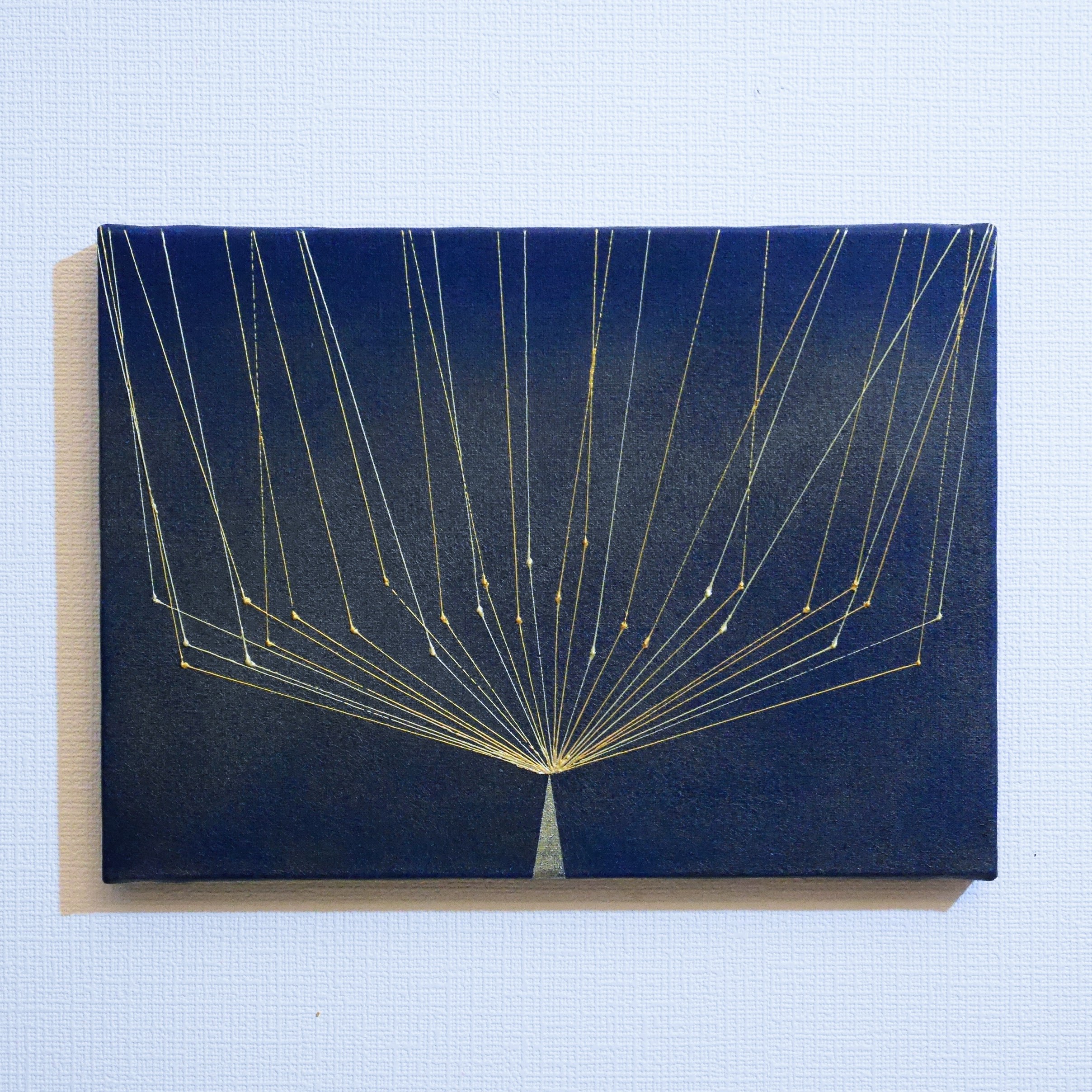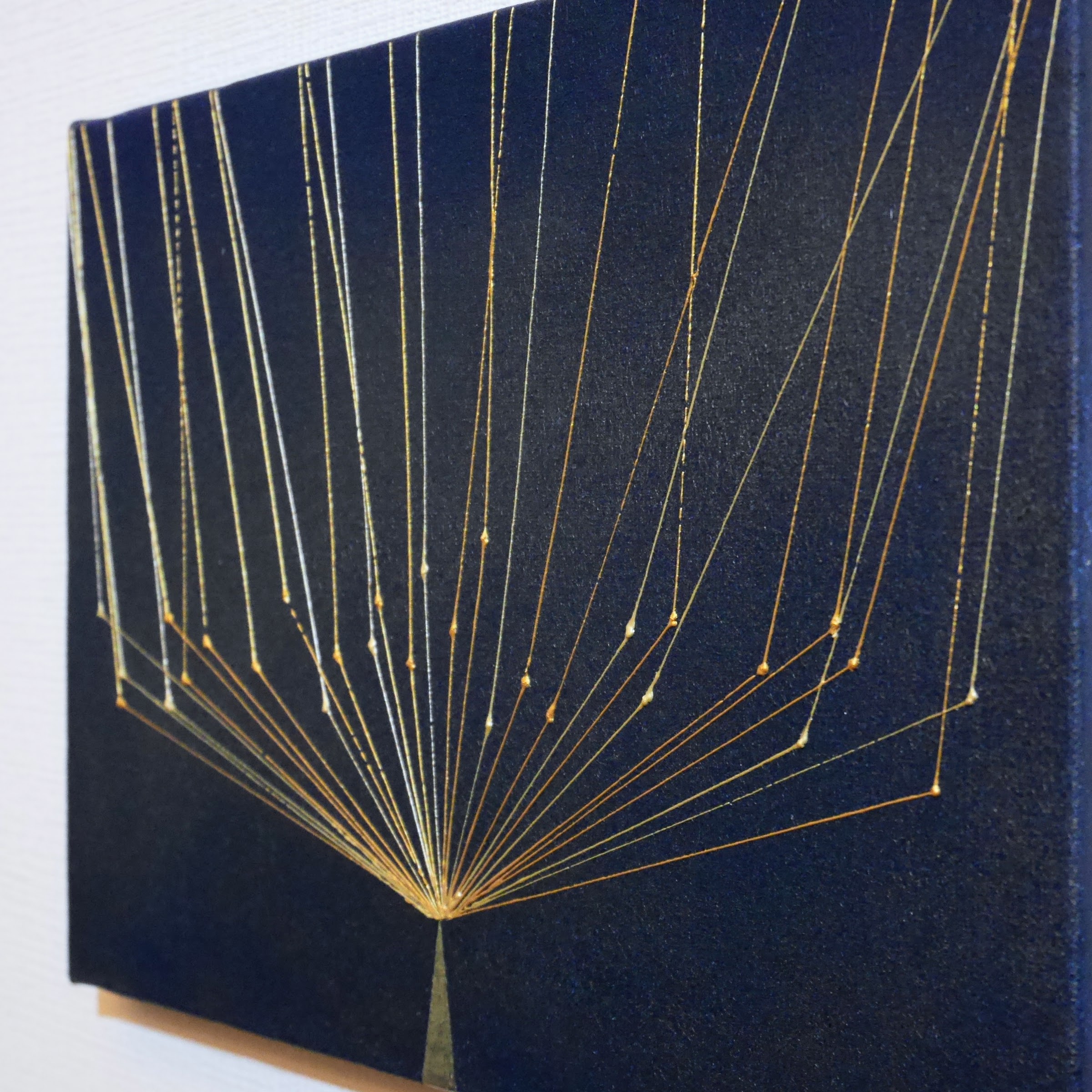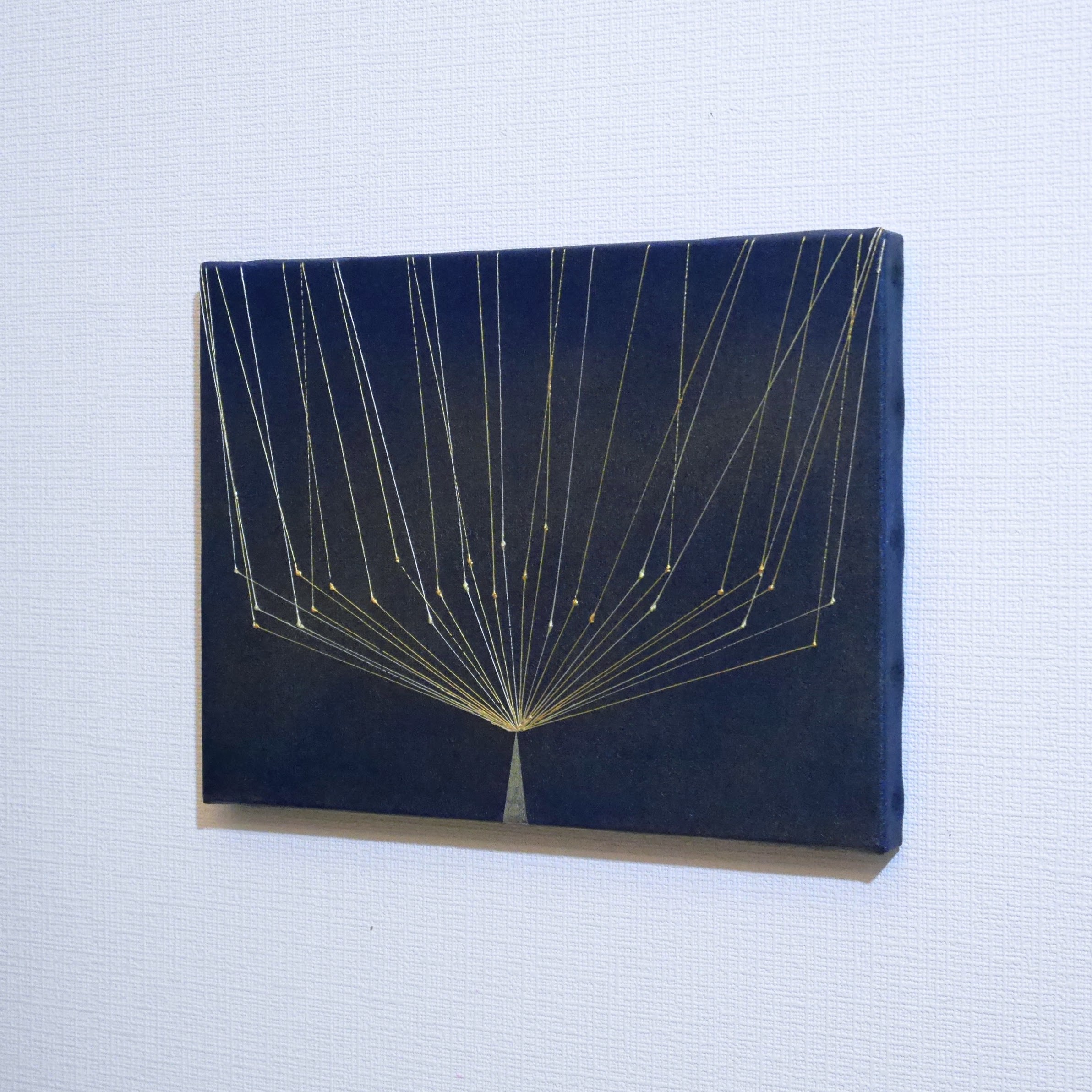 F4サイズのキャンバスに油彩です。 濃紺色の背景に金色の霞がかった靄に、さらに2種類の金色で放射状に描かれた抽象作品です。 古代占星術の始まる頃、天空の星々を眺めて願いを/祈りを宙に放ったであろう「術」を抽象作品として制作しました。 遠い昔の澄んだ夜空に想いをはせて。