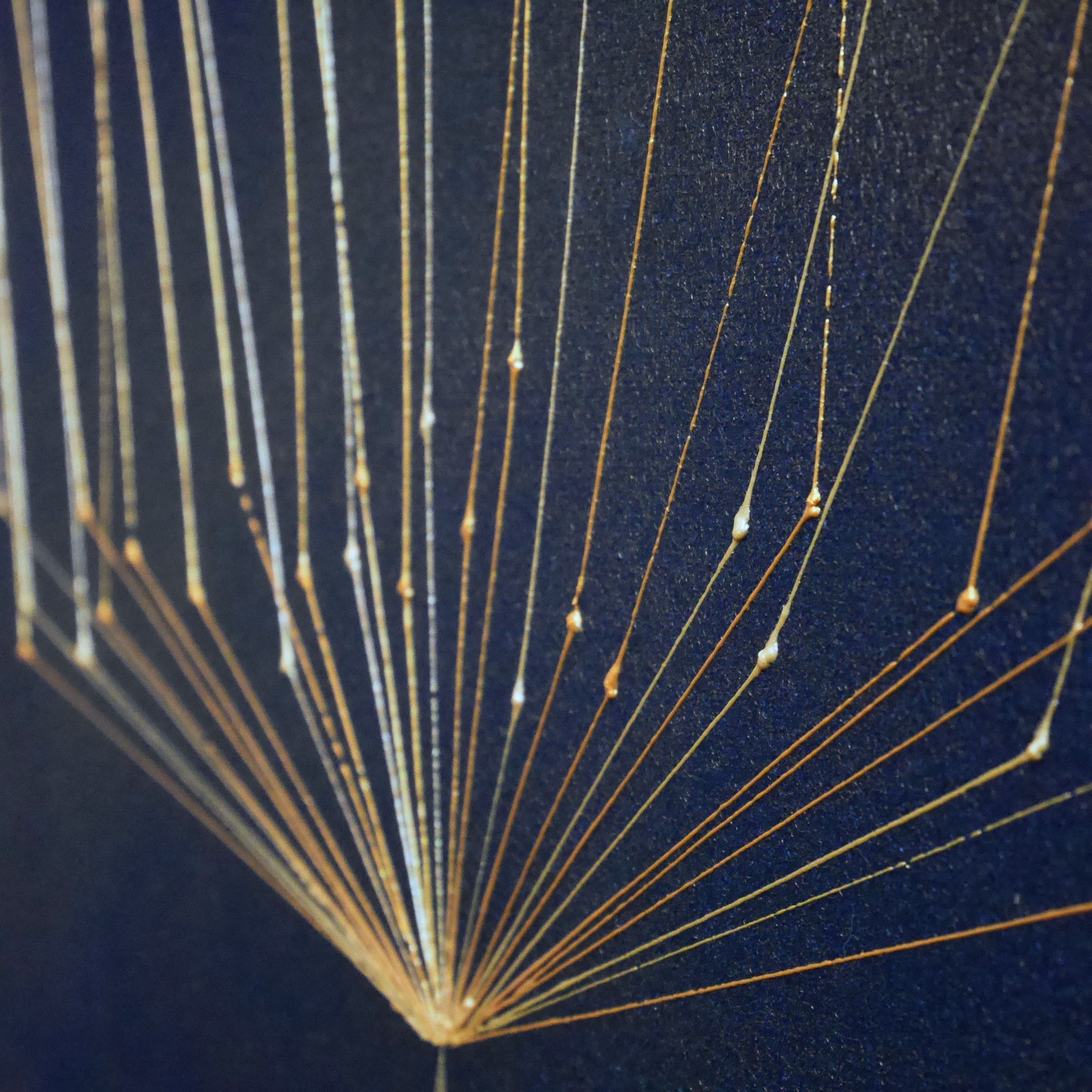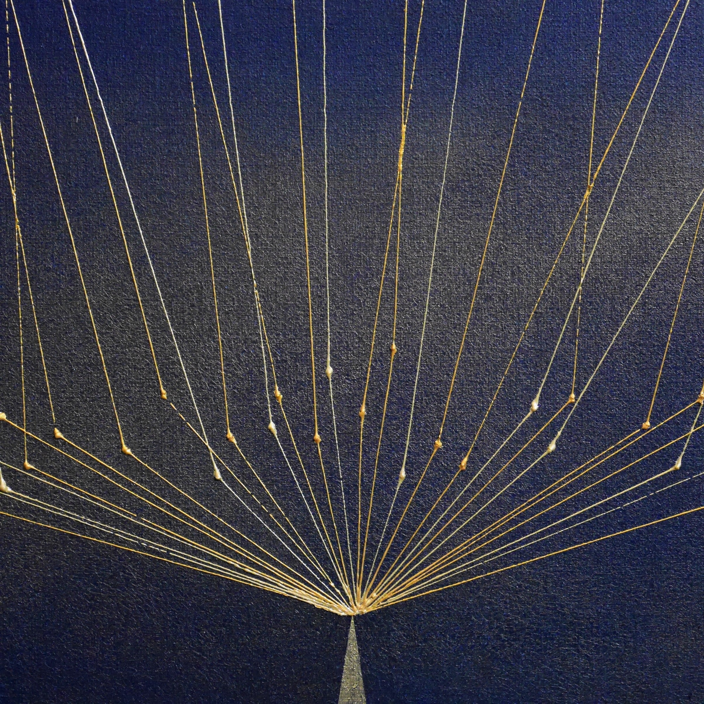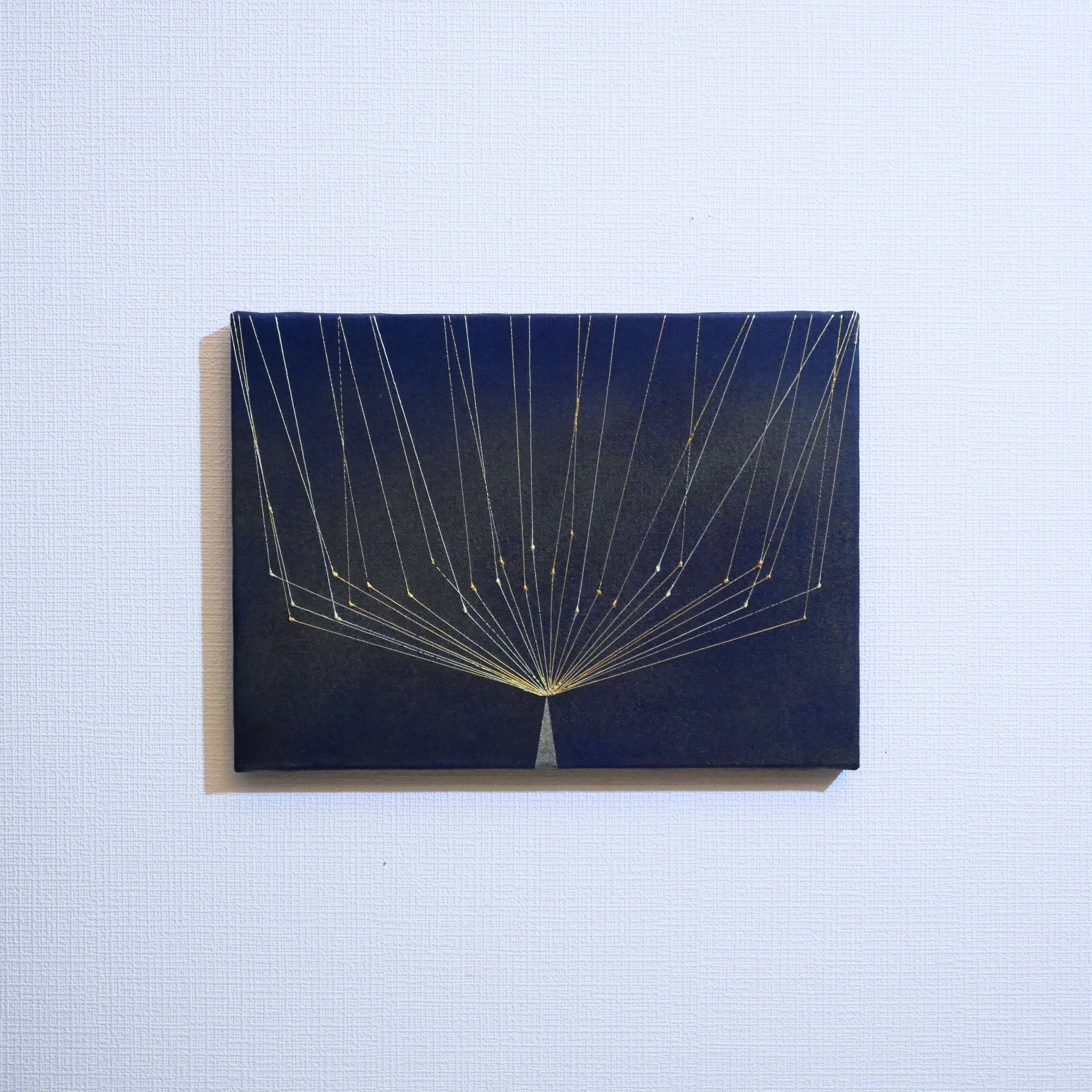 F4サイズのキャンバスに油彩です。 濃紺色の背景に金色の霞がかった靄に、さらに2種類の金色で放射状に描かれた抽象作品です。 古代占星術の始まる頃、天空の星々を眺めて願いを/祈りを宙に放ったであろう「術」を抽象作品として制作しました。 遠い昔の澄んだ夜空に想いをはせて。